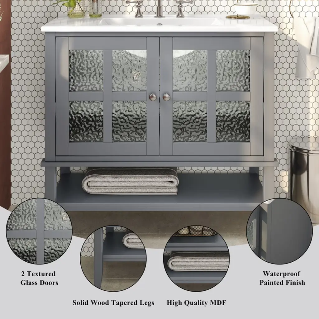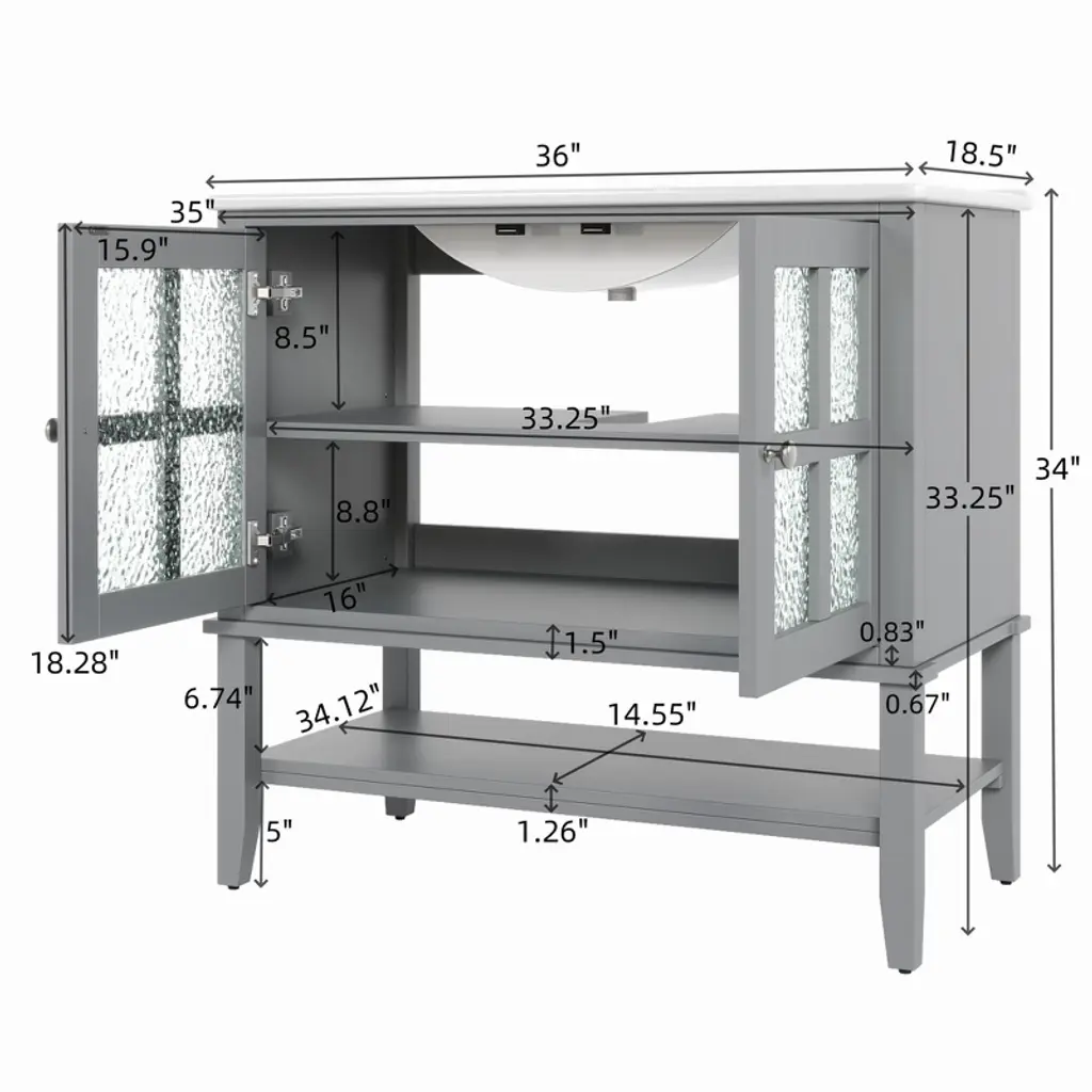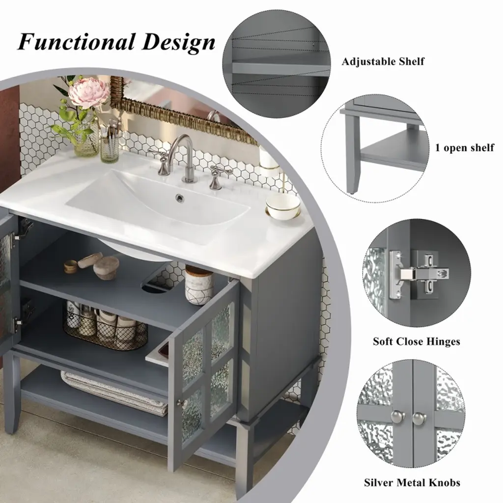 Elevate your bathroom space with this elegant 36" Bathroom Vanity featuring a seamless ceramic sink. Crafted for durability, the solid wood and MDF construction, along with its stylish gray waterproof painted finish, guarantees that this vanity remains untouched by humidity. Offering practical features such as an adjustable shelf and open storage space, it combines functionality with aesthetic appeal. The exquisite details of textured glass doors, silver metal knobs, and soft-close hinges add a touch of luxury to your decor. Perfect for any modern or classic setting, this versatile vanity provides both style and substance for your everyday needs.