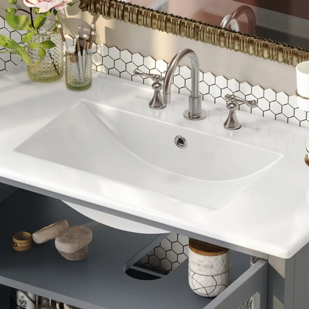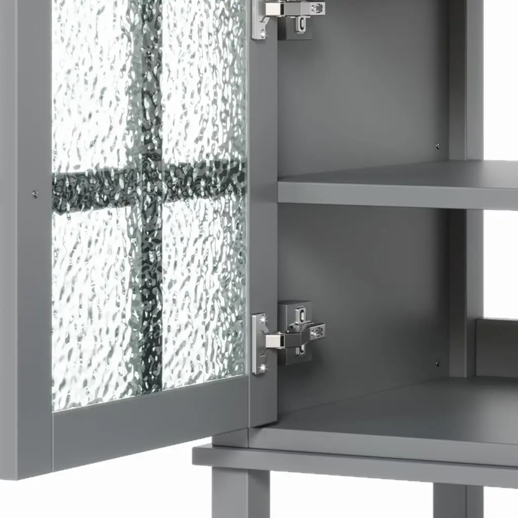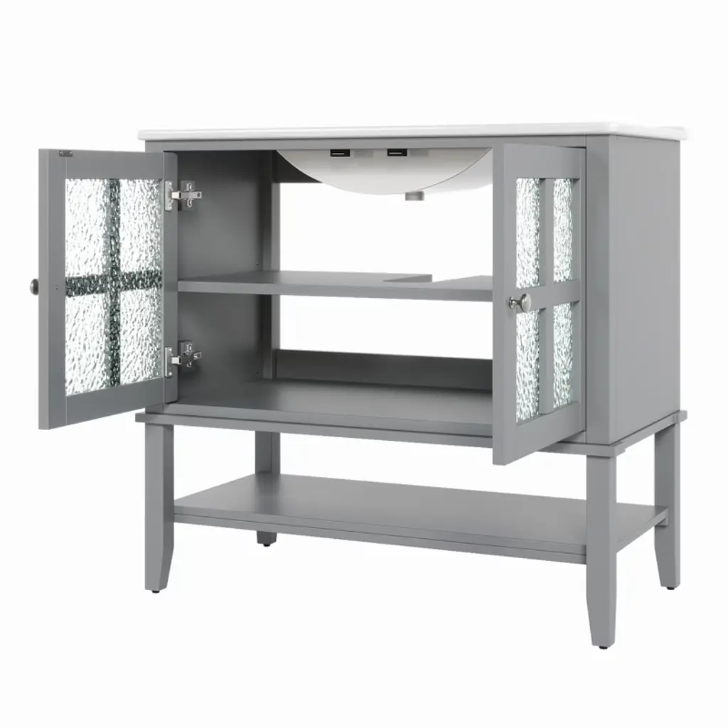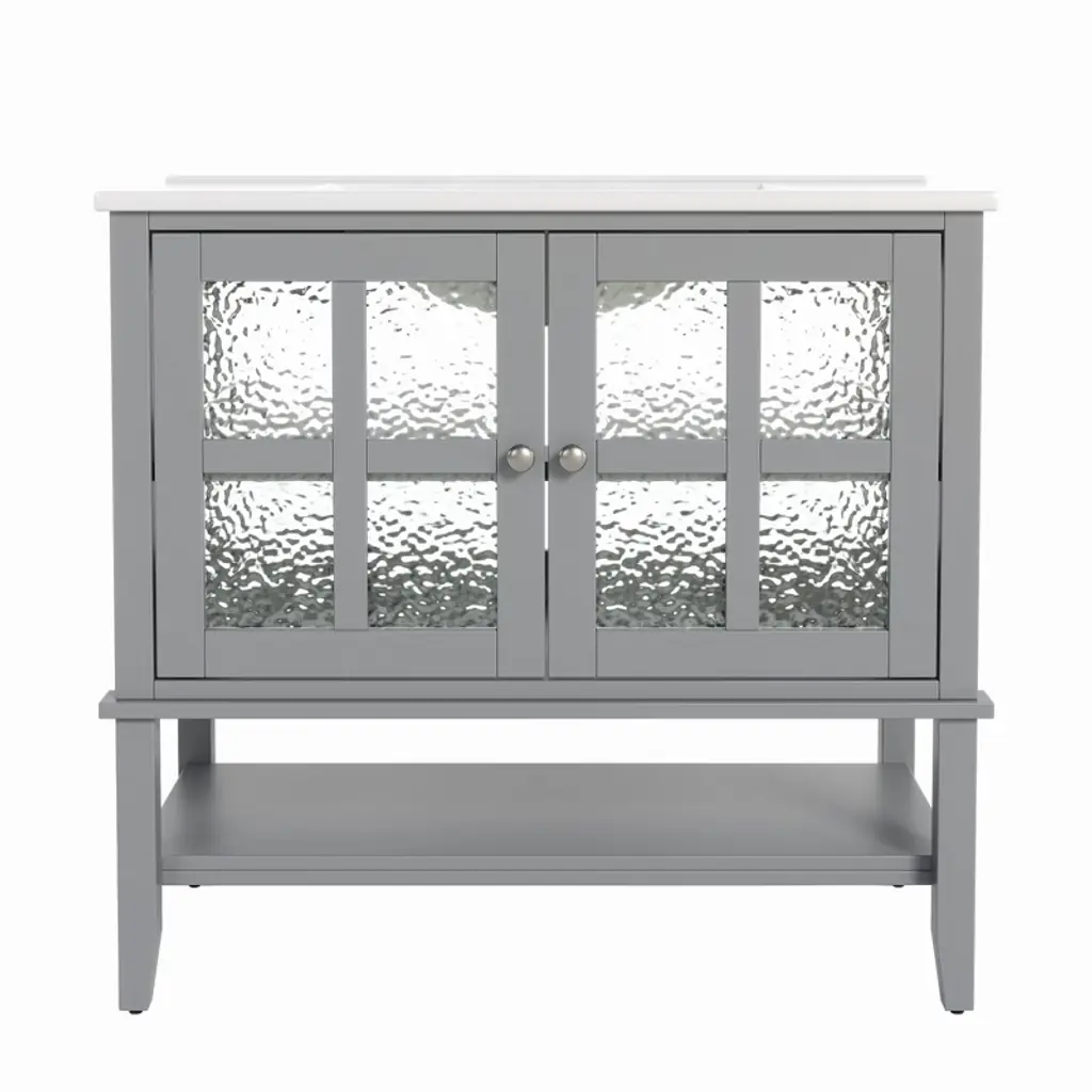 Elevate your bathroom space with this elegant 36" Bathroom Vanity featuring a seamless ceramic sink. Crafted for durability, the solid wood and MDF construction, along with its stylish gray waterproof painted finish, guarantees that this vanity remains untouched by humidity. Offering practical features such as an adjustable shelf and open storage space, it combines functionality with aesthetic appeal. The exquisite details of textured glass doors, silver metal knobs, and soft-close hinges add a touch of luxury to your decor. Perfect for any modern or classic setting, this versatile vanity provides both style and substance for your everyday needs.