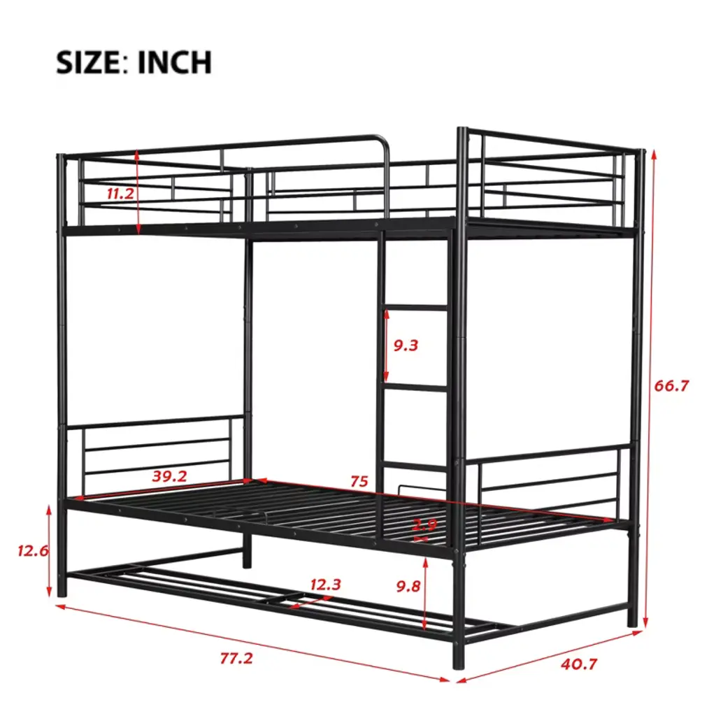 This twin over twin metal bunk bed is made with sturdy metal and has a clean-cut silhouette that can be matched with any room decor. Designed with safety in mind, this bunk bed comes with a ladder integrated into the frame that is easy to climb up and down. With a practical design, this versatile bunk bed can be separated into two twin beds to meet your different needs.The shelf underneath the bunk bed creates extra space for you to stock shoes, boxes, toys or any small items you like. Some assembly is required, and the bed will definitely be assembled conveniently.