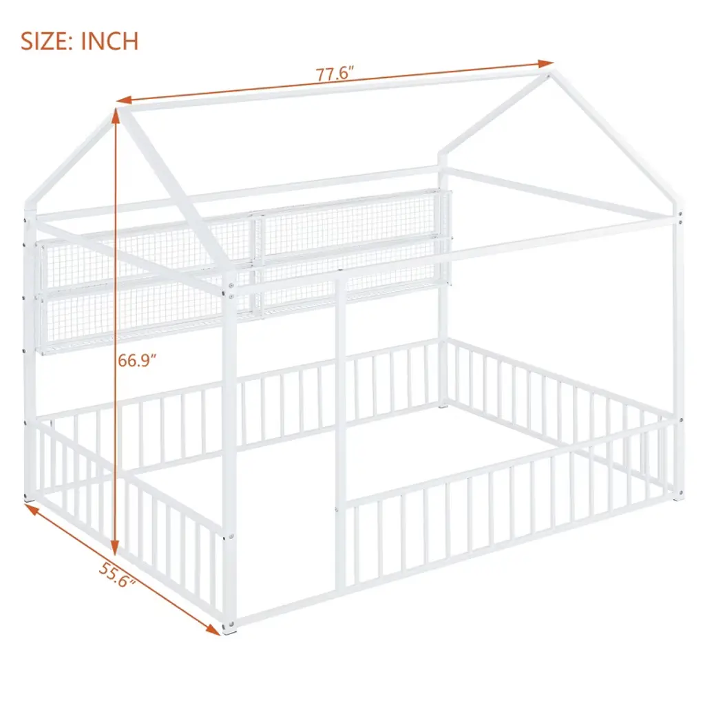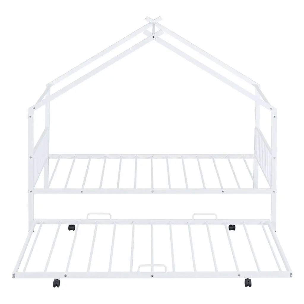 This stylish metal bed frame features a unique house-shaped design, adding a playful yet modern touch to any bedroom. With sturdy metal construction, it ensures long-lasting durability and a secure night's sleep. The back of the bed is equipped with four convenient metal grid shelves, providing extra storage for your essentials while maximizing space. This bed frame blends functionality with a whimsical design, making it a standout piece in any room.