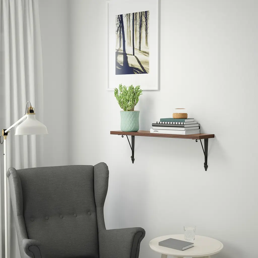 BERGSHULT / KROKSHULT Wall shelf - walnut effect/anthracite 31 1/2x7 7/8 ". The wall shelf has one bevelled and one smooth edge on the long side, so you can choose the side you want facing the room depending on which of the two different styles you like the most. Screws are not included.