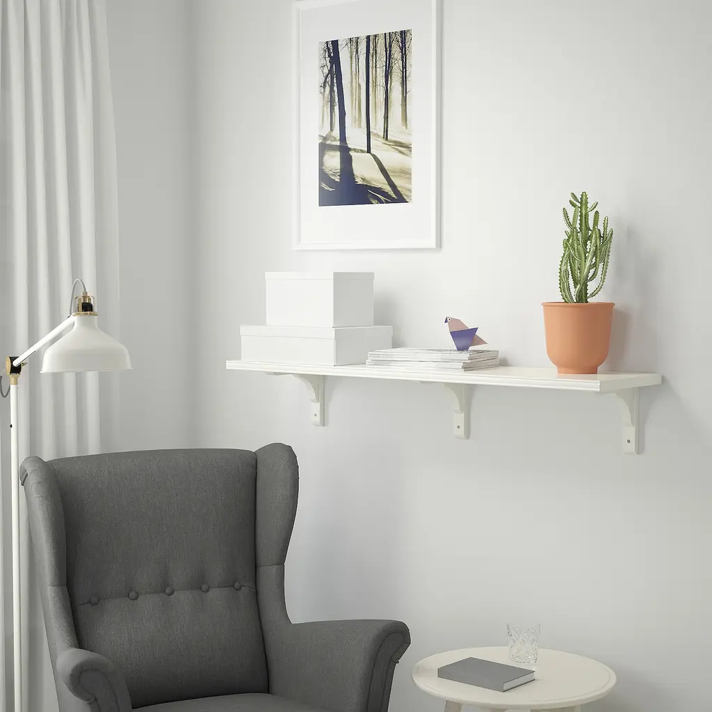 BERGSHULT / RAMSHULT Wall shelf - white 47 1/4x11 3/4 ". The wall shelf has one bevelled and one smooth edge on the long side, so you can choose the side you want facing the room depending on which of the two different styles you like the most. Screws are not included.