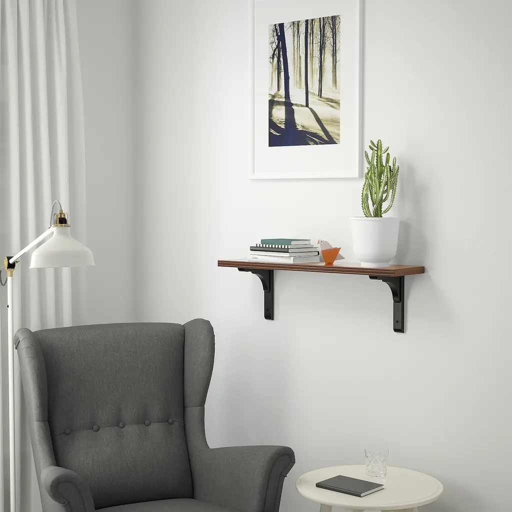 BERGSHULT Shelf - walnut effect 31 1/2x7 7/8 ". The wall shelf has one bevelled and one smooth edge on the long side, so you can choose the side you want facing the room depending on which of the two different styles you like the most. Brackets are sold separately. Screws are not included.