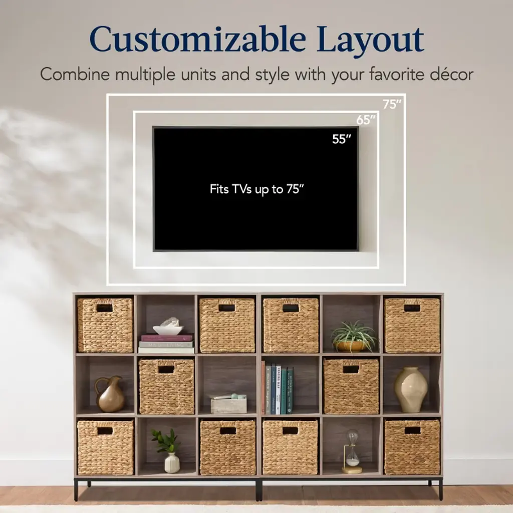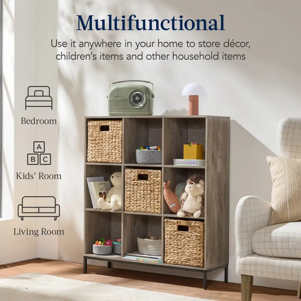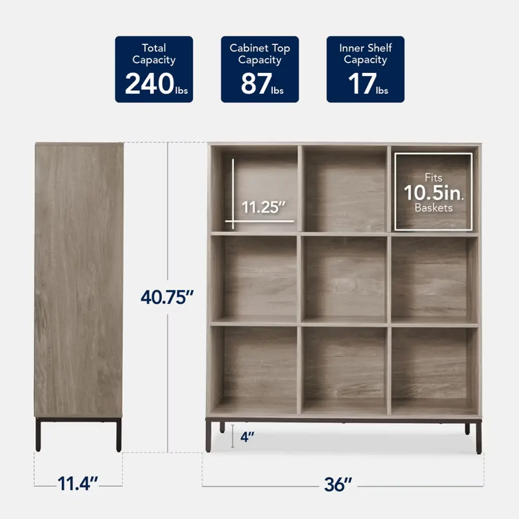 Elevate your living space with this versatile organizer, designed to fit seamlessly in any room while beautifully displaying your favorite books, decor, and toys. Its customizable layout allows you to connect multiple units for a cohesive look or style them individually, while optional back panels provide the choice of an open design or a finished appearance. With nine spacious square shelf openings that perfectly fit 10.5-inch baskets, keeping your items organized and accessible is a breeze. Crafted from durable engineered wood with sturdy metal legs, this stylish piece not only enhances your decor but also supports a substantial weight capacity, making it the perfect addition to a clutter-free home.