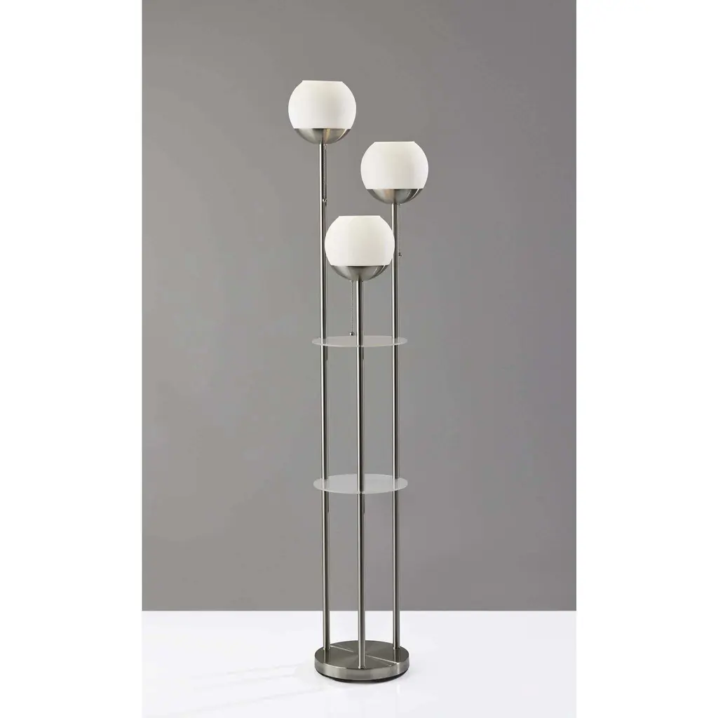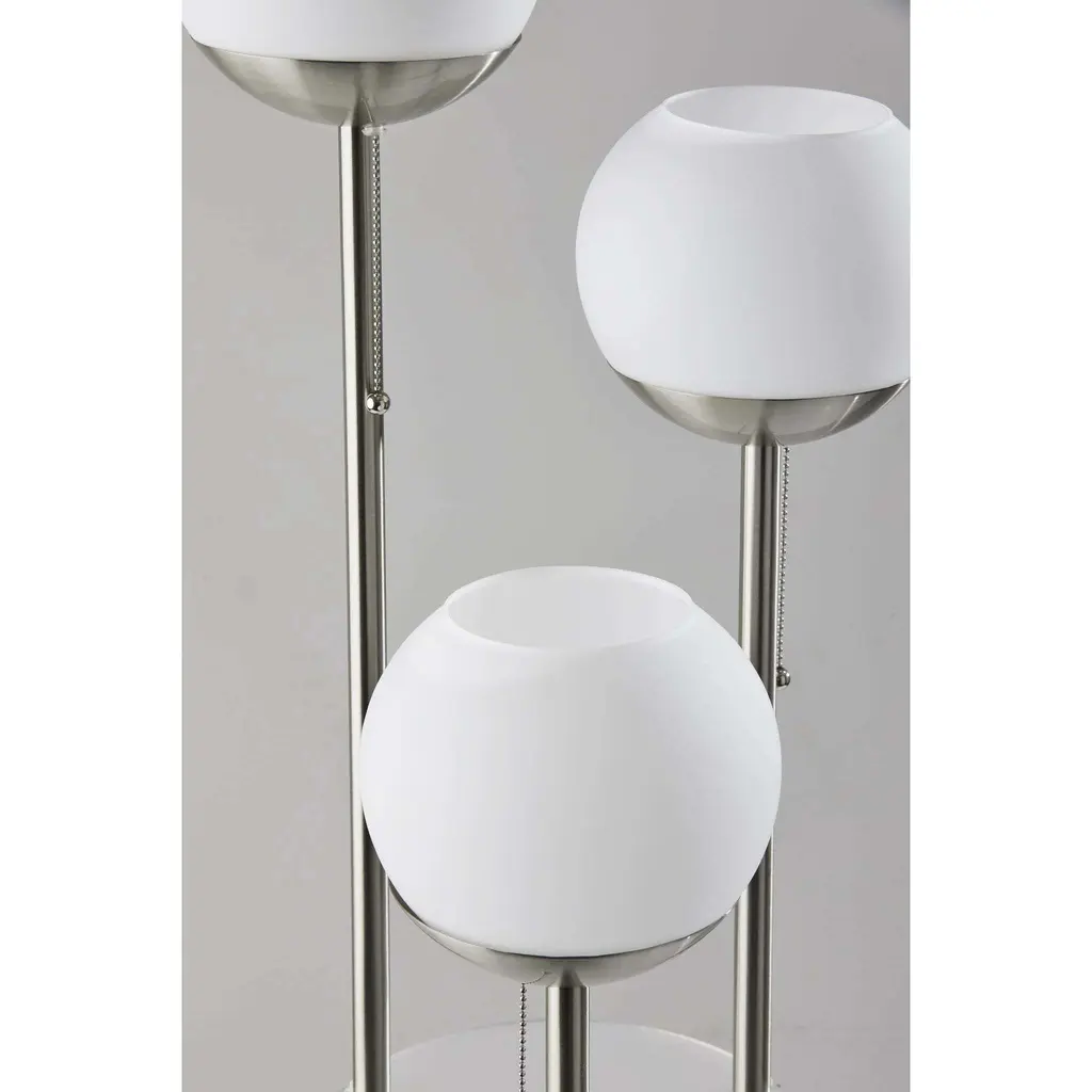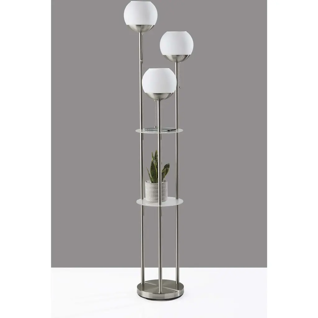 Bring a blend of style and function to your space with the 63" Bianca floor lamp. Featuring two 10" round frosted acrylic shelves, this lamp provides storage and display opportunities. The bottom shelf has a clearance of 34.75", making it a perfect place to display vases, picture frames, or other taller items, while the 20" clearance for the top shelf makes it ideal for placing drink glasses, phones, or other smaller pieces. The 10" metal base with a brushed steel finish makes for a sturdy design, while the three brushed steel poles arranged in a triangular pattern rise cleanly to three lighting heads of varying heights for an eye-catching design. The three 7" globe shades are made of white opal glass that complement the shelving and can be operated separately with pull chains, allowing you to control the amount of lighting. Each of the three globe shades ensconce 40W bulbs (not included), while the lamp also features a 5' clear cord. The Bianca floor lamp is also available with an antique brass finish.