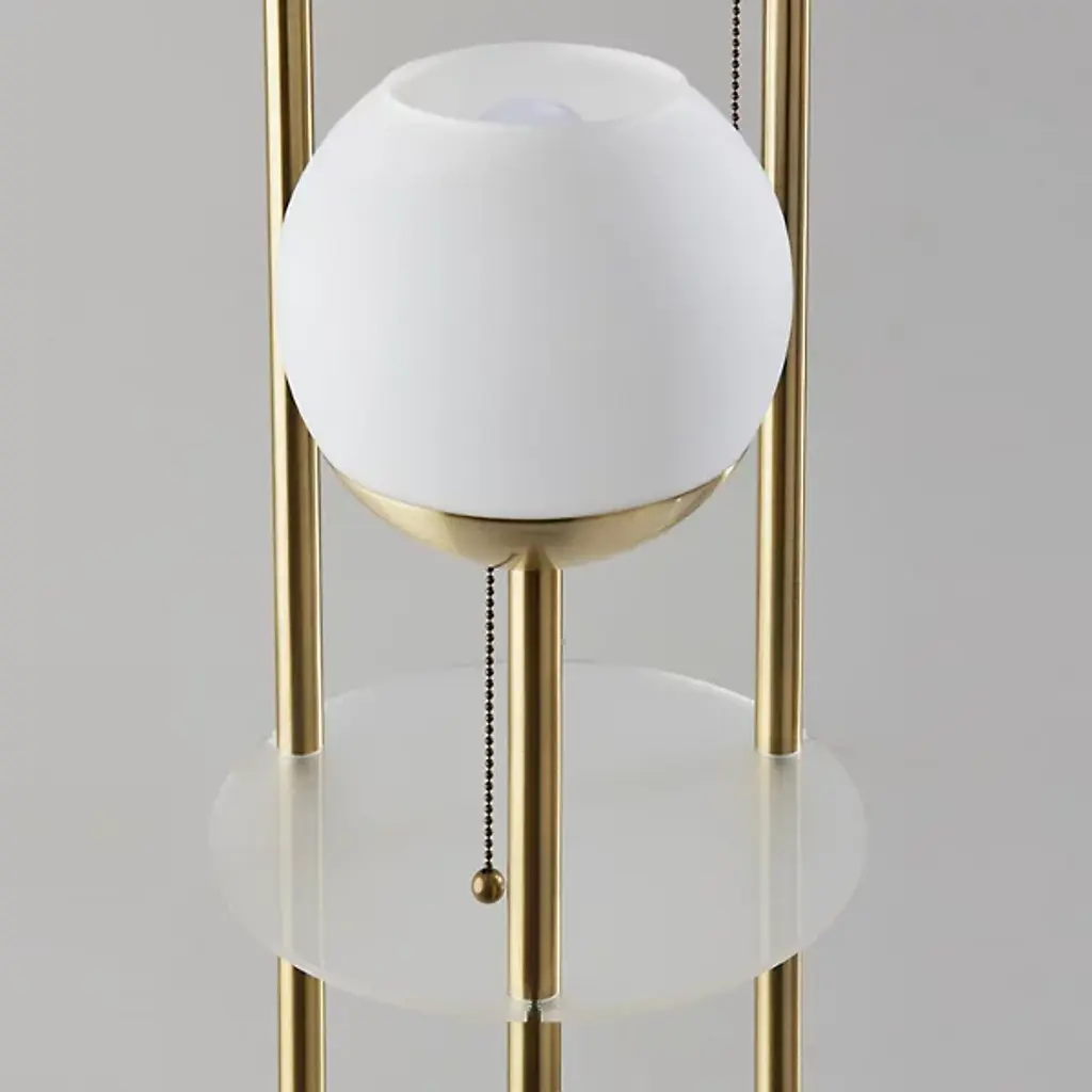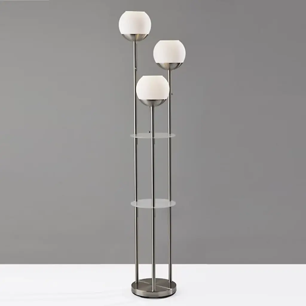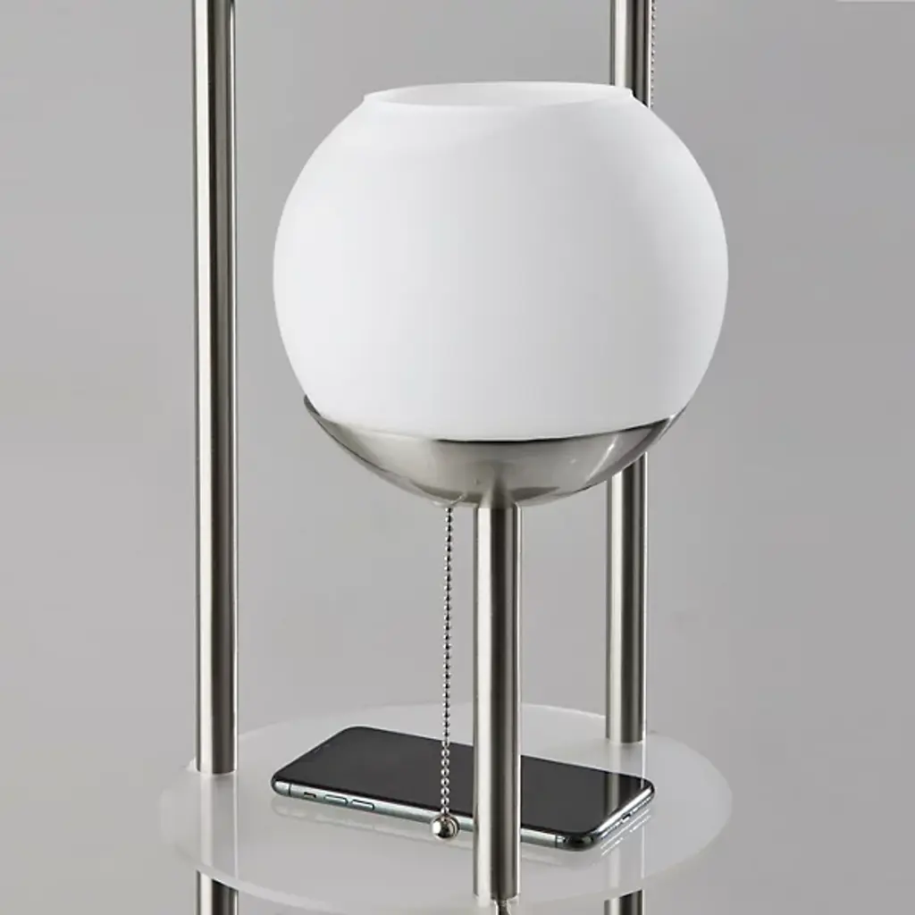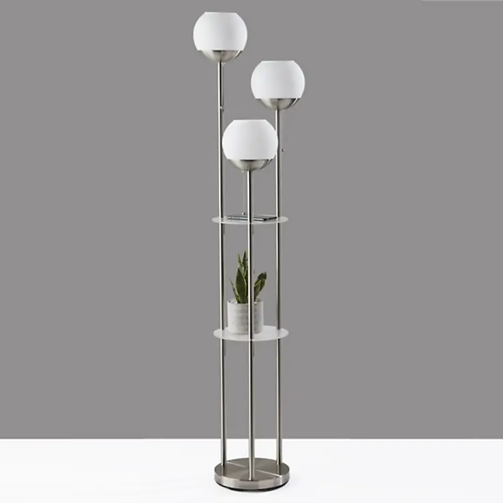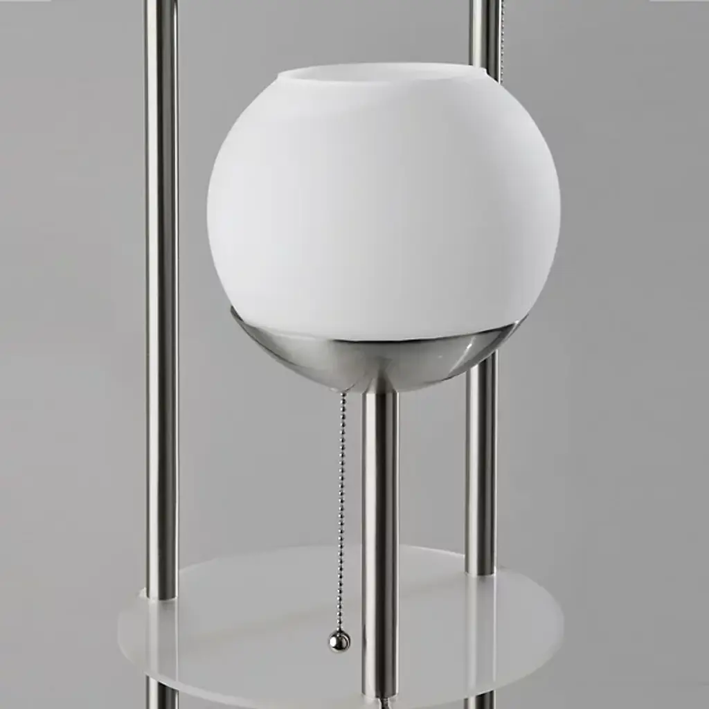 Accentuate the personality of your room with the Bianca Shelf Floor Lamp from Adesso. A pair of frosted acrylic shelves set an elegant stage for your charming objects. The discs draw your eyes as they appear to float in the air. Triangulating metal poles hold the discs as they create a clean, upsurging silhouette. For a glare-free lighting experience, white opal glass globe shades cover the bulbs in mid-century modern fashion. Elegant pull chains on each globe let you tailor the light to the desired mood. Clicking the globes on creates an inviting ambient glow and a warm glaze on the objects below.