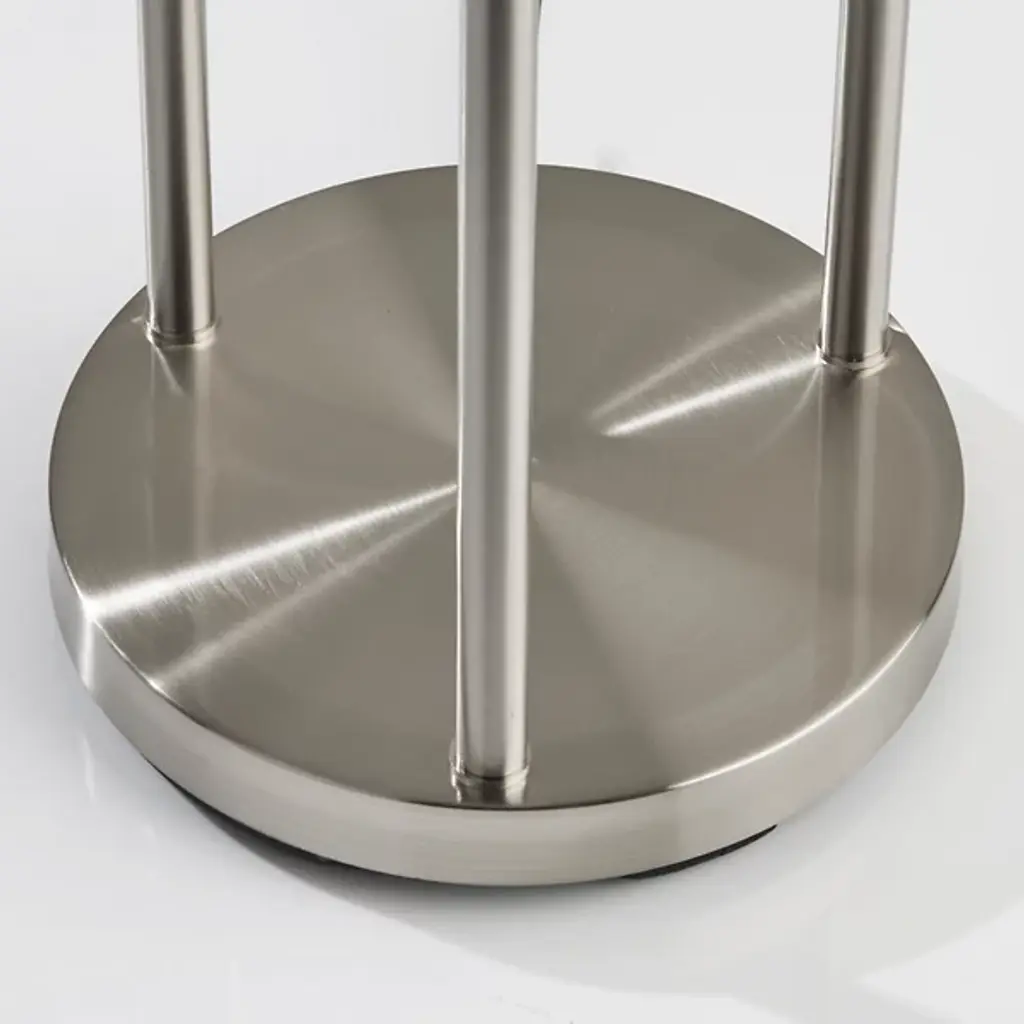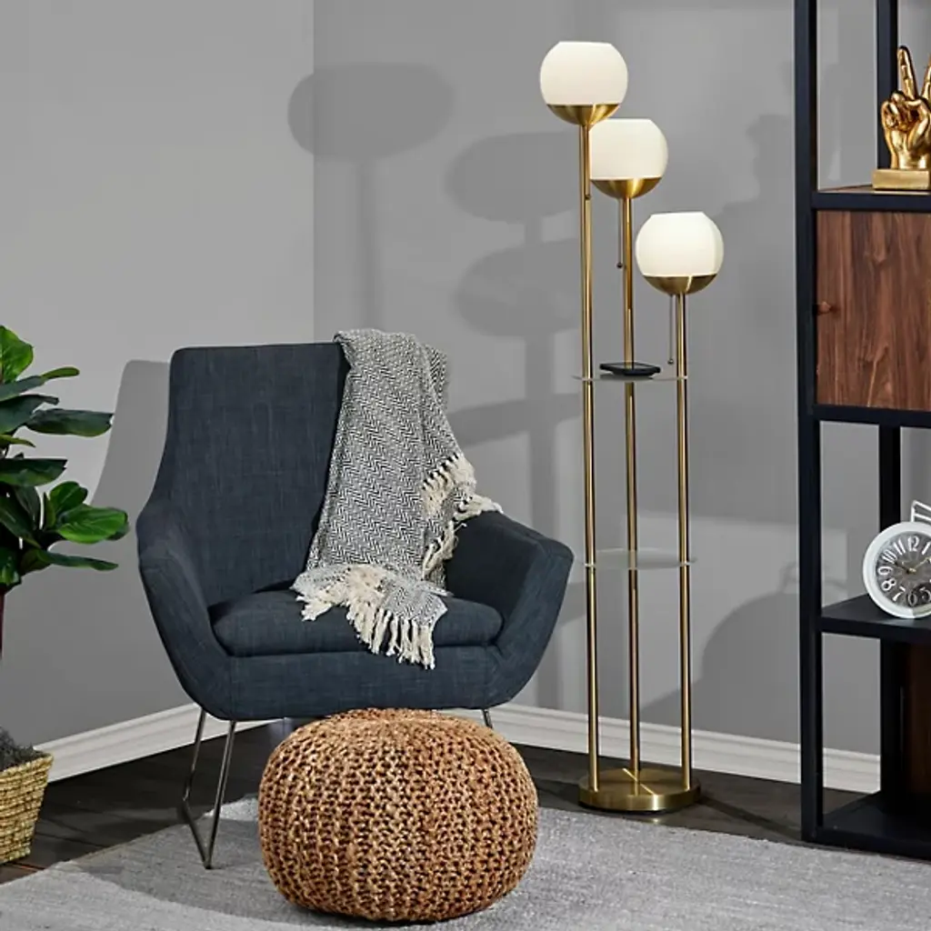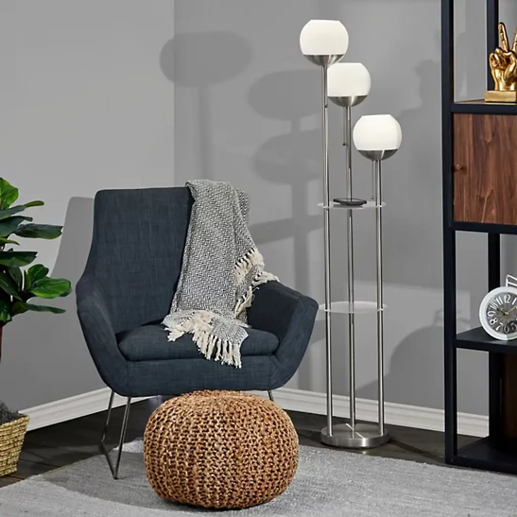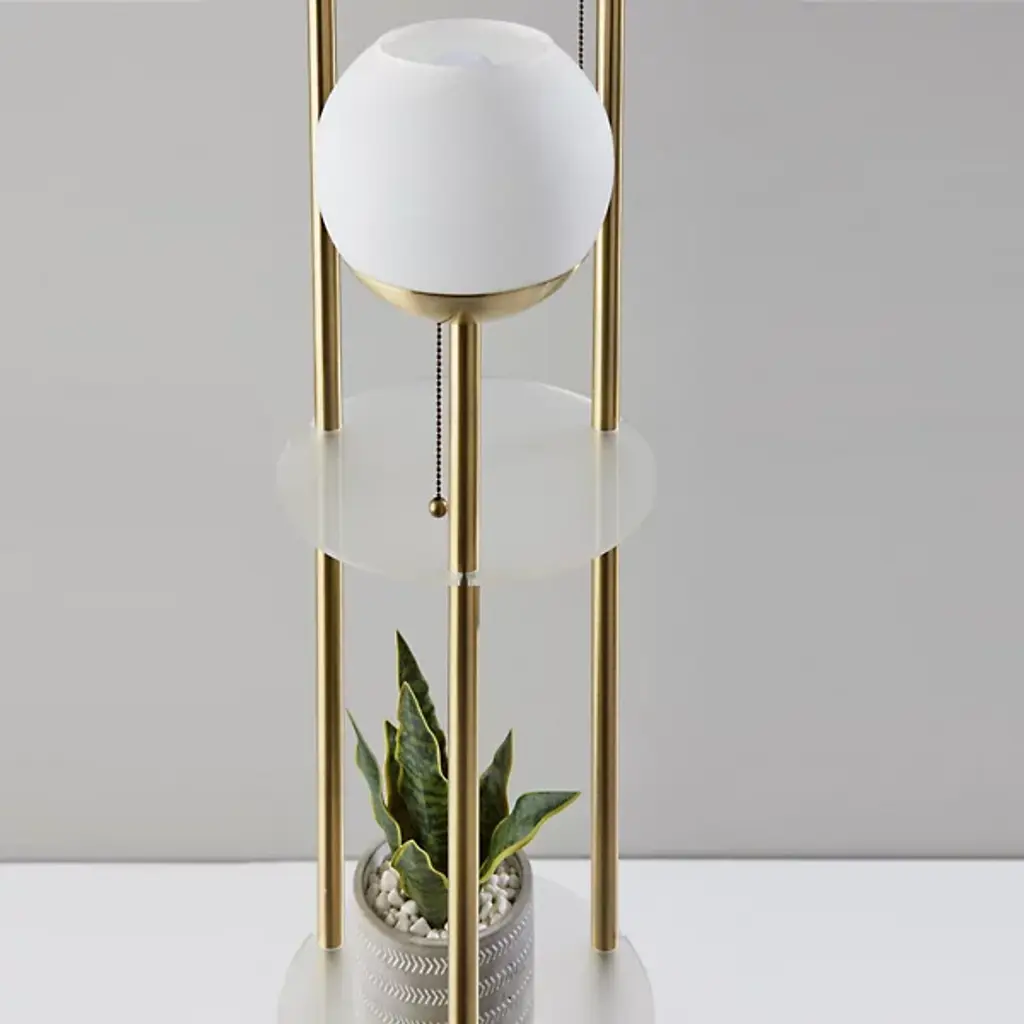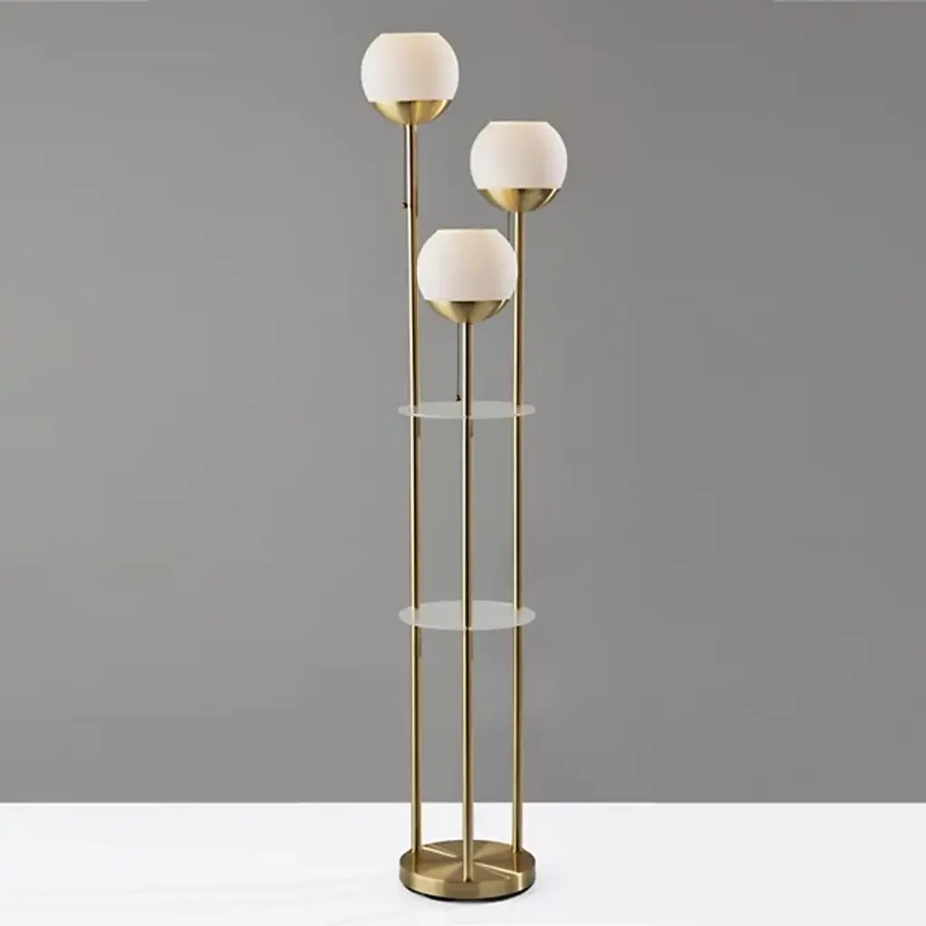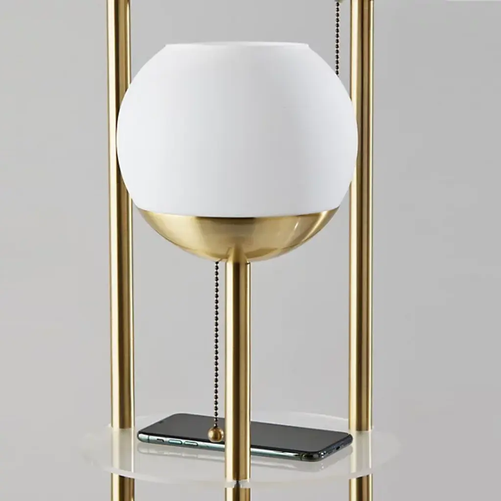Accentuate the personality of your room with the Bianca Shelf Floor Lamp from Adesso. A pair of frosted acrylic shelves set an elegant stage for your charming objects. The discs draw your eyes as they appear to float in the air. Triangulating metal poles hold the discs as they create a clean, upsurging silhouette. For a glare-free lighting experience, white opal glass globe shades cover the bulbs in mid-century modern fashion. Elegant pull chains on each globe let you tailor the light to the desired mood. Clicking the globes on creates an inviting ambient glow and a warm glaze on the objects below.