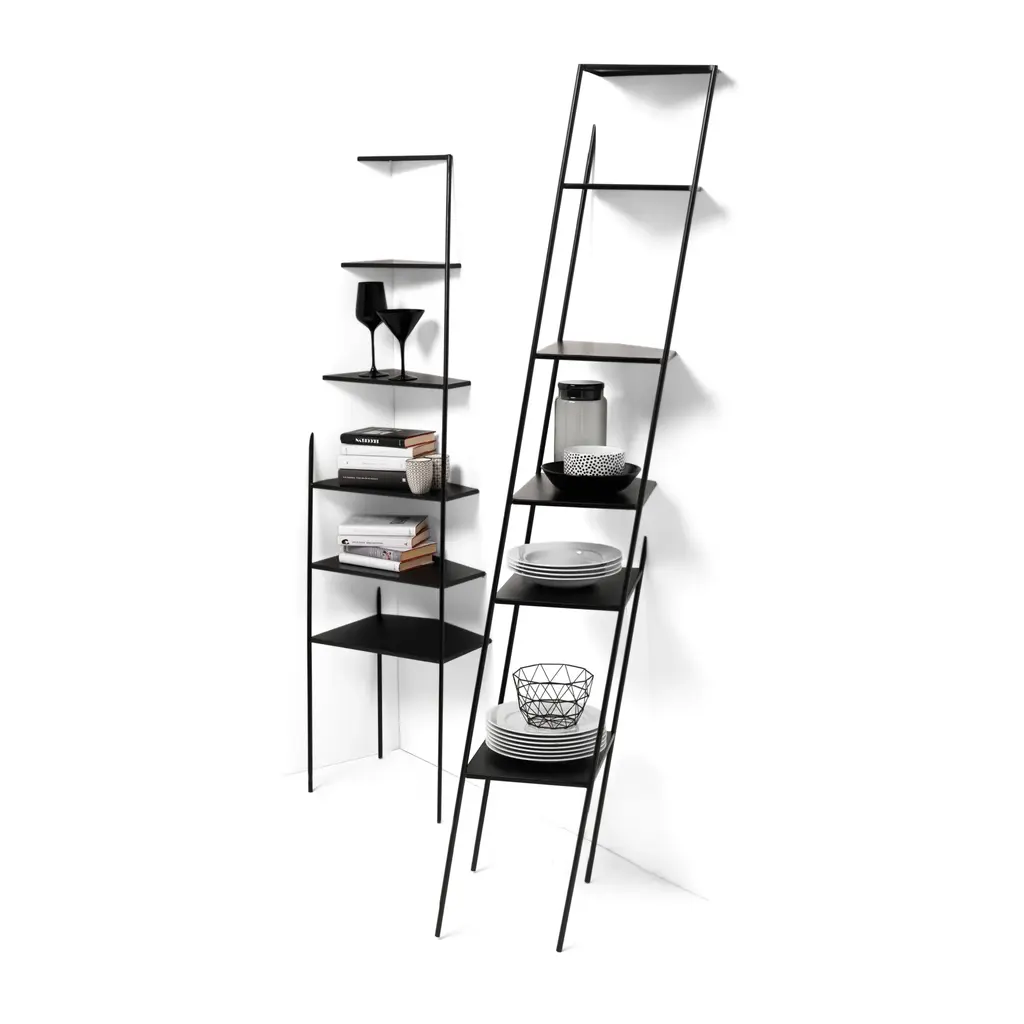 Introducing the Black Ladder Book Shelf from Mogg Mama. This metal etagère is both elegant and functional, with a unique ability to appear almost invisible when resting on the wall. Choose from black or white and three sizes, including angular and flat options. Requires wall fixing. Elevate your space with this sophisticated and exclusive shelving.
