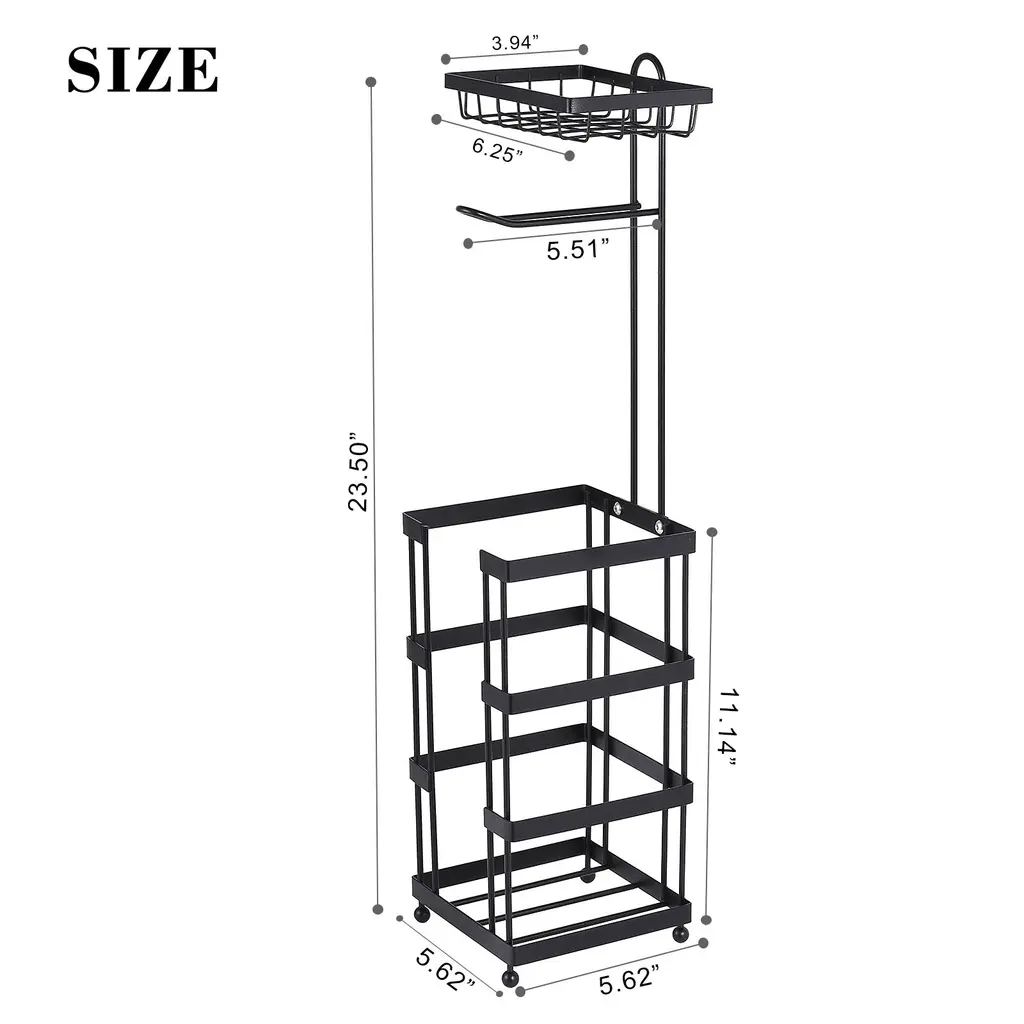 · Convenience: Designed to dispense 1 roll of toilet paper while securely storing up to 3 additional rolls for storage. Additionally, the top shelf offers extra storage space, ideal for holding items such as your cell phone or baby wipes, enhancing both functionality and convenience in your bathroom.· Design: This Bathroom freestanding toilet paper holder is space saving and movable, the toilet paper stand can be moved to a reachable place next to you and can be used in condos, apartments, campers, cabins etc. Easy to assemble No tools required, without complicated wall mount fixtures.· Stable and Secure: Our bathroom Black tissue holder has a flat base which ensures the toilet paper holder will not fall over easily. It can load 3 more back-up large extra rolls and will make the holder more stable and balanced. Raised feet make toilet paper shelf stays off floors so the paper keeps always dry and clean.· Decoration: Crafted from durable metal with a sleek finish, this toilet paper holder stand adds a touch of style to your bathroom. It is rustproof and resistant to peeling or scratching, ensuring lasting quality. Easy to clean just wipe with a damp cloth for simple maintenance.Enhance your space with bathroom accessories.· Satisfaction in Detail: We are confident in the quality of our product, designed with your satisfaction in mind. Includes 1 toilet paper holder stand with Shelf. If you encounter any issues, our professional team is ready to assist. Buy with confidence and enjoy a worry-free experience!