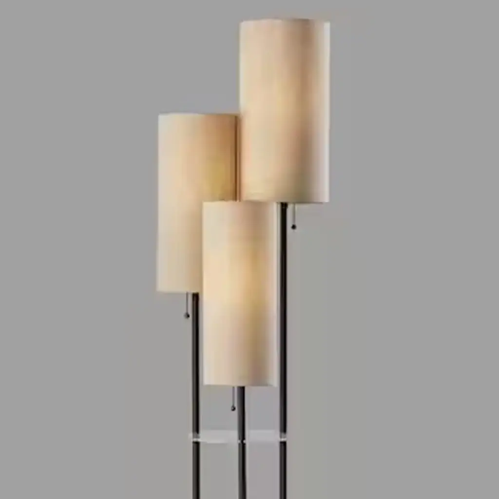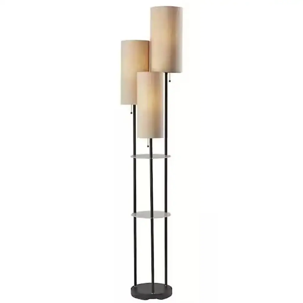 The Trio floor lamp offers plenty of light and offers easy storage solutions within a decorative yet small footprint. 3 black poles secured in a round base each hold a brown textured cylindrical shade. The poles also support 2 frosted acrylic shelves for display or storage purposes. 3 pull chain switches control each of the three 40 Watt incandescent or equivalent CFL bulbs offering varying light settings. Set this lamp next to the sofa for the perfect mix of side table and light. Highlights Matte black finish w. antique brass accents Brown textured fabric shades: turn each on and off with a simple pull chain switch Two 10 in. frosted acrylic shelves: perfect for next to the sofa or bed 68 in. H Modern style Requires 3 x 40-Watt type A (not included) bulb Lighting product is either UL or ETL Listed, meaning that it has been tested and approved to meet the government-regulated safety standards