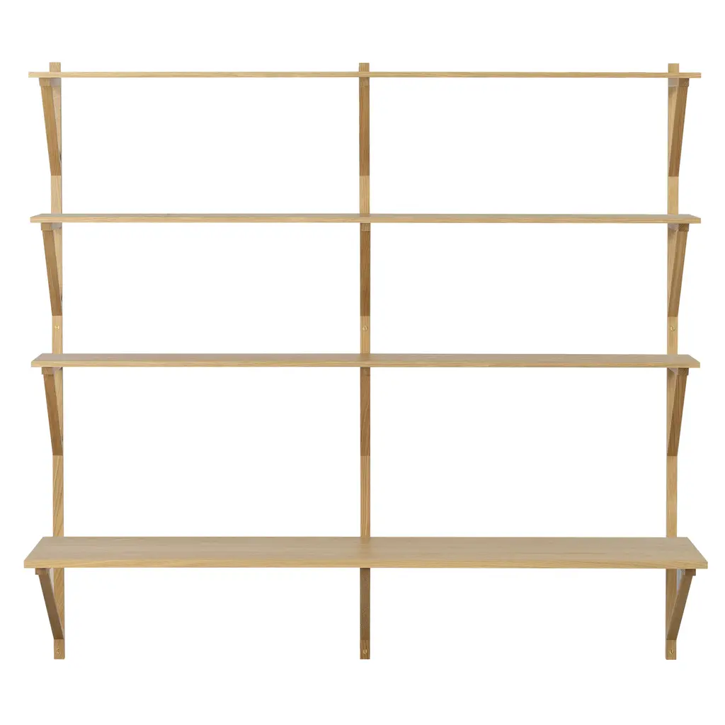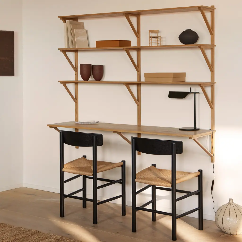With its clean lines and understated profile, the BM29 Shelf by Fredericia offers a practical storage solution that integrates seamlessly into a range of interiors. Designed in 1956 by Børge Mogensen, a key figure in Danish modernism, this wall-mounted shelving system features solid wood rails and brackets paired with veneered shelves. The shelves are fastened with brass screws, and the rails mount to the wall using keyhole fittings. Available in oak or walnut with a matte lacquer finish.