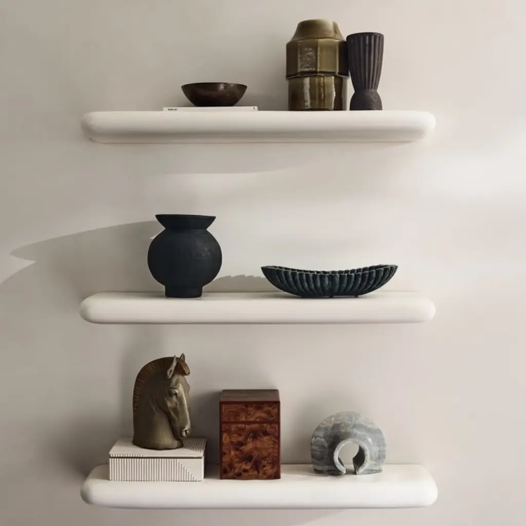 Bold wall shelf by Ceci Thompson borders on an architectural element. Crafted of resin, each shelf is hand-painted in matte white for an elevated approach to showcasing treasures. CB2 exclusive.