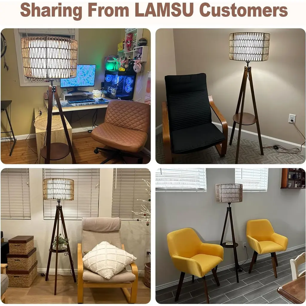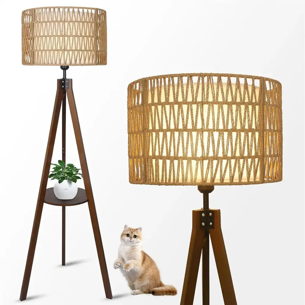 Add a touch of bohemian and mid-century charm to your home with the Bohemian Style Tripod Floor Lamp with Shelf, a stylish and functional lighting piece.This lamp features a wooden tripod stand and a rattan and fabric shade, creating a warm and inviting lighting effect. The built-in shelf provides a convenient space for storing books, decor, or small items, adding both style and functionality. The on/off foot switch offers easy and convenient operation. Perfect for living rooms, bedrooms, offices, or any space needing a modern farmhouse touch, this lamp combines style and practicality.Choose the Bohemian Style Tripod Floor Lamp with Shelf for a perfect blend of bohemian charm, mid-century design, and modern functionality. It's the ideal piece to enhance your living space with its warm and inviting presence. Product Features: Product Details: Product Dimensions: 16.93 "D x 12.99 "W x 59.00 "H, Weight: 9.70 lbs Package Dimensions and Package Weight: 16.93 "x 12.99 "x 6.50 ", Weight: 9.90 lbs. Main Material: Wood+Fabric+Rattan Scenarios : Living rooms, bedrooms and other indoor spaces Product assembly: easy to assemble Maintenance: wipe with a dry or damp cloth Base Finish: Wood