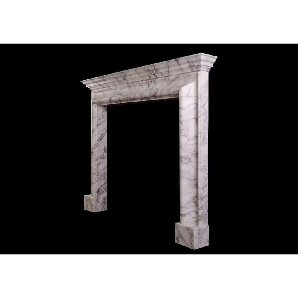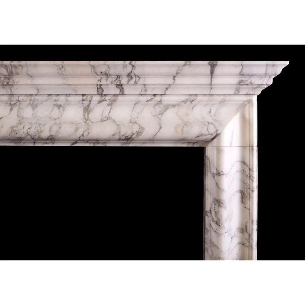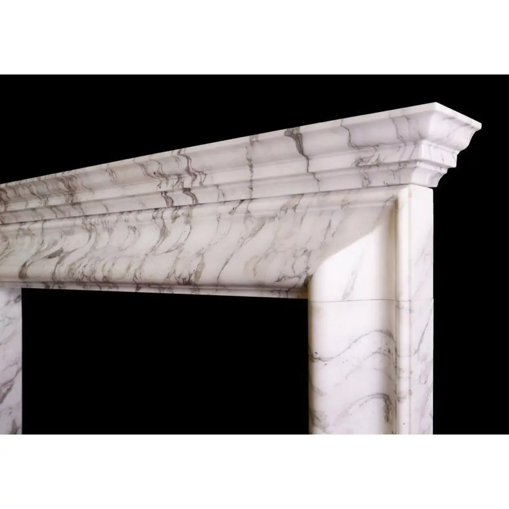 An English bolection fireplace with moulded shelf above. Shown in Italian Arabescato marble, could be made in other marbles or limestones if required. English, modern. N.B. May be subject to an extended lead time, please enquire for more information.Additional information:Shelf Width: 1581 mm / 62 ¼"Overall Height: 1270 mm / 50"Opening Height: 1014 mm / 39 ⅞"Opening Width: 1086 mm / 42 ¾"Depth Of Shelf: 156 mm / 6 ⅛"Overall Plinths: 1431 mm / 56 ⅜"