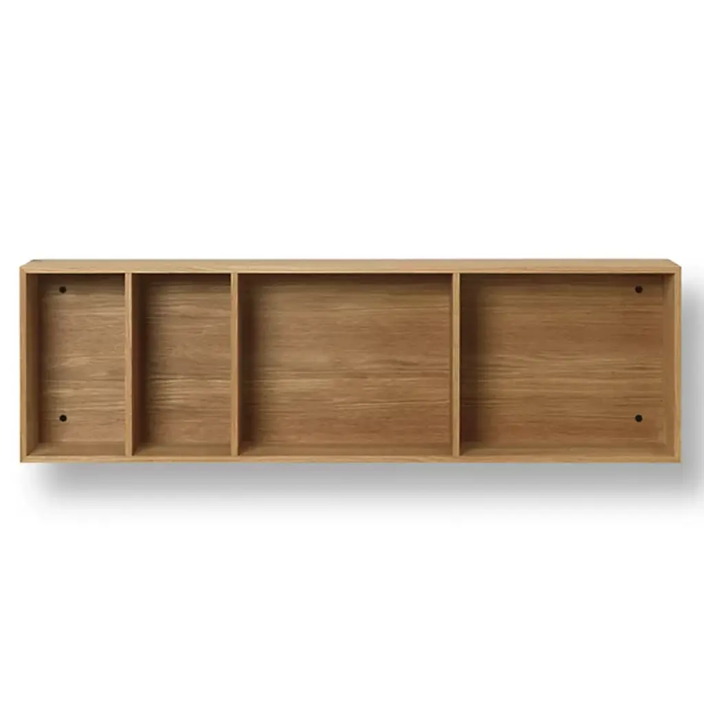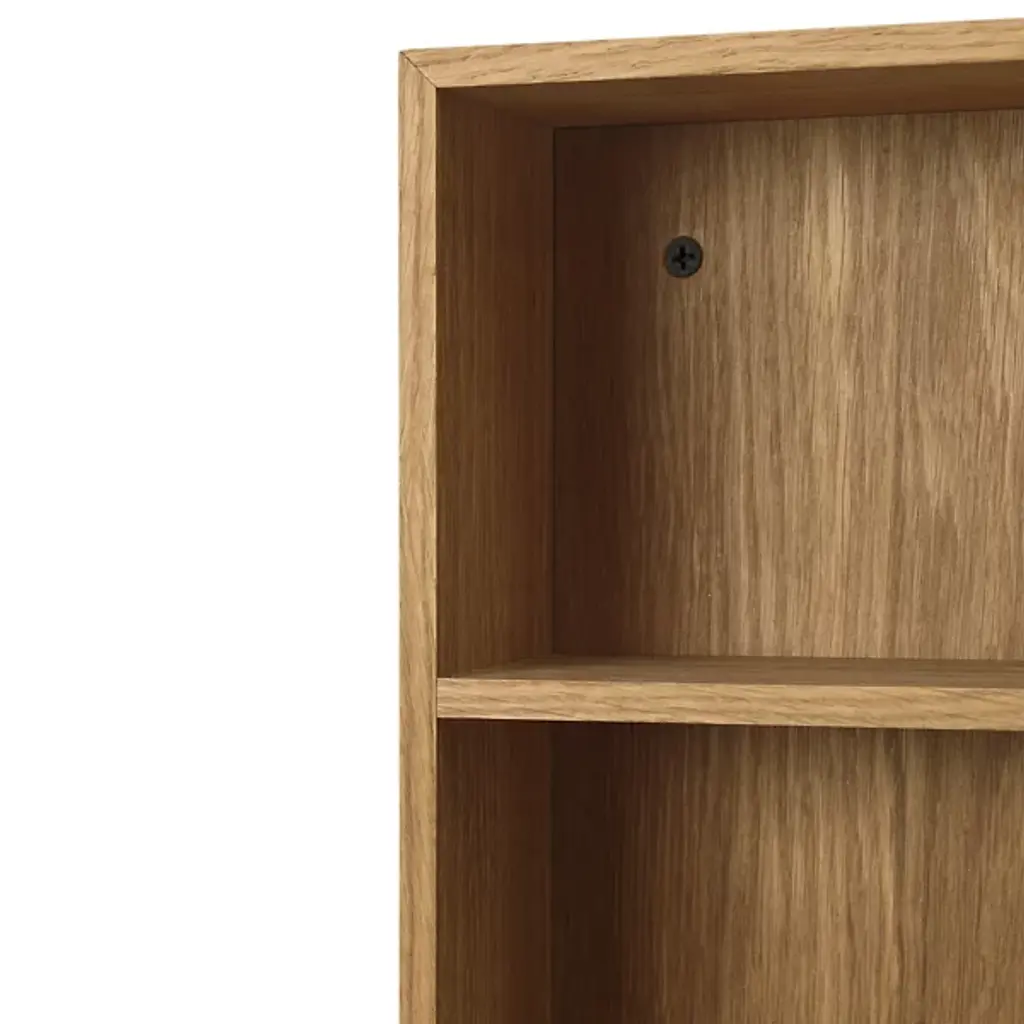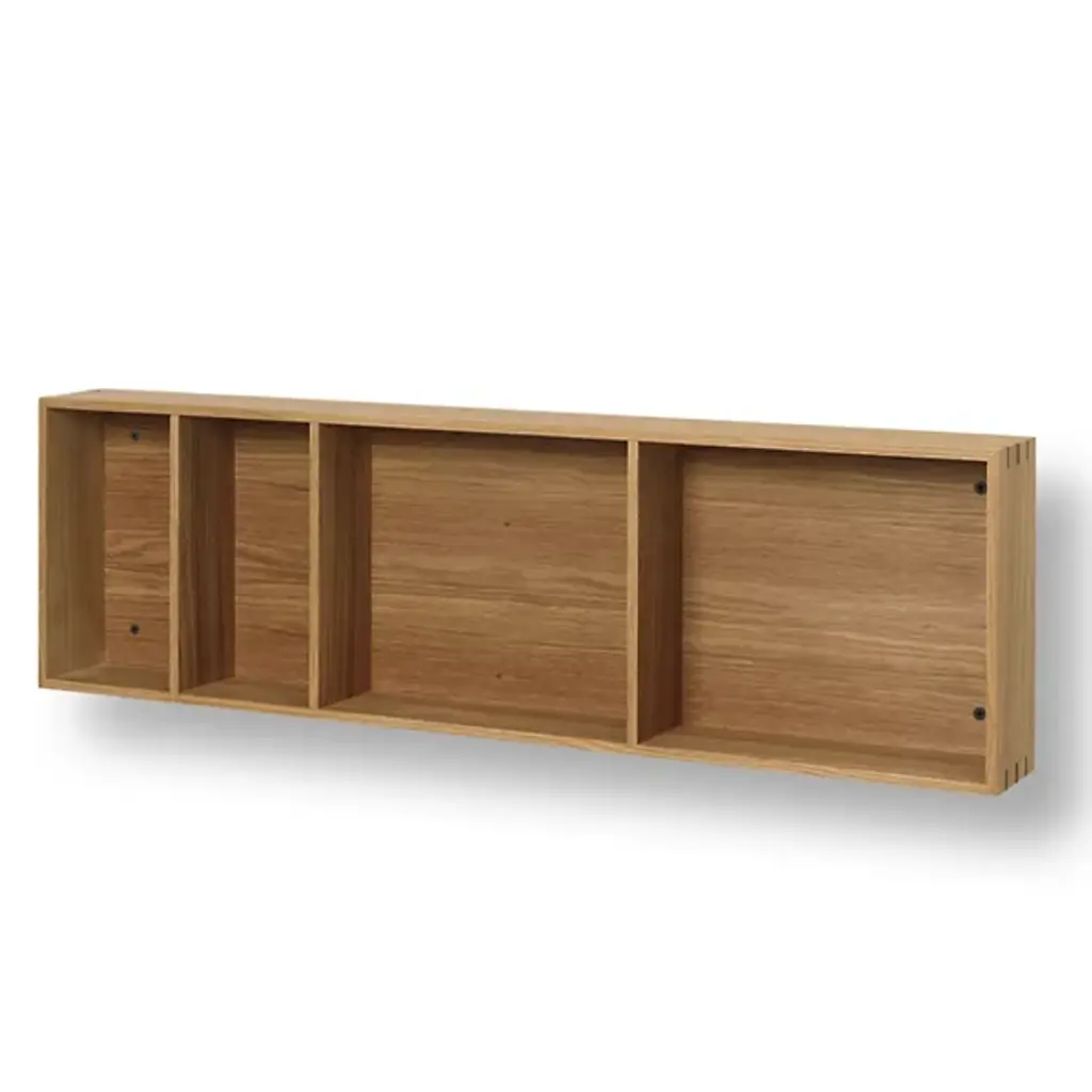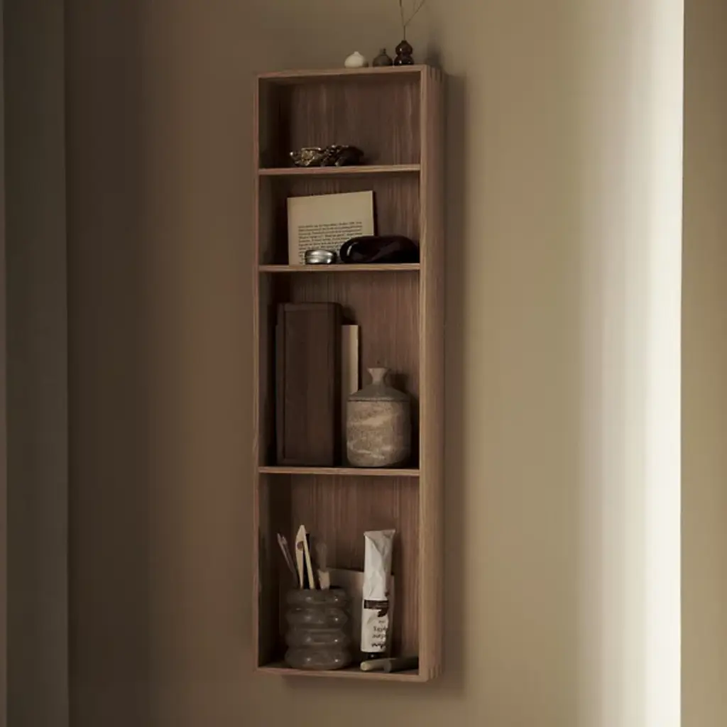 The Bon Shelf from Ferm Living embodies clear Scandinavian minimalism through its slim, rectangular form, which can be mounted vertically or horizontally. Designed for small accessory storage, its open bays organize everyday items within reach. A vibrant woodgrain surface of oiled oak veneer enriches the piece with natural styles, set over an MDF core. Concealed wall-mount hardware helps create a floating appearance, while its FSC certification underscores a commitment to sustainable production, merging a functional form with a thoughtful choice of materials.