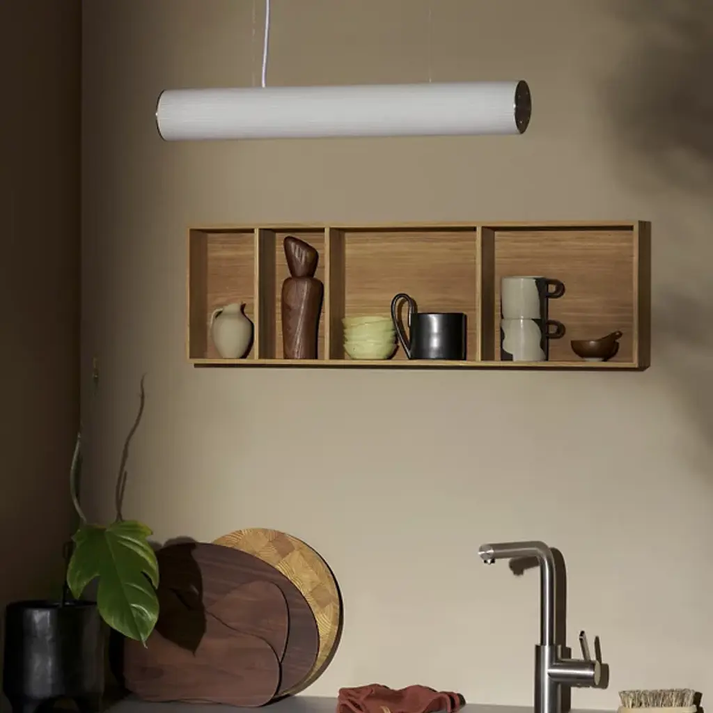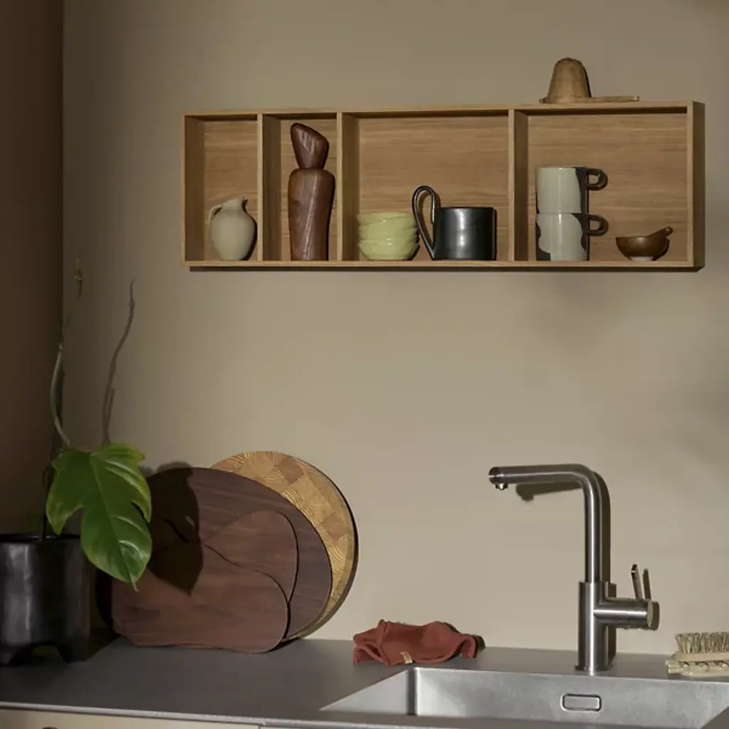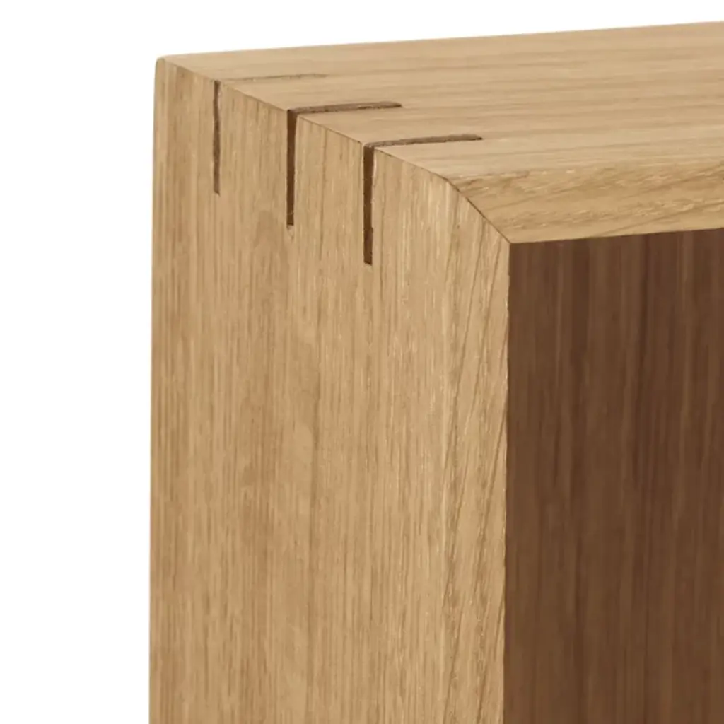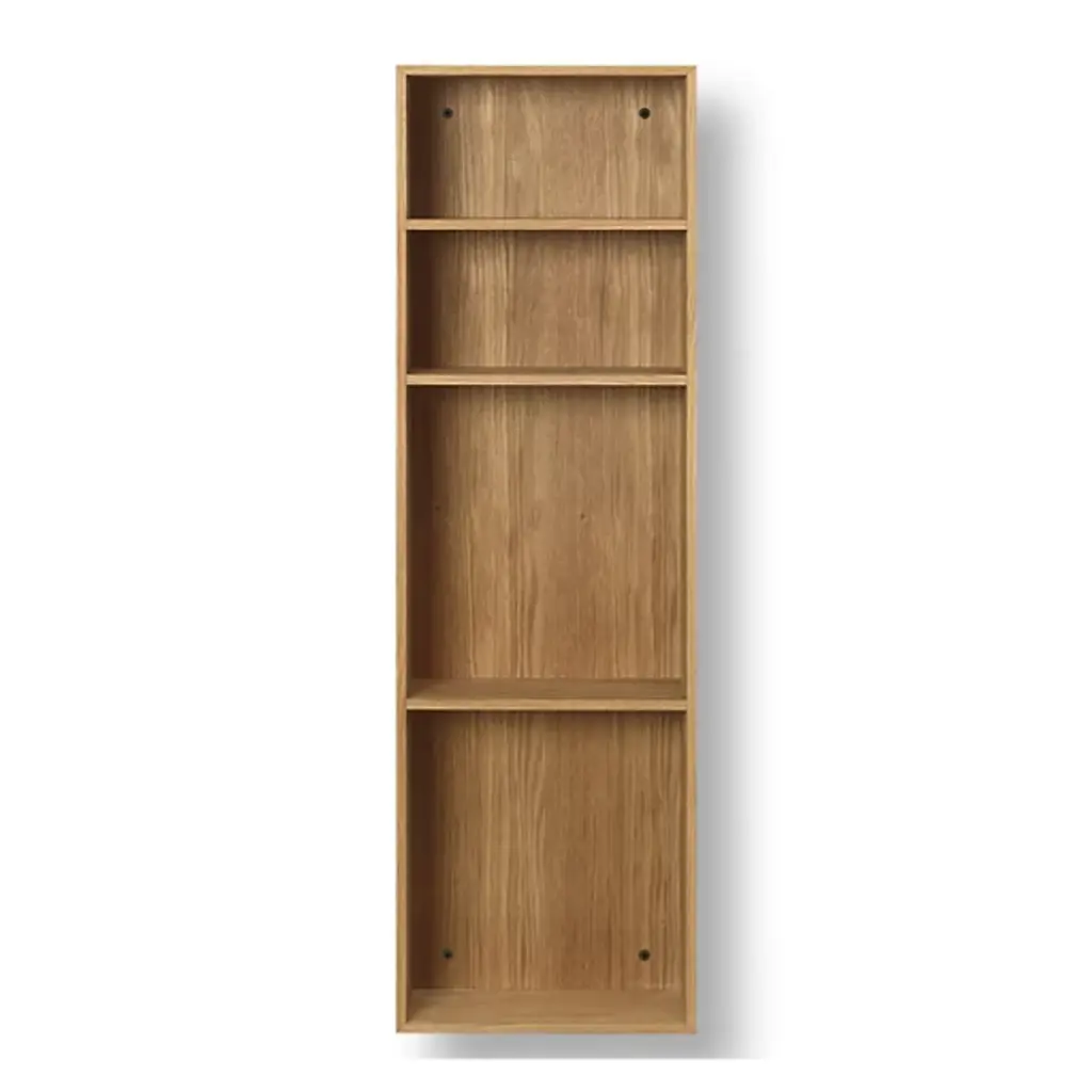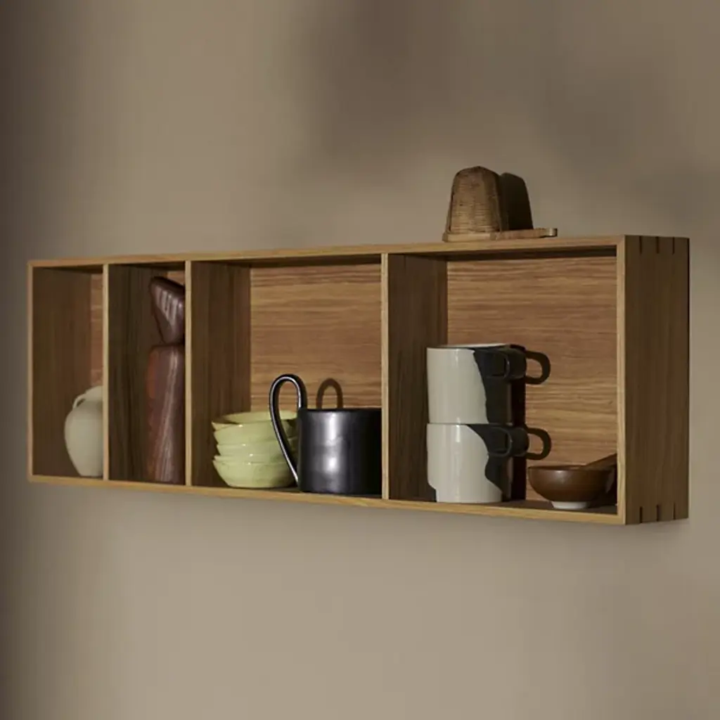 The Bon Shelf from Ferm Living embodies clear Scandinavian minimalism through its slim, rectangular form, which can be mounted vertically or horizontally. Designed for small accessory storage, its open bays organize everyday items within reach. A vibrant woodgrain surface of oiled oak veneer enriches the piece with natural styles, set over an MDF core. Concealed wall-mount hardware helps create a floating appearance, while its FSC certification underscores a commitment to sustainable production, merging a functional form with a thoughtful choice of materials.