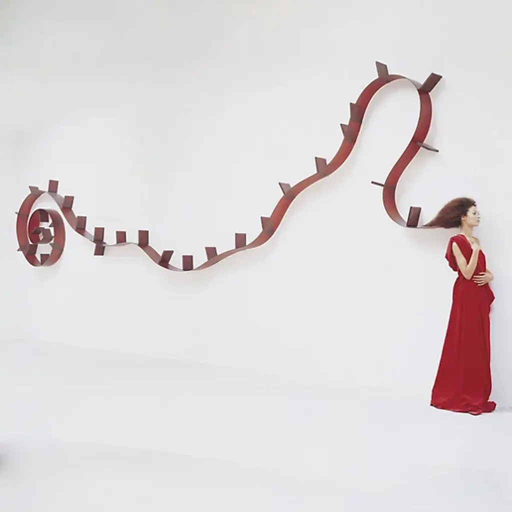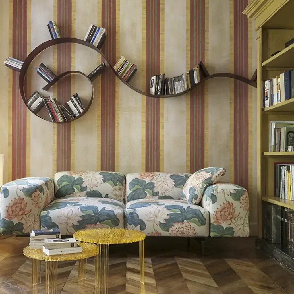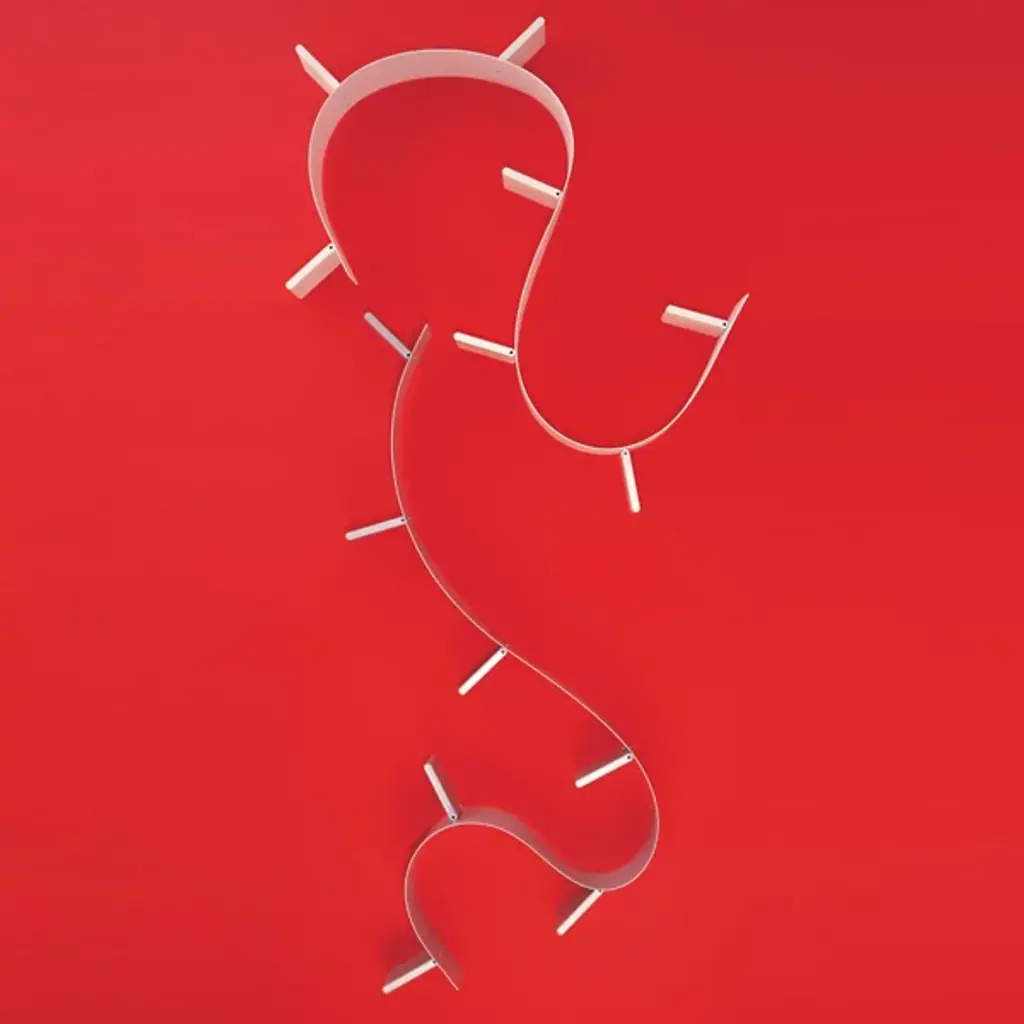 The Kartell Bookworm Shelf designed by Ron Arad combines an artist's creativity with a great company's technology. A careful analysis of extrusion technology allowed for the creation of this curvy, flexible PVC bookcase, which assumes any desired shape without compromising strength and functionality. It is advisable to install the shelf in a curved shape to keep the materials in tension and to increase resistance once loaded.