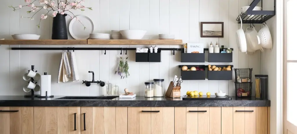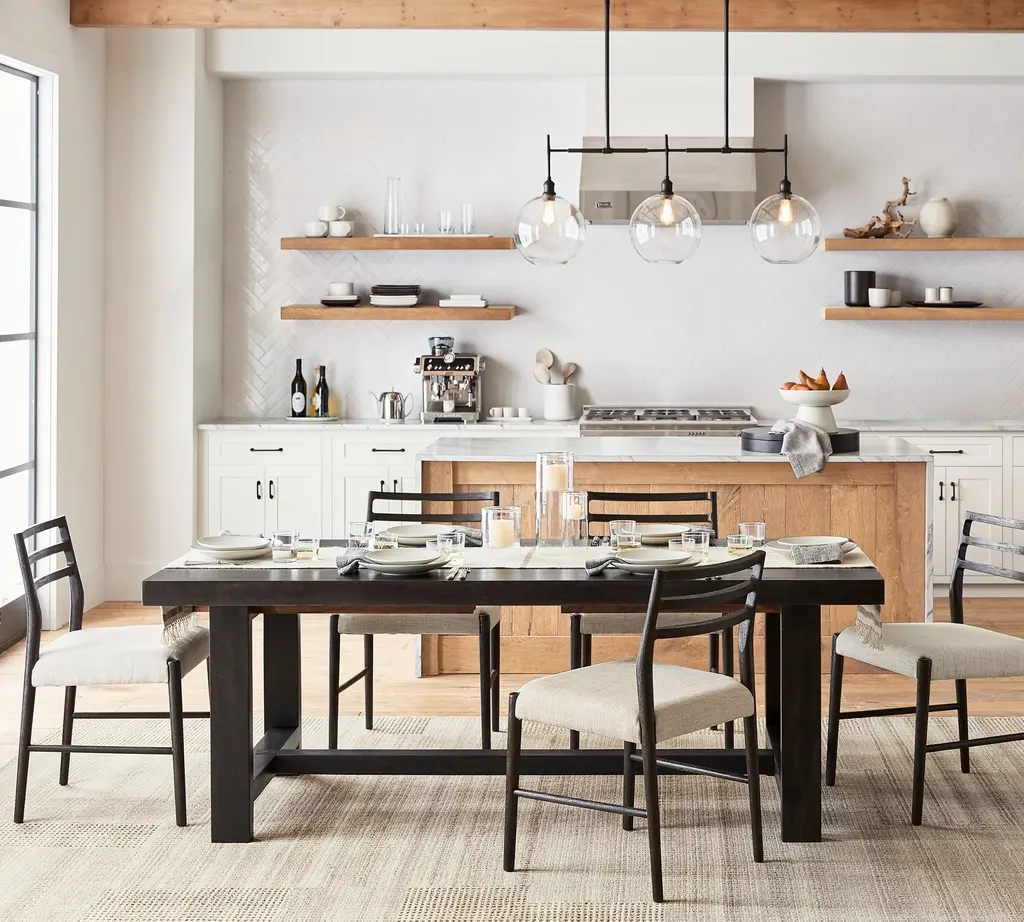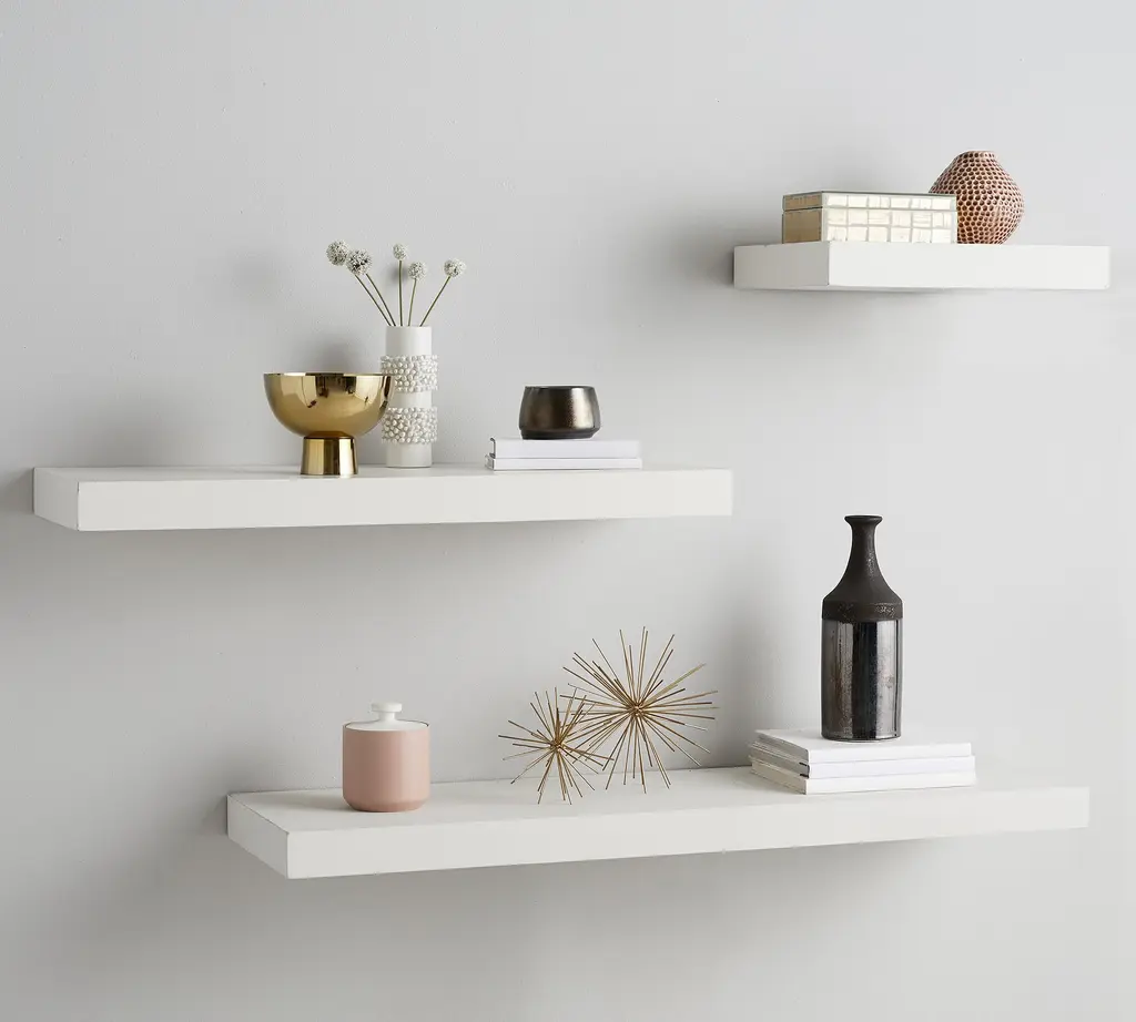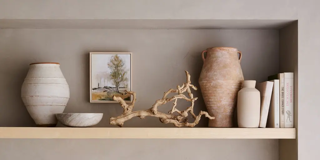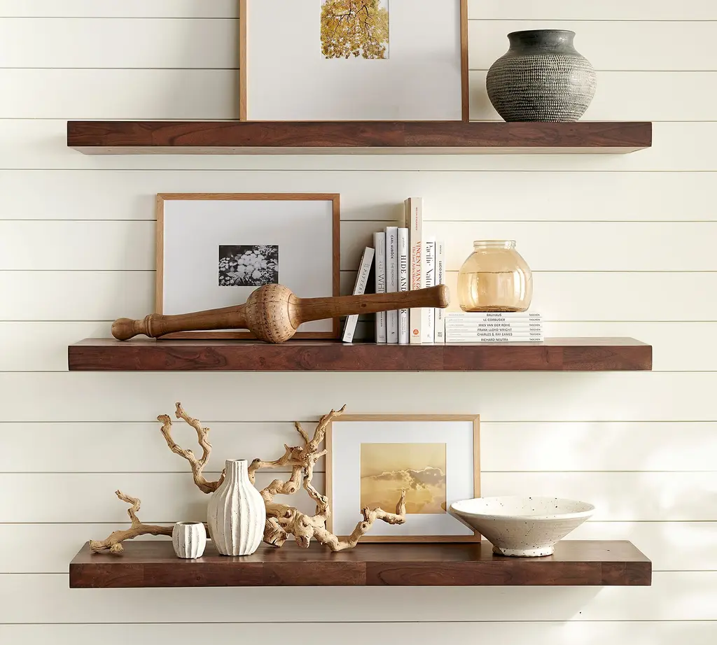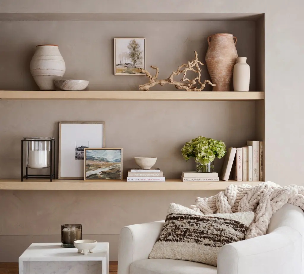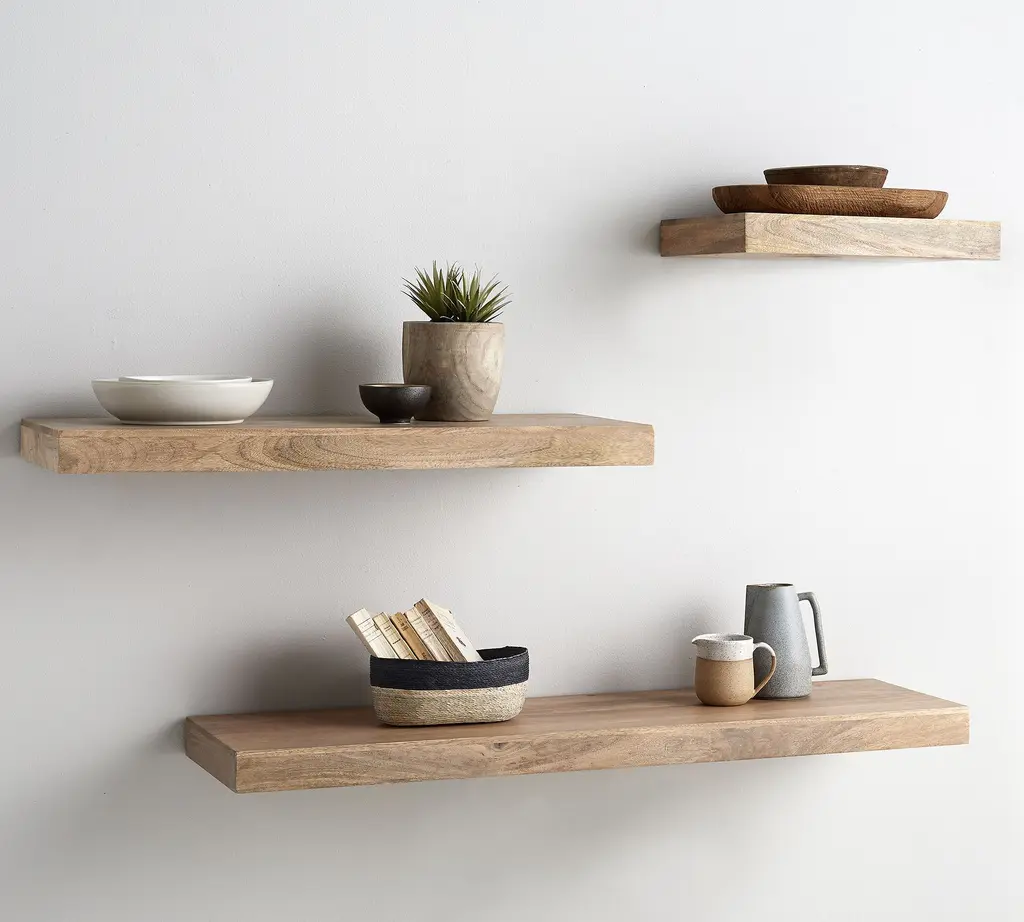 We love the versatility and style of open shelving. With a clean, minimalist design, these wooden shelves have a modern look. Display your collection of dinnerware, books, or curate a well-styled vignette with a statement branch, a rustic vase, and artful candleholders.