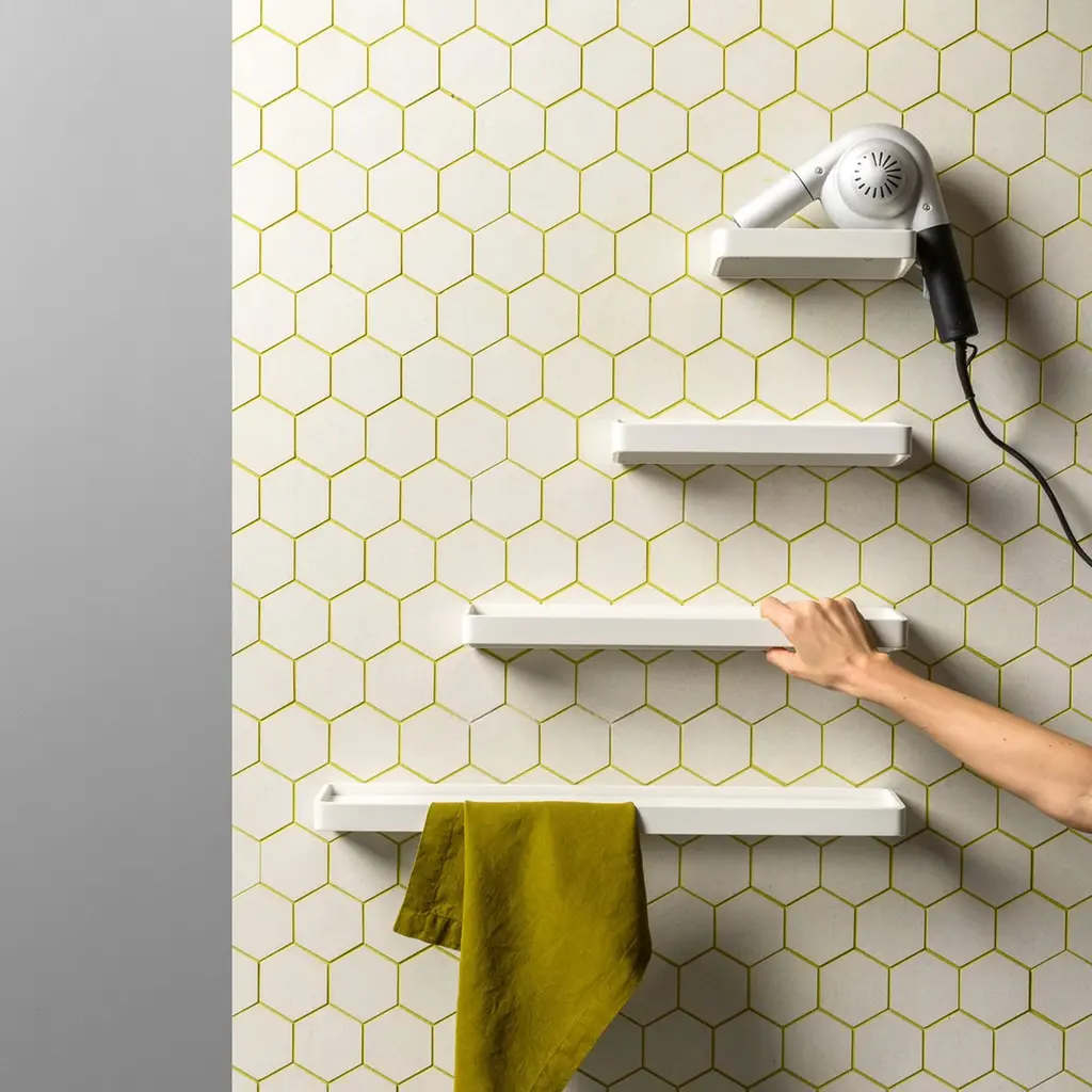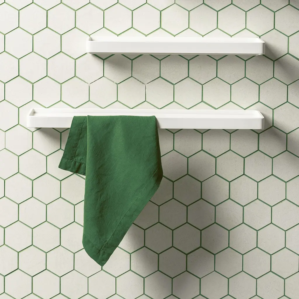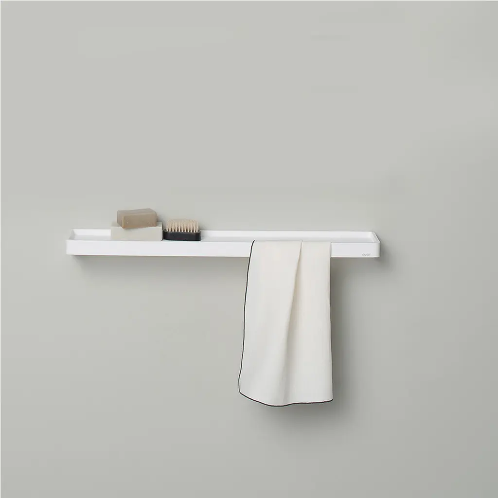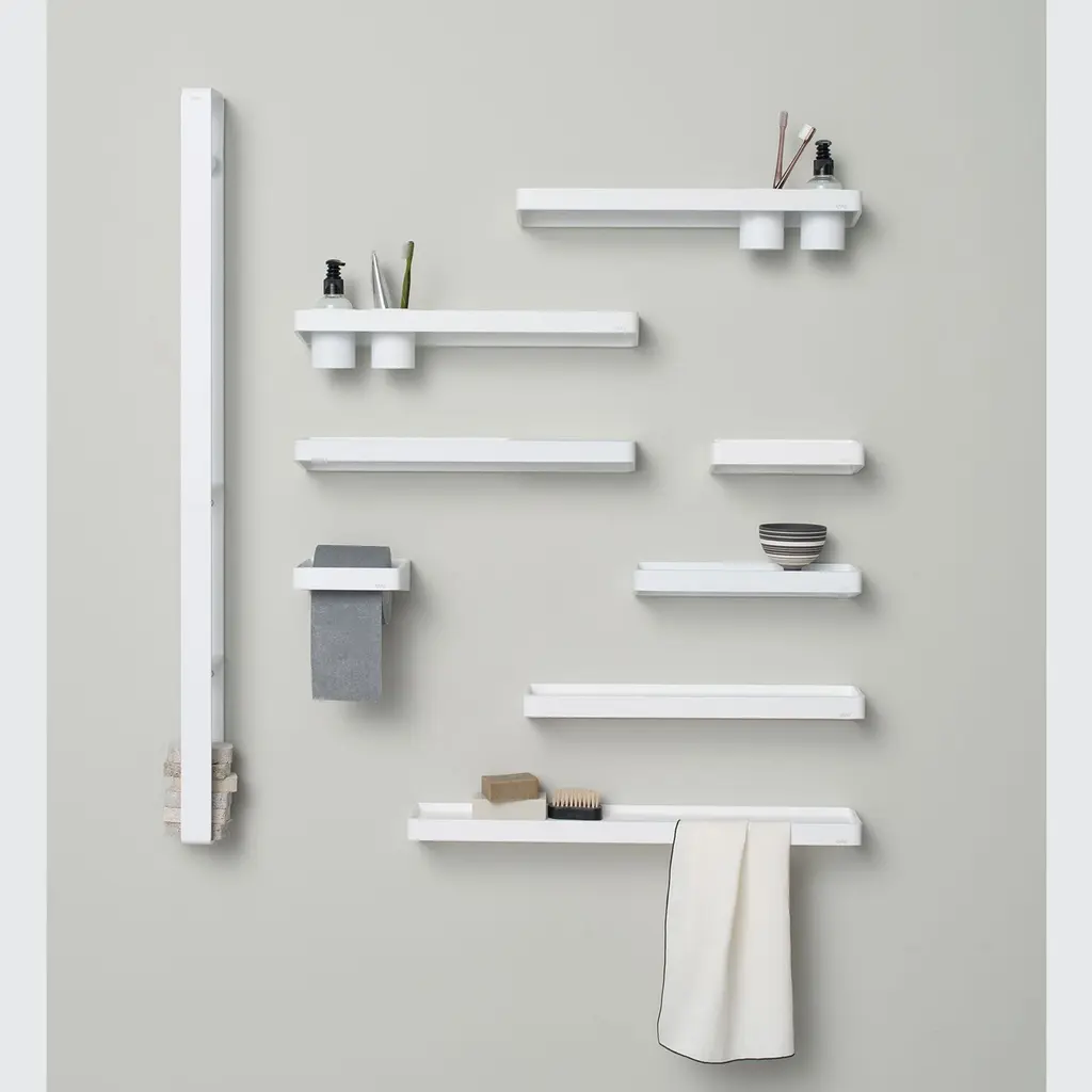 The Brunt collection’s shelves are wall-mounted and versatile, serving as towel racks, simple storage shelves, toothbrush holders, and makeup organizers. The concept behind these shelves is to create an accessory suitable for the entire family, catering to each individual’s daily needs.The shelf features a sleek and formal design to seamlessly blend with its installation environment. Its smooth surface provides a base for placing bottles, jars, creams, and more. There are two color options available: matte white and matte black each coming in various sizes. Sizes range from 8″ (20 cm) to the largest at 24″ (60 cm), making them suitable for any type of space. Another essential function is support: Brunt is a secure accessory to grab onto in case of bathroom accidents or falls.