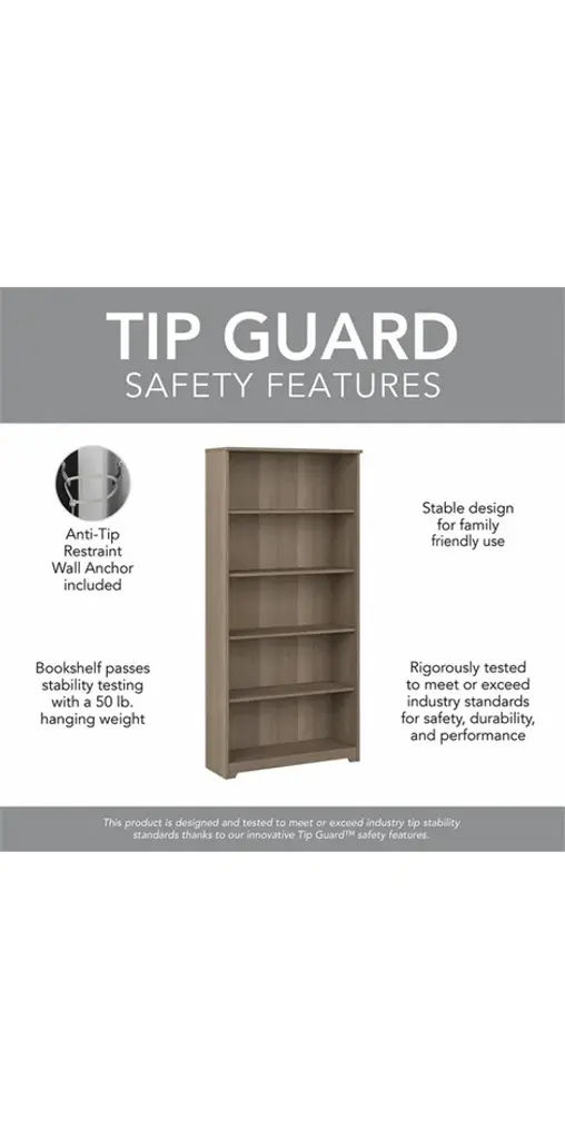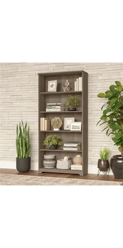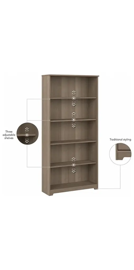 The Bush Furniture Cabot 5 Shelf Bookcase presents a home office storage solution with transitional style. Featuring a design that's as versatile as it is practical, this tall bookshelf offers an ideal way to organize important work materials, a collection of books or other media, miscellaneous household items, and more. Two shelves are fixed for stability while three can be raised or lowered to accommodate items of various sizes. Each shelf can support up to 25 pounds, so storing larger books and decorations is never a problem. A stable design and included wall attachment hardware makes this standing shelf a great choice for use in a variety of living spaces. This Tall Bookcase has been rigorously tested to meet or exceed ANSI/SOHO standards for safety and performance and is backed by a 1 Year Manufacturer's Warranty. See the full Cabot Collection for coordinating items available.Features:31W x 12D x 66H Tall 5 Shelf Bookcase boasts transitional styling that suits a variety of living spacesThree adjustable shelves move up and down to accommodate books and decorations of various sizesTwo fixed shelves give the Tall Bookcase additional strength and stabilityEach shelf supports up to 25 pounds so you can store paperback and hardcover books with confidenceThoughtfully designed for maximum stability and includes hardware to anchor the tall bookshelf to a wallHeight of the 5 tier bookshelf matches that of Cabot Desk and Hutch sets for a cohesive look in your home officeAvailable in your choice of several traditional or contemporary finish options for a look that works in any living spaceBush Furniture's commitment to safety includes rigorous testing that meets or exceeds ANSI/SOHO standardsBacked by a 1 Year Manufacturer's WarrantyComplete your workspace with a coordinating Cabot Desk, Office Chair, File Cabinet, Storage Cabinet and more (sold separately)Specifications:Product Dimensions: 5 Shelf Bookcase: 31.38"W x 11.54"D x 66.30"HProduct Weight: 59.85 lbs