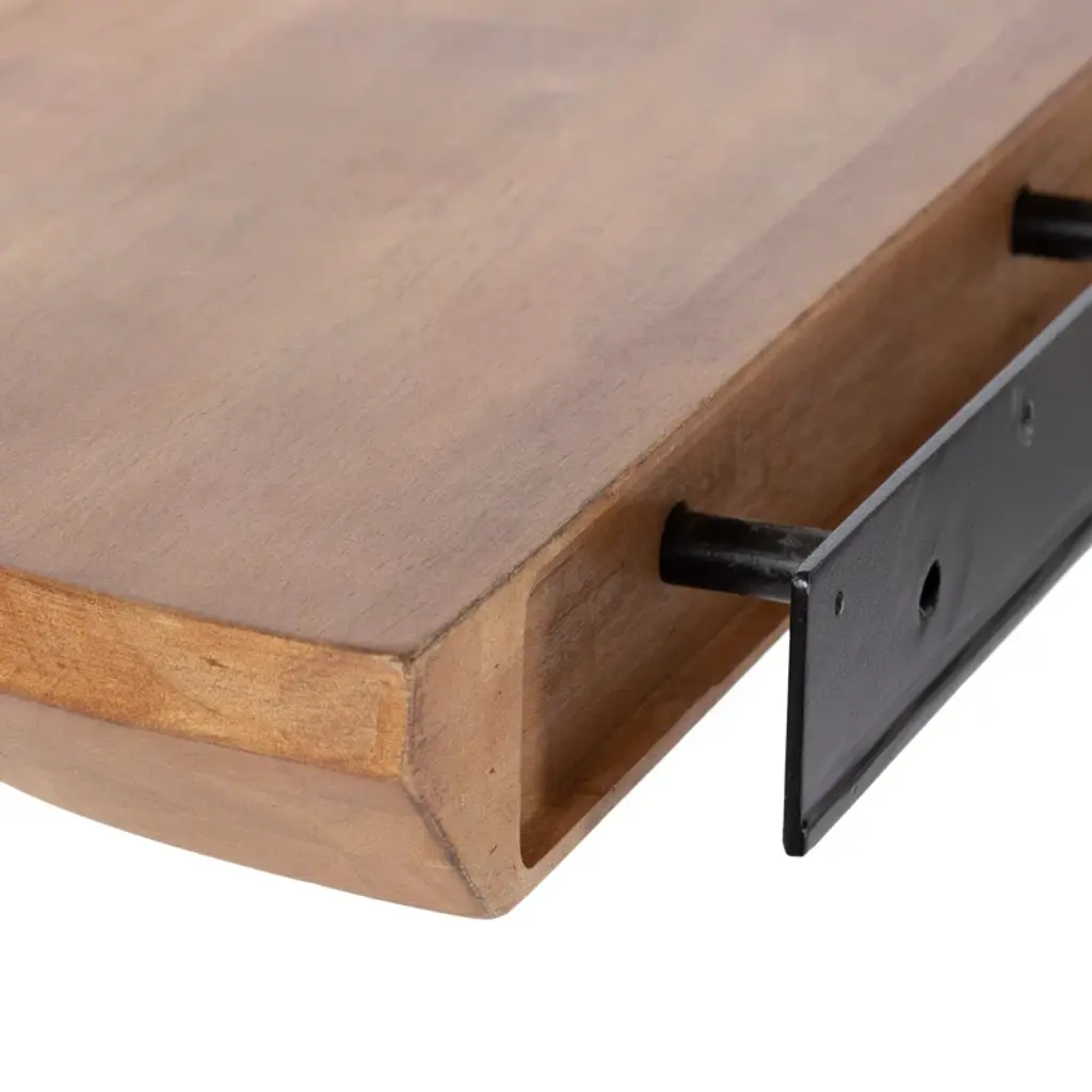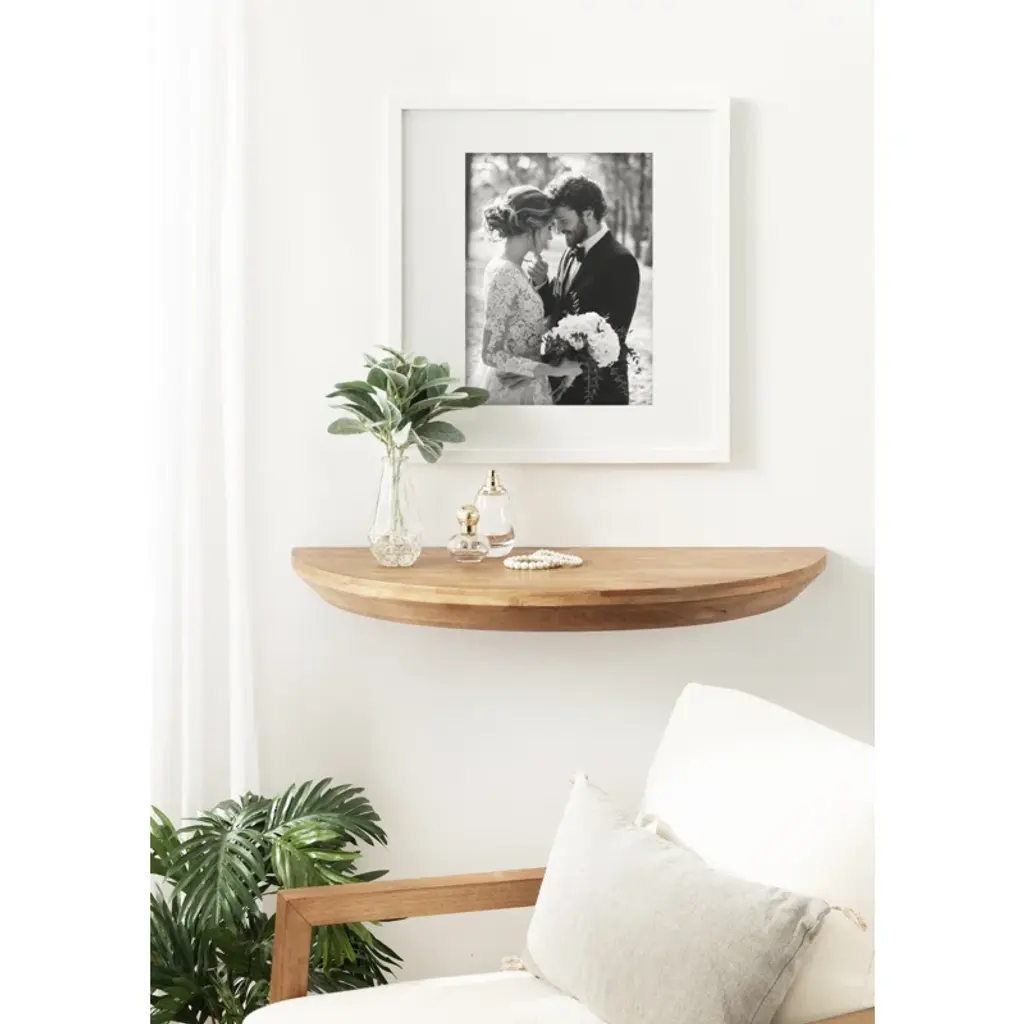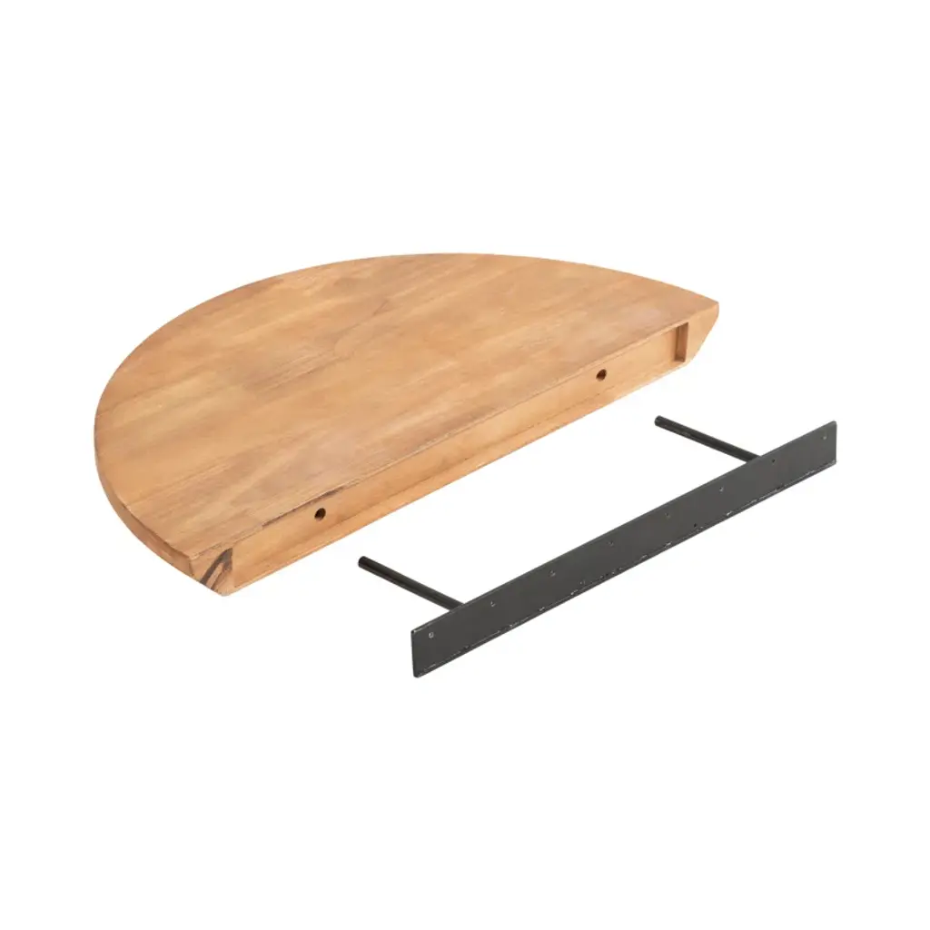 Floating finesse. Our half-moon table shelf is a sleek, space-saving addition to any room, crafted from solid wood with a natural woodgrain finish. Its floating design keeps your floor free, making it an ideal choice for an entryway or living room console. Showcase your favorite decor elements or serve up appetizers for guests – the possibilities are endless. Just attach the bracket to the wall and slide the table shelf on top for a seamless, stylish look.