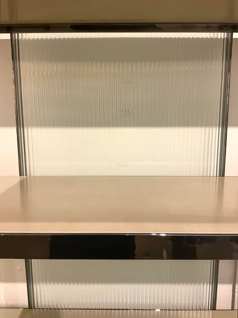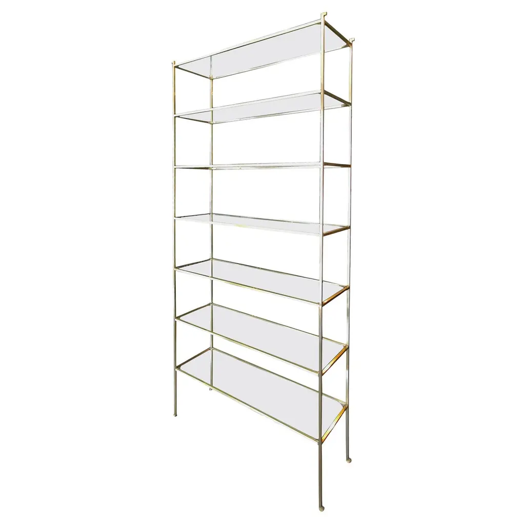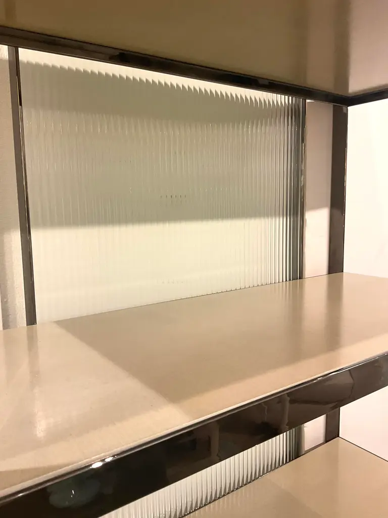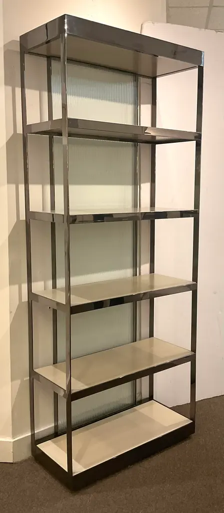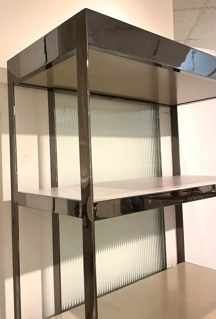 Original retail $5616. Stylish Caracole Modern Deep Bronze and Greige Shelf Life Etagere, Reeded glasss back, showroom floor sample