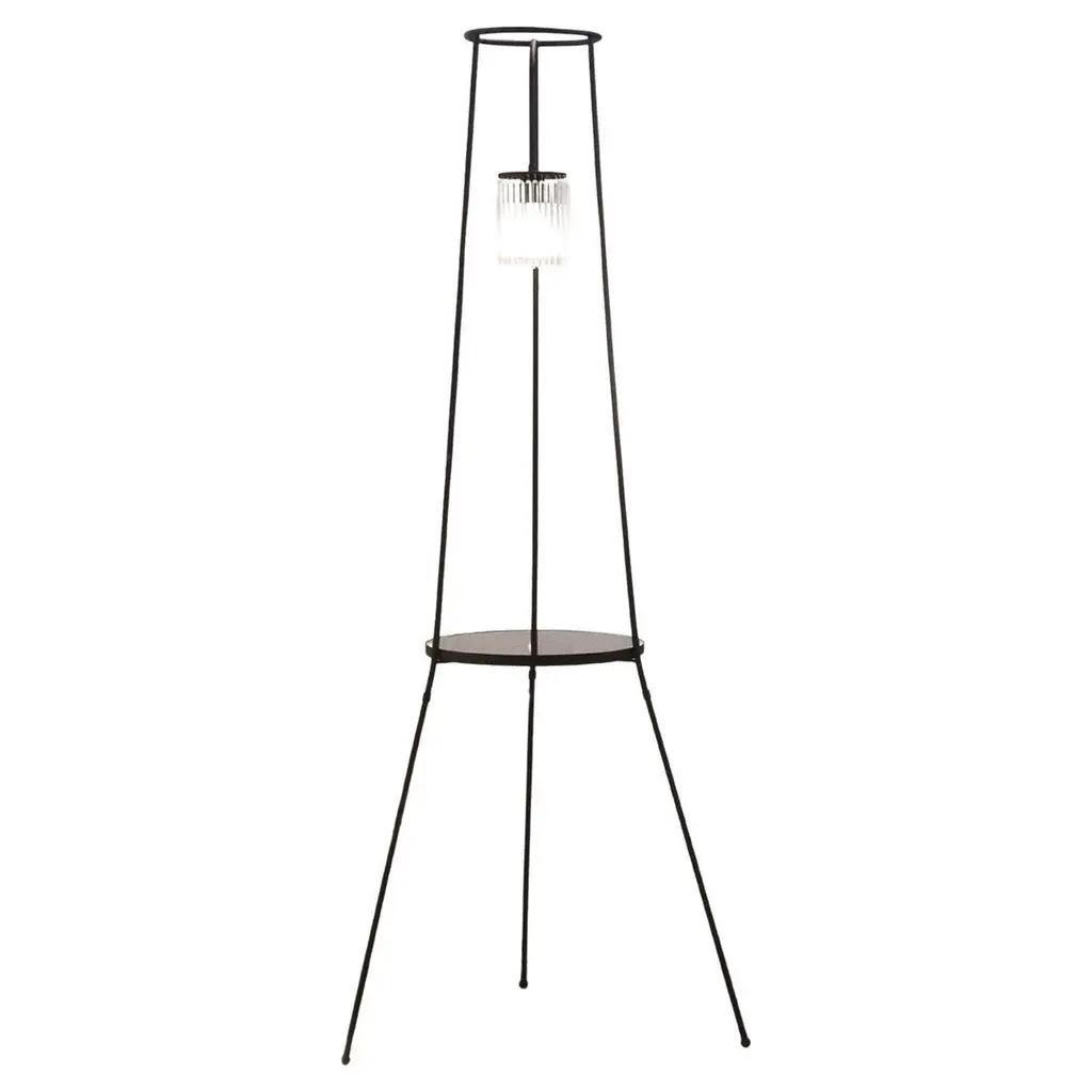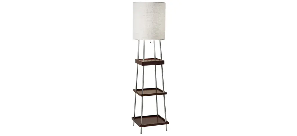 Explore the depths of modern geometric style. With a graceful silhouette, this floor lamp plays up a contemporary theme with a hint of softness. A tapered tower shape body shows off a charcoal black finish, embellished with clear glass shelving at each level. A frosted glass shade and additional down light put finishing touches on this intriguing design. Operates with a three-way switch.Features: • Includes: One (1) floor lamp • Finish: Charcoal black • Materials: Glass, Metal • Versatile shelf tower floor lamp • Charcoal black finish • Three tiers of clear glass shelving • Frosted glass uplight shade • Features additional down light • Features included: Clear glass shelving • Shade color: Frosted glass • Switch type: 3-way • Socket: E26 • Bulbs included • Power cord length: 96"Specifications: • Product Dimensions: 70"H x 13.5"W x 13.5"D • Product Weight: 14.1 lbs • Number of Shelves: 3 • Wattage: 9W • Assembly Required: Yes • Recommended Location: Indoor • Recommended Room: Living Room