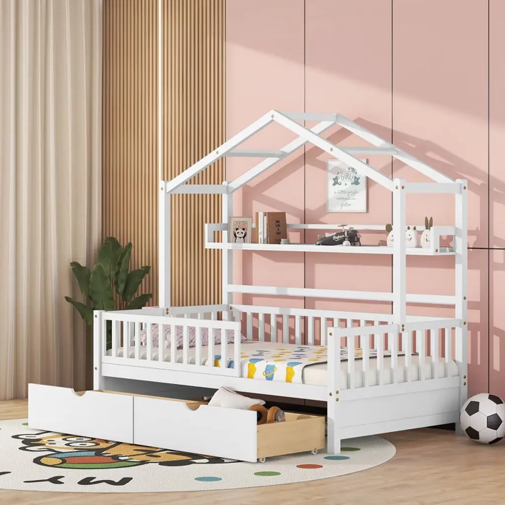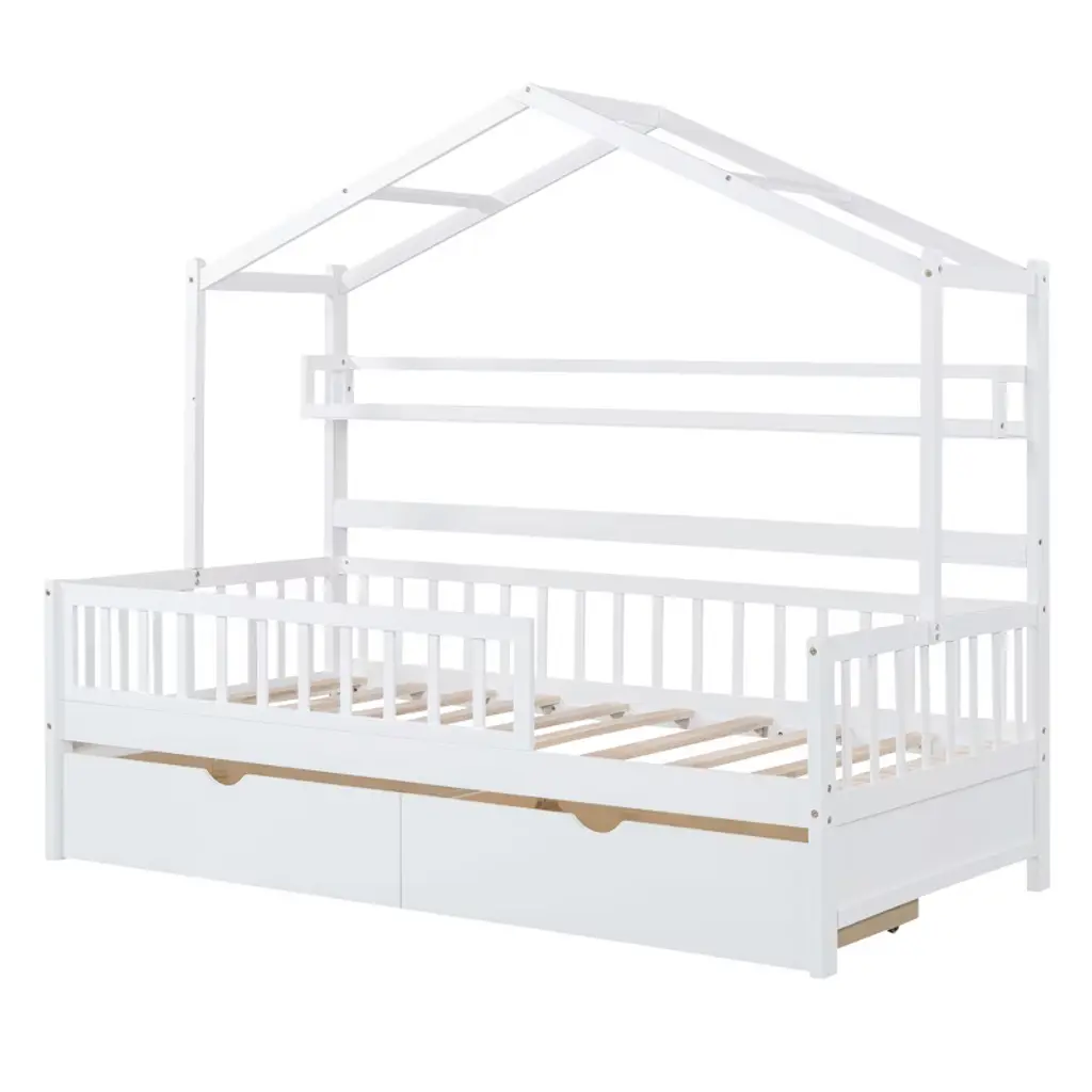 Cavinas Twin Size House Platform Bed With Storage Shelf & Under-bed Drawers,wooden Bed Frame For Kids Room,bedroom