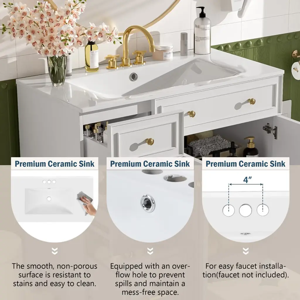 ChicFurnit offers a sleek and stylish vanity designed to maximize space in small and medium bathrooms, enhancing both functionality and style. Its modern design brings contemporary elegance to your bathroom, transforming the space with refined lines and a clean silhouette. The durable ceramic sink resists stains and is easy to clean, perfect for everyday use. Equipped with an overflow hole, it helps keep your bathroom dry. Made from high-quality painted MDF, this vanity provides lasting support and durability.