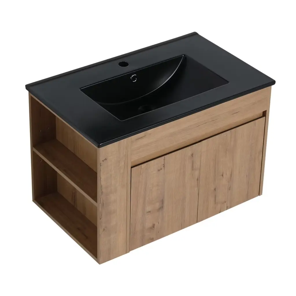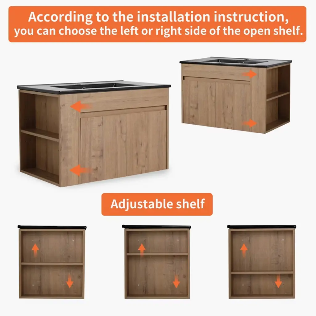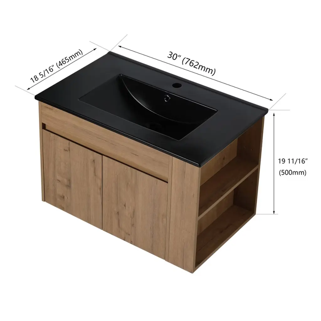 Chicfurnit Bathroom Vanity 30 Inch Wallmounted Vanity With Black Ceramic Basin Adjustable Open Shelf For Bathroom, Brown, 30"*18.3"*19.7"
