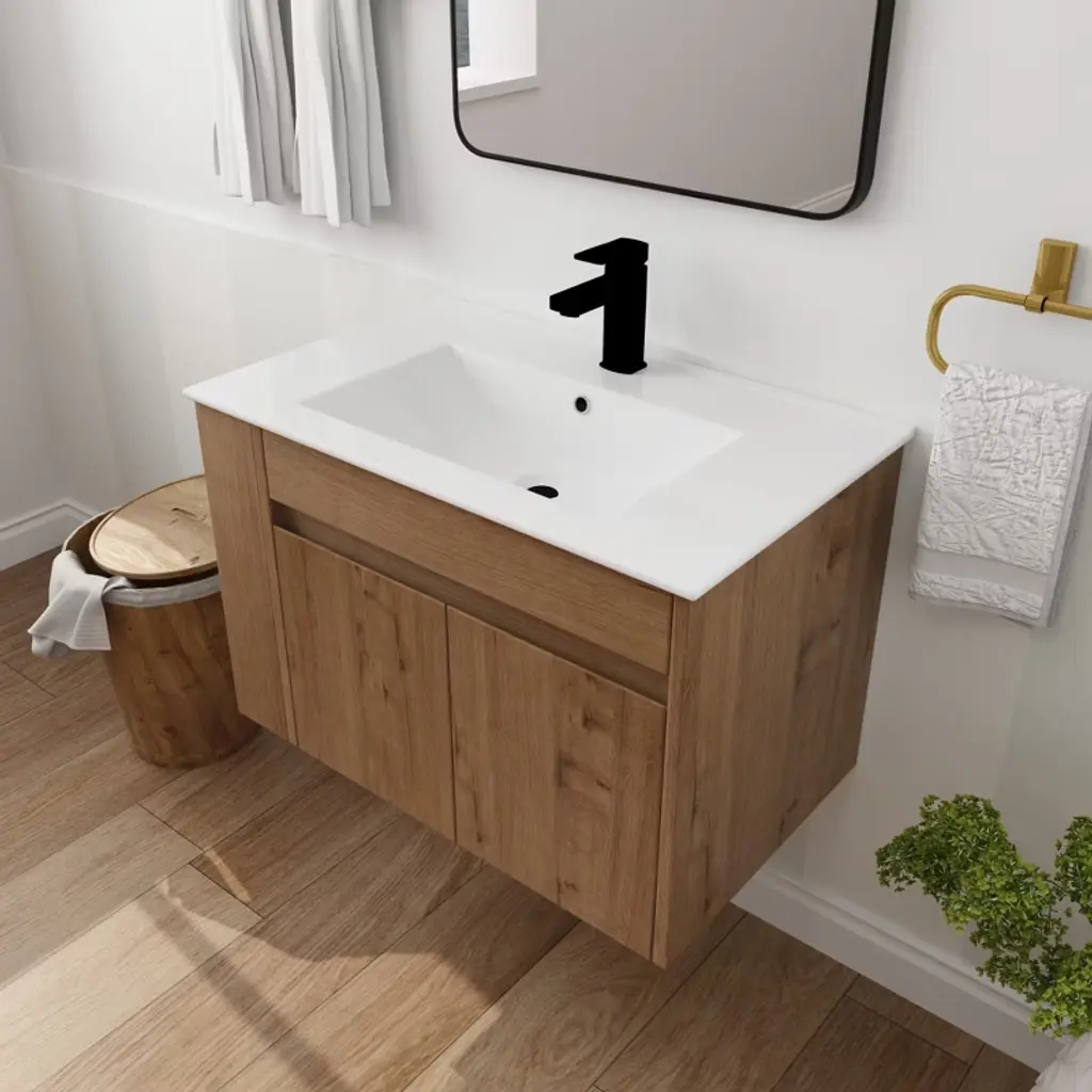 ChicFurnit brings a clean and modern touch to your space with this compact wallmounted vanity designed to open up floor area and streamline your bathroom setup. The smooth ceramic basin offers a simple surface for daily routines while angled door edges provide easy access with comfort in mind. An adjustable shelf lets you arrange storage your way keeping toiletries and towels within reach. Finished in a minimalist style this piece suits many modern bathroom looks.