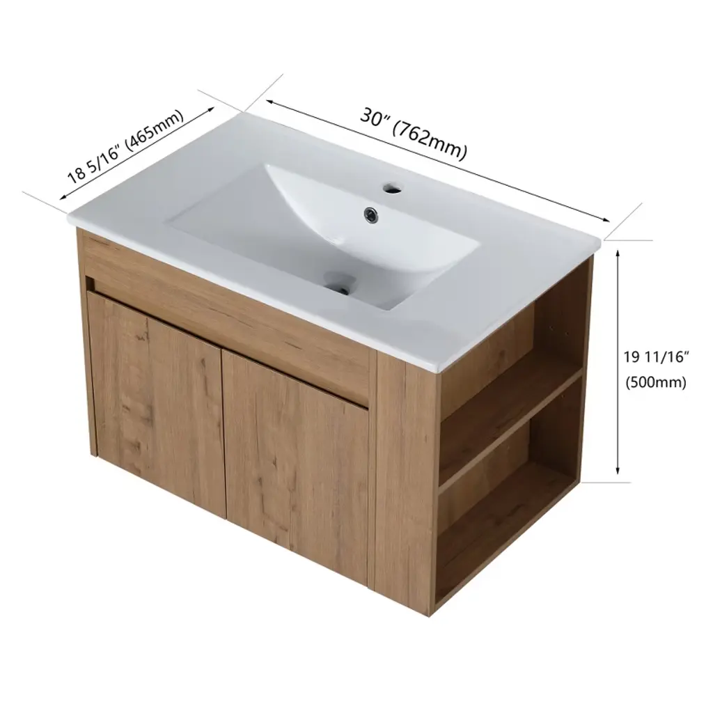 Chicfurnit Bathroom Vanity 30 Inch Wallmounted Vanity With White Ceramic Basin Adjustable Open Shelf For Bathroom, Brown, 30"*18.3"*19.7"