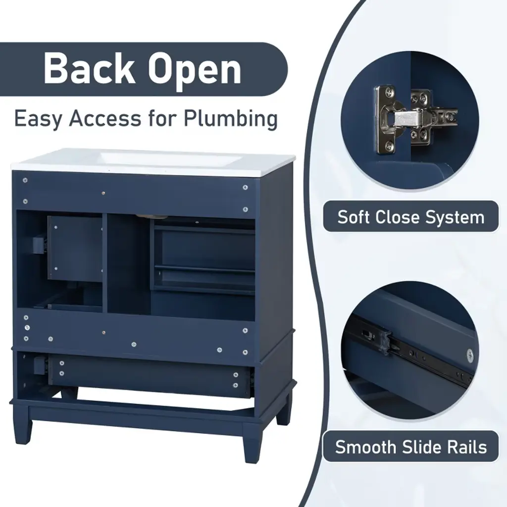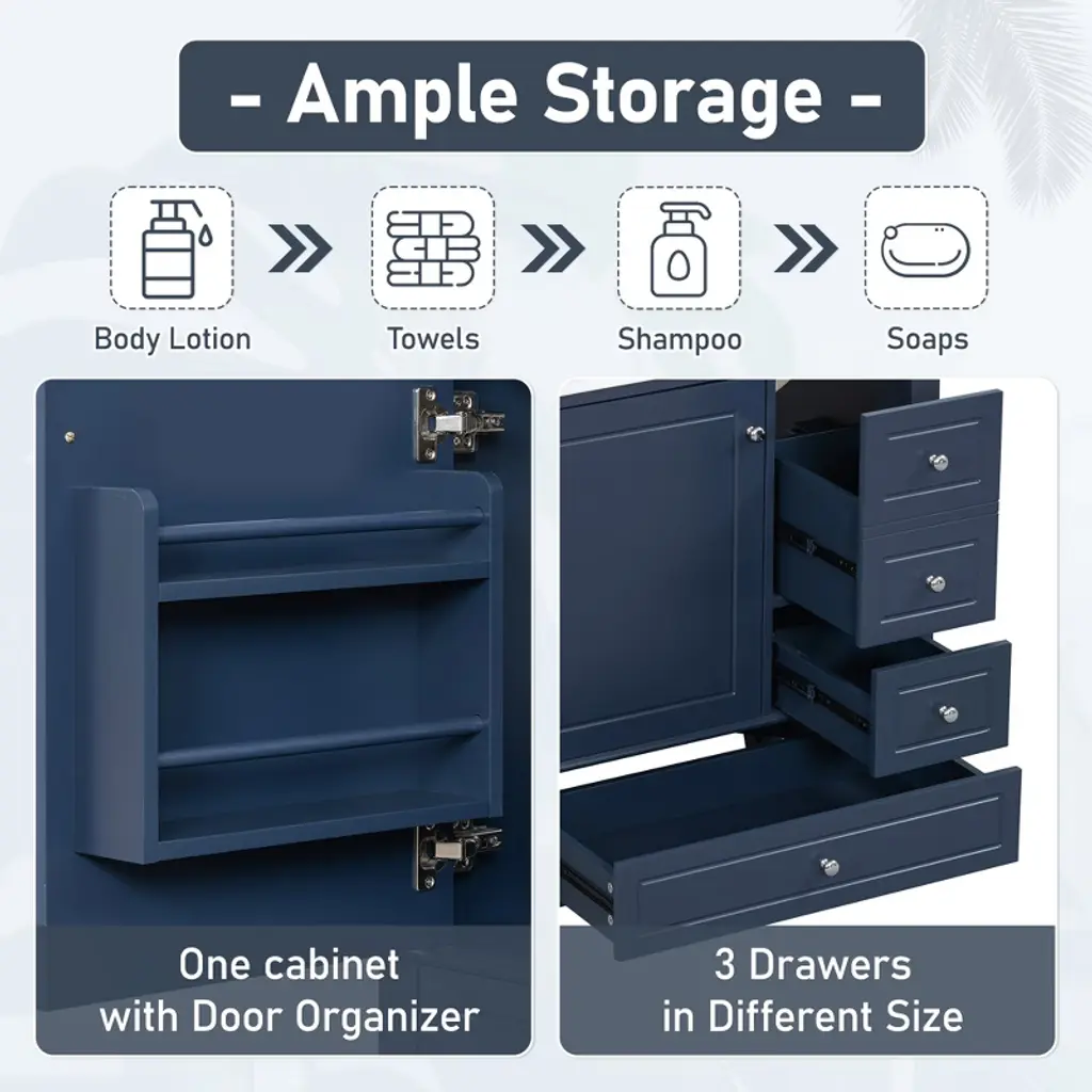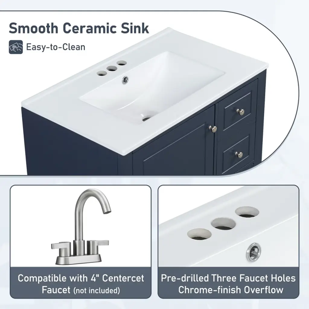 This bathroom vanity with sink combines functionality and style for your bathroom. Crafted from durable real wood and MDF, the vanity ensures long-lasting use and stability. It features a smooth ceramic sink with a waterproof finish, resistant to water stains and pre-drilled for a 4" centerset faucet (not included). The soft-closing door with rust-resistant metal hinges offers quiet, smooth operation. Inside, one door reveals a two-tier shelf, while three spacious drawers provide ample storage for toiletries, towels, and other bathroom essentials. This vanity keeps your space organized and elegant, offering both practicality and sophistication for your bathroom. Material: MDF Board + Rubberwood + Ceramic Sink Finish: Painted Finish Muti-Color Options Mounting Type: Freestanding. Sink Type: Undermount; Drop-In Overall Dimension: 18.50" D x 30.00" W x 33.70'' H Package Quantity: 1