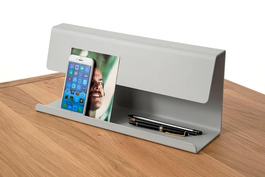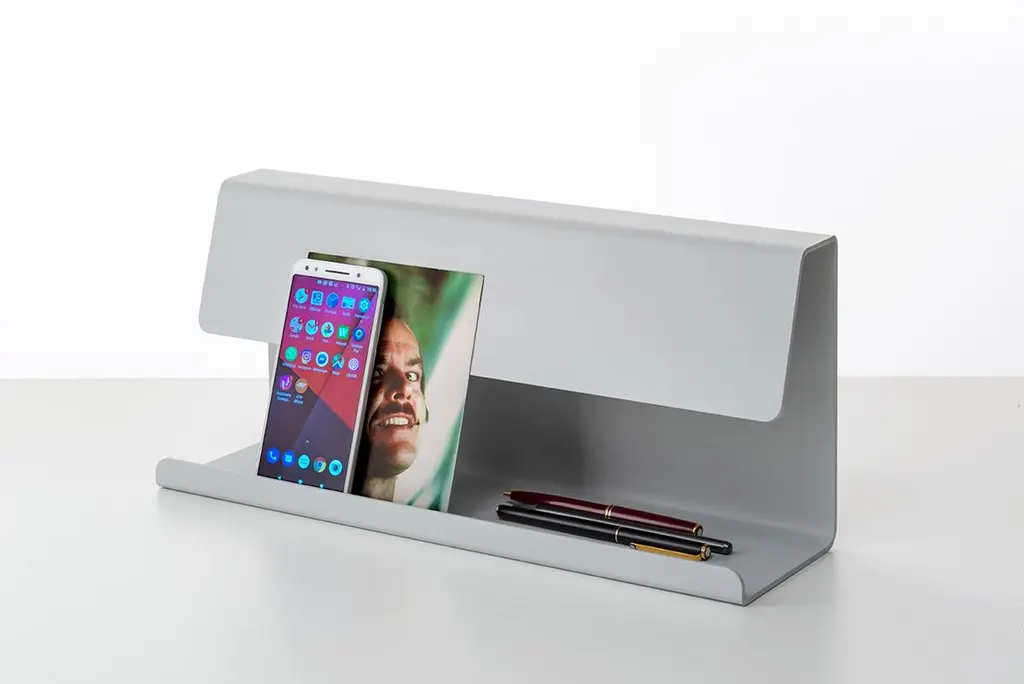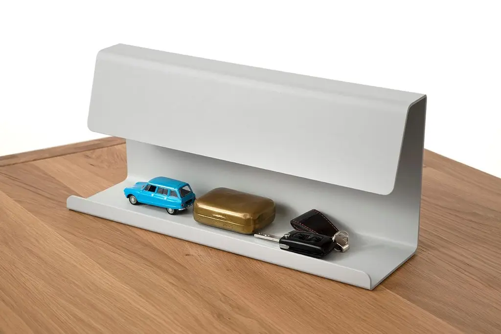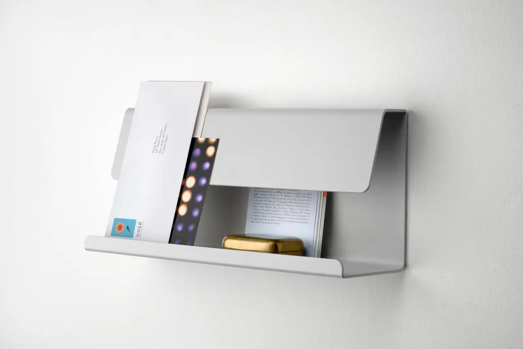 Made of folded metal and epoxy powder coated in grey or special edition upon request in copper, gold and petroleum blue finishes.Cling is a display rack and shelf. It can be mounted on the wall, or placed on the tabletop as a contemporary interpretation of English old-fashioned “travel desk” accessory. It is the ideal storage place on the entrance wall for incoming and outgoing small objects. It is your key holder, letter basket, display for magazines and tray for telephone and wallet. On your table, cling holds your tablet, pens, and all stationary needed at hand. Finally, you know where things are!