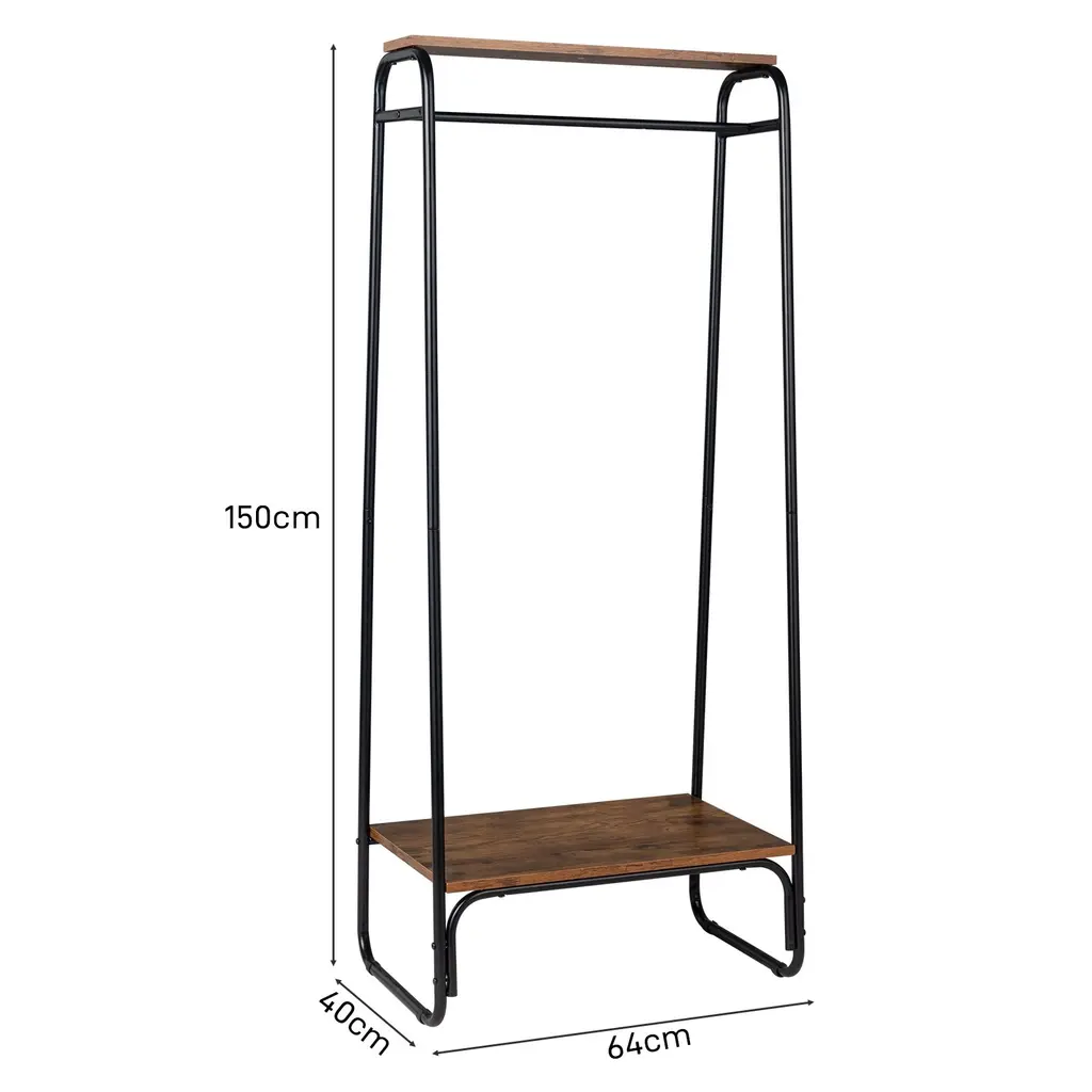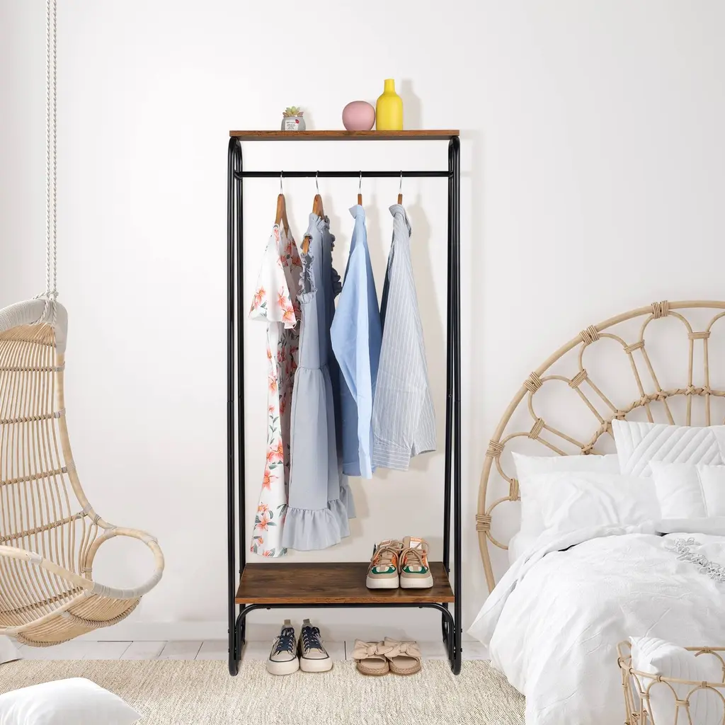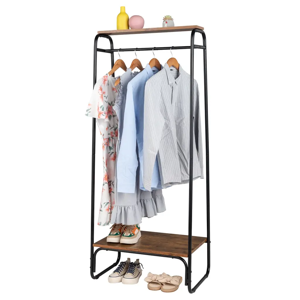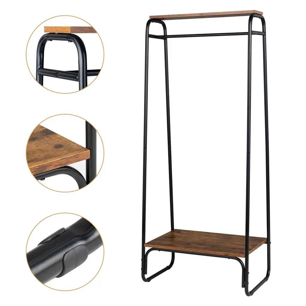 Specification:Key Features:Description:This freestanding clothing rack with a wood shelf offers versatile storage and organization for your home. Made from sturdy MDF and metal, this garment rack features a clothes pole and additional shelving for storing clothes, shoes, accessories, and more. Its compact design makes it perfect for small spaces, such as bedrooms, living rooms, or even commercial settings like clothing stores. Easy to assemble with included tools and instructions, it’s a practical and stylish solution for keeping your space tidy and organized. Available in white or black to complement any room décor.