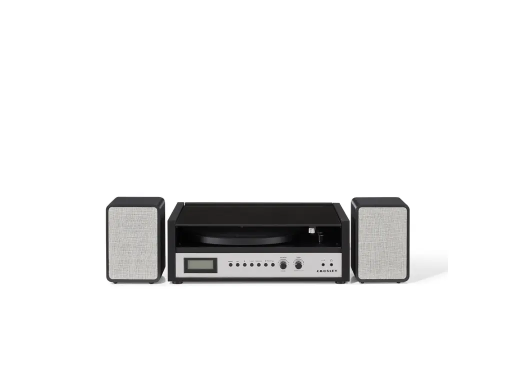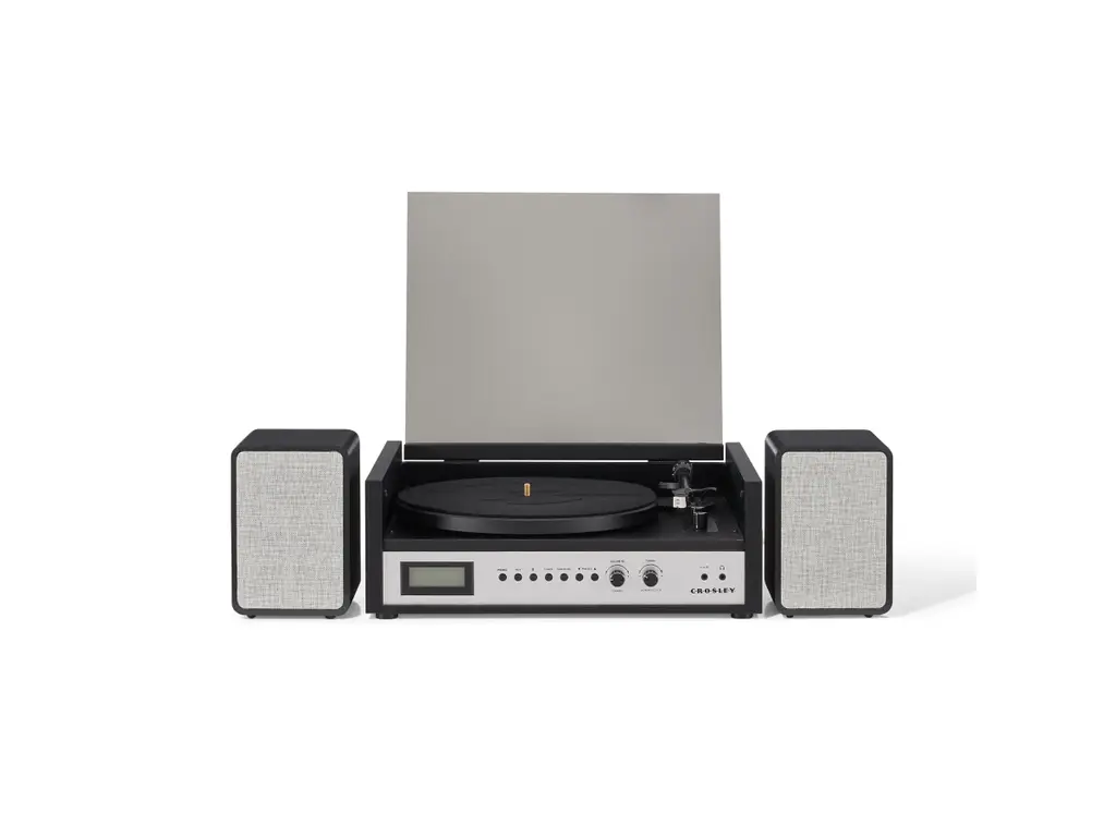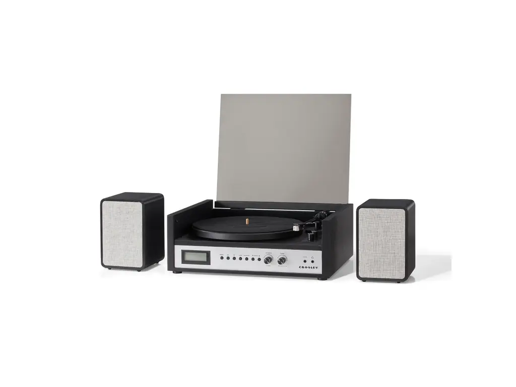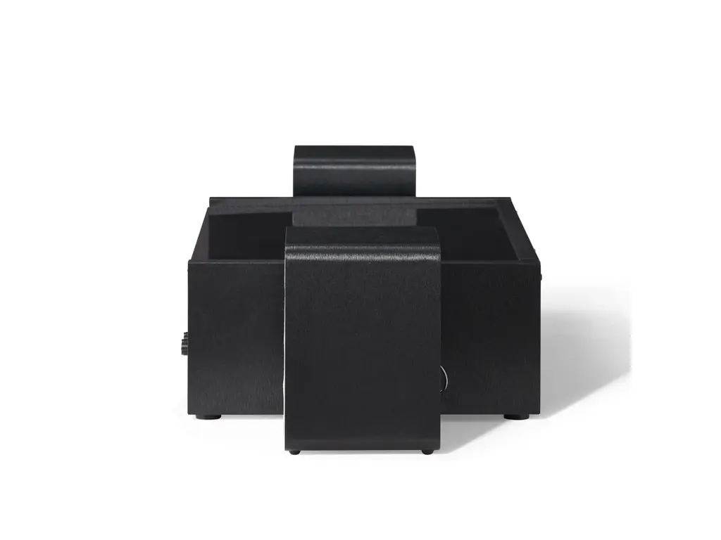 Give your record collection a level up in technical sophistication with the Coda shelf system. This sleek system was designed with high-end modern interiors serving as inspiration. Pick out your favorite record, choose between three speeds (33 1/3, 45, & 78 RPM), drop the fully manual tone arm with mounted moving magnetic cartridge onto your vinyl and start listening to music the way the artist intended— through matching stereo speakers. When you are not spinning vinyl, lower the dust cover and keep it clean while looking chic. Want a break from analog? Connect to the built-in Bluetooth® receiver and stream your favorite playlist or switch over to the AM/FM radio to tune in to your local public station.