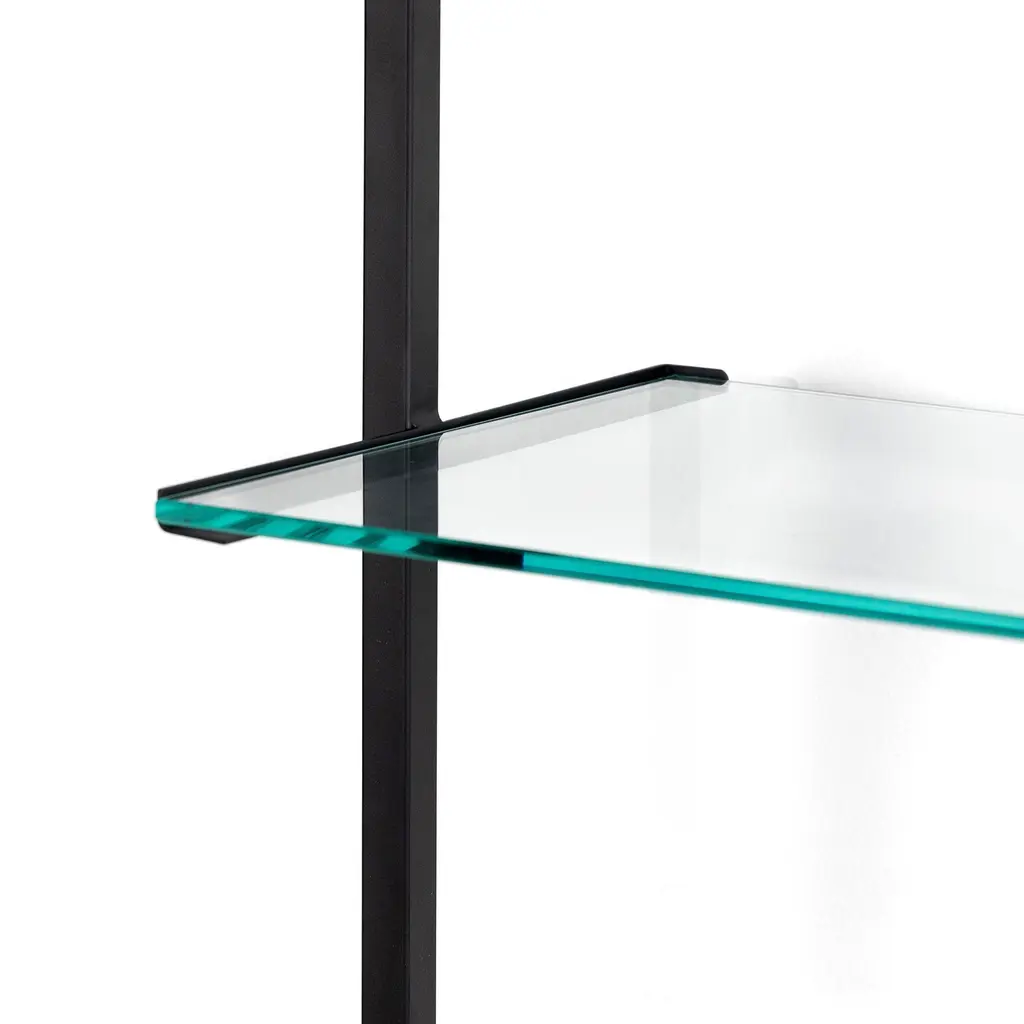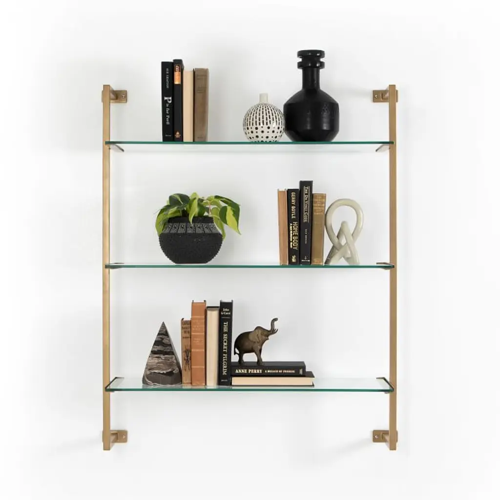 COPY 36"w x 11.75"d x 42.75"h (30 lb. capacity). Assembled weight: 40 lbs. Iron brackets in an Antique Gold finish. Tempered glass shelves. Hanging hardware included. Sold individually. Made in India.