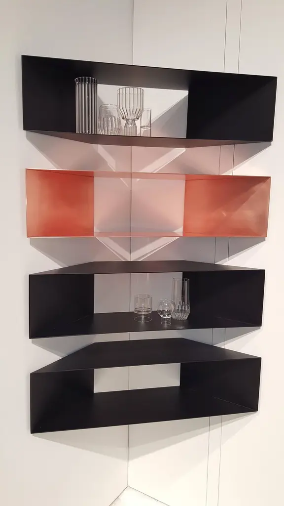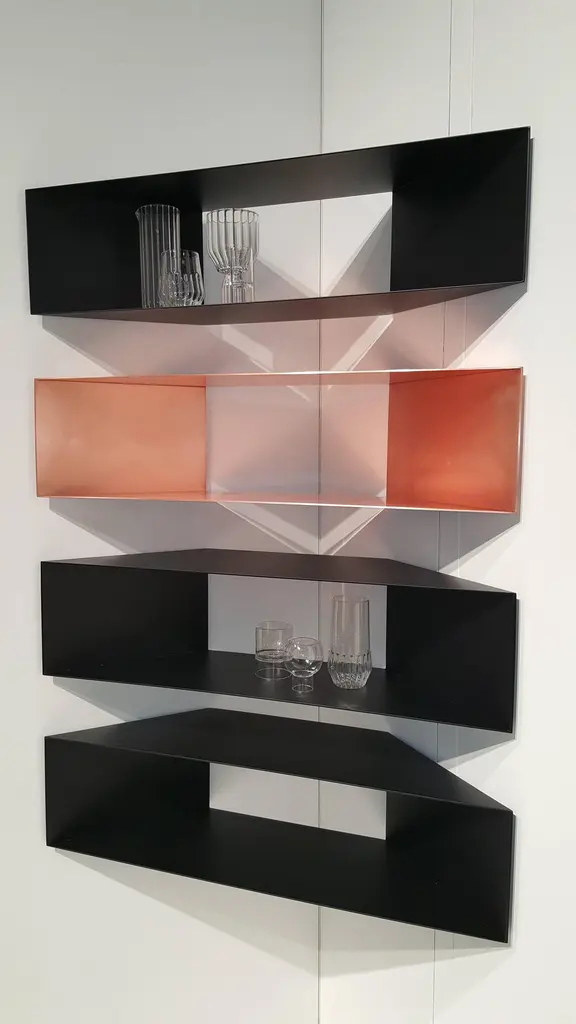 This contemporary sculptural single metal minimal corner shelf is perfect for any space be it a living room, office, or bathroom.In stock: These Minimalist shelves, whether installed individually or in a series, occupy a space in a room often overlooked. Perfection solution for a drybar, bookshelf, wall sculpture, or a catchall. They are striking simple and can be used for any number of objects or books, or even left empty. Custom finishes, metals, and sizes are available upon request. Handcrafted and hand-painted in Chicago, each piece is carefully constructed by the finest fabricators in the US. Available in copper finish or hand-painted black.Design: Felicia Ferrone, 2014Handcrafted in ChicagoMaterial • powder coated steel steelType • shelfSize • H 23 cm (9 in) x W 91cm (36 in), D 25 cm (10 in).