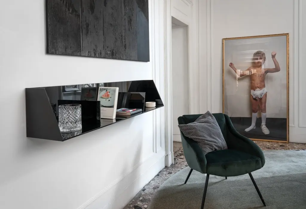 Corbel shelf by MentemanoDimensions: 116 x 42 x H 190.5 cmMaterials: tempered glassMentemano is a design concept brand leading to a precise matter: is the “mente” (mind) leading the “mano” (hand) to create a piece of furniture or instead the opposite, having the mind as source of inspiration to conceive the project? ? All products designed by Nicola Gisonda are influenced by a unique architectural perception and based on focus to materials, space and function. ? The collection is fully Made in Italy, working with local artisans from Lombardy region. High quality, Italian craftsmanship and lifetime allure are the key points of products by Mentemano.Nicola GisondaBorn and raised in Milan, Italy, Nicola Gisonda is an architect and designer graduated at Politecnico di Milano.His activity ranges from redevelopment projects to industrial design, from design concept development for public spaces to interior design solutions.During the last years architect Gisonda has been particularly involved in the renovation of abandoned industrial areas. Among his known projects, we find Officine del Volo in Milan, Italy. Nowadays a real key place of the city, completely restored according to Gisonda own project and born from the ashes of former Officine Aeronautiche Caproni di Taliedo, historical aircraft factory during World Wars time.His activity as a designer, in addition to collaborations with different companies of the interior design world, currently sees him engaged in the creation of furniture accessories for his own brand: Mentemano. An idea born from the desire to offer furniture pieces with strong architectural nature, defined by clean and minimal lines in which matter and function finally find their meeting point.Learn more.