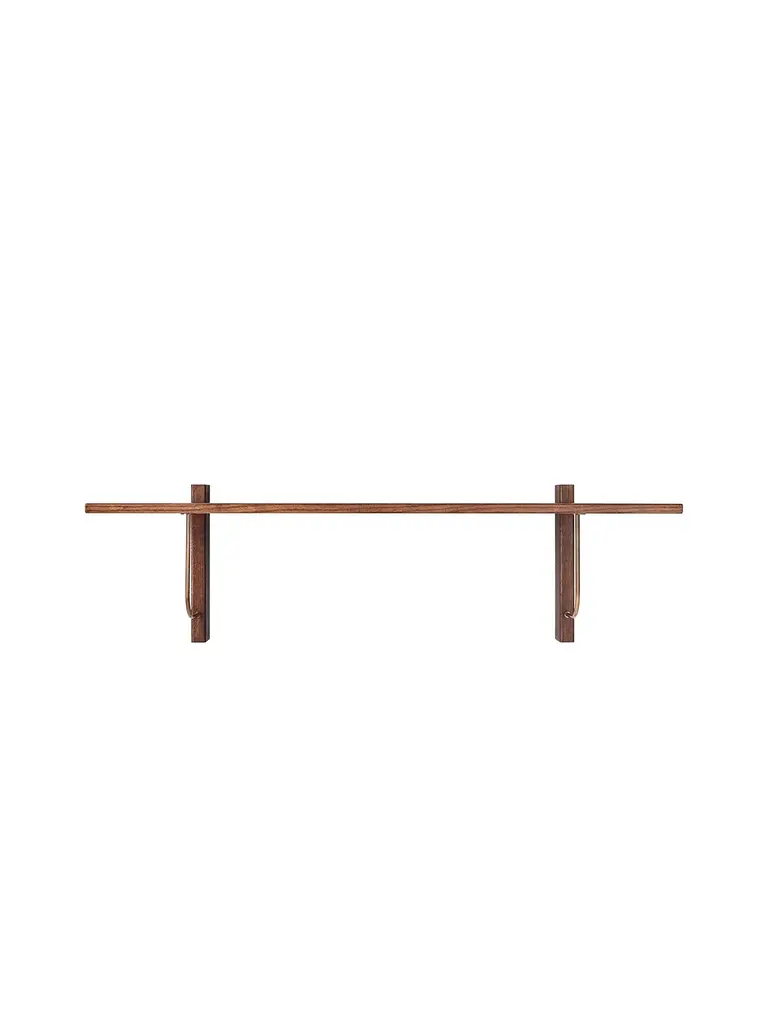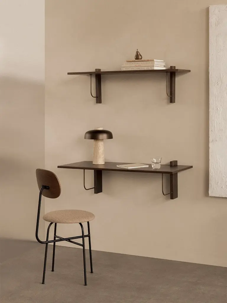 The Corbel Shelf takes its name and design cues from architectural weight-bearing brackets traditionally made from stone or wood. Designed for versatility, it serves a range of different purposes and needs in dining, kitchen and living room areas, maximizing the utility of a space and infusing the design with a sense of structural elegance. The shelf can also be paired with the corresponding desk to create a minimalist home office. thoughtfully crafted to maintain a clean and decluttered aesthetic. The small distance to the wall allows for neat cord management. The wall-mounted design is offered in marble or dark-stained oak with dark-stained oak and bronzed steel brackets, catering to different interior styles and preferences.