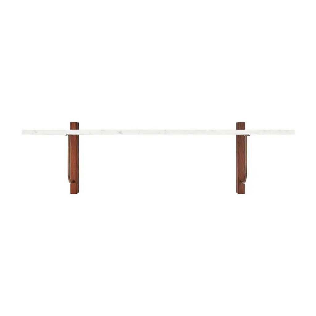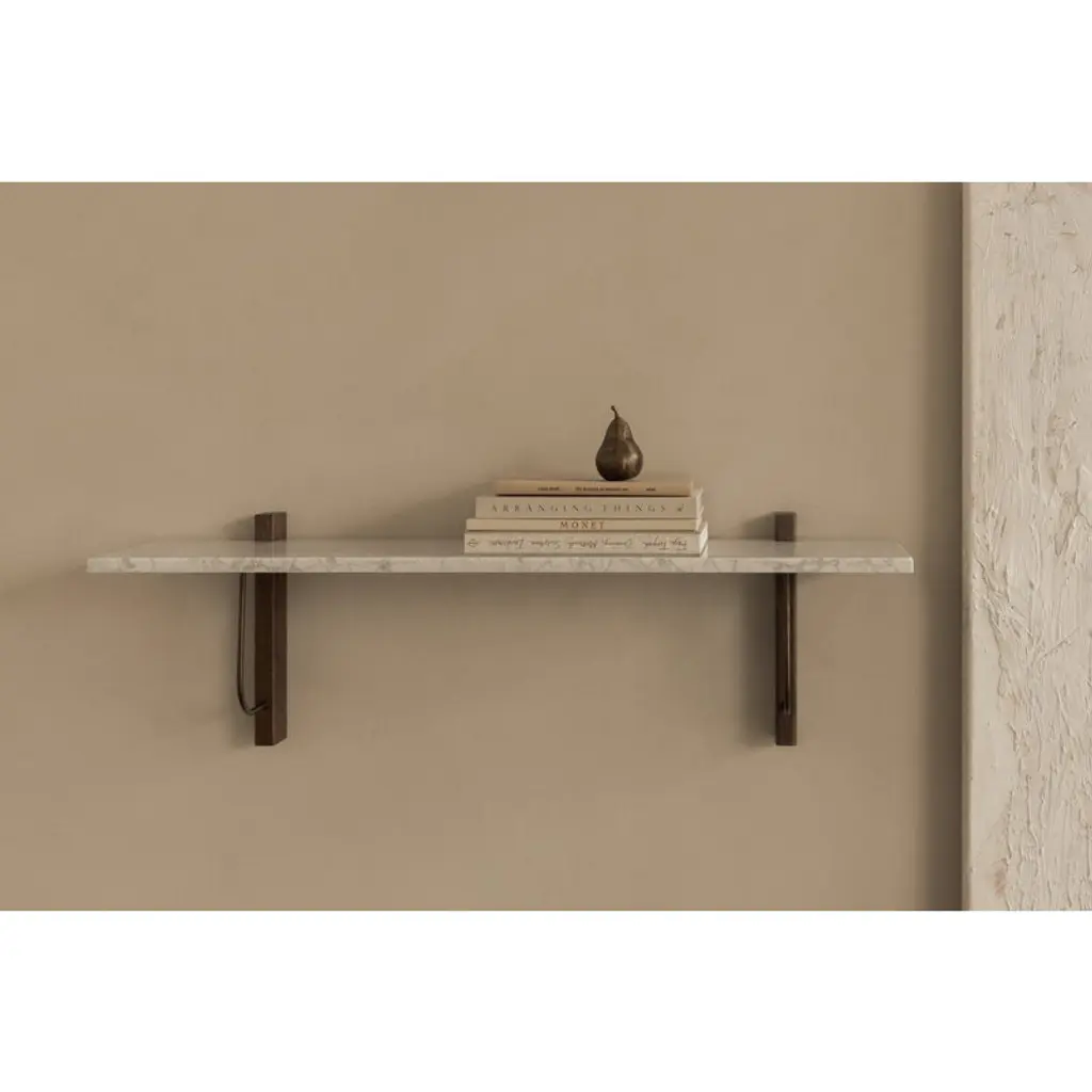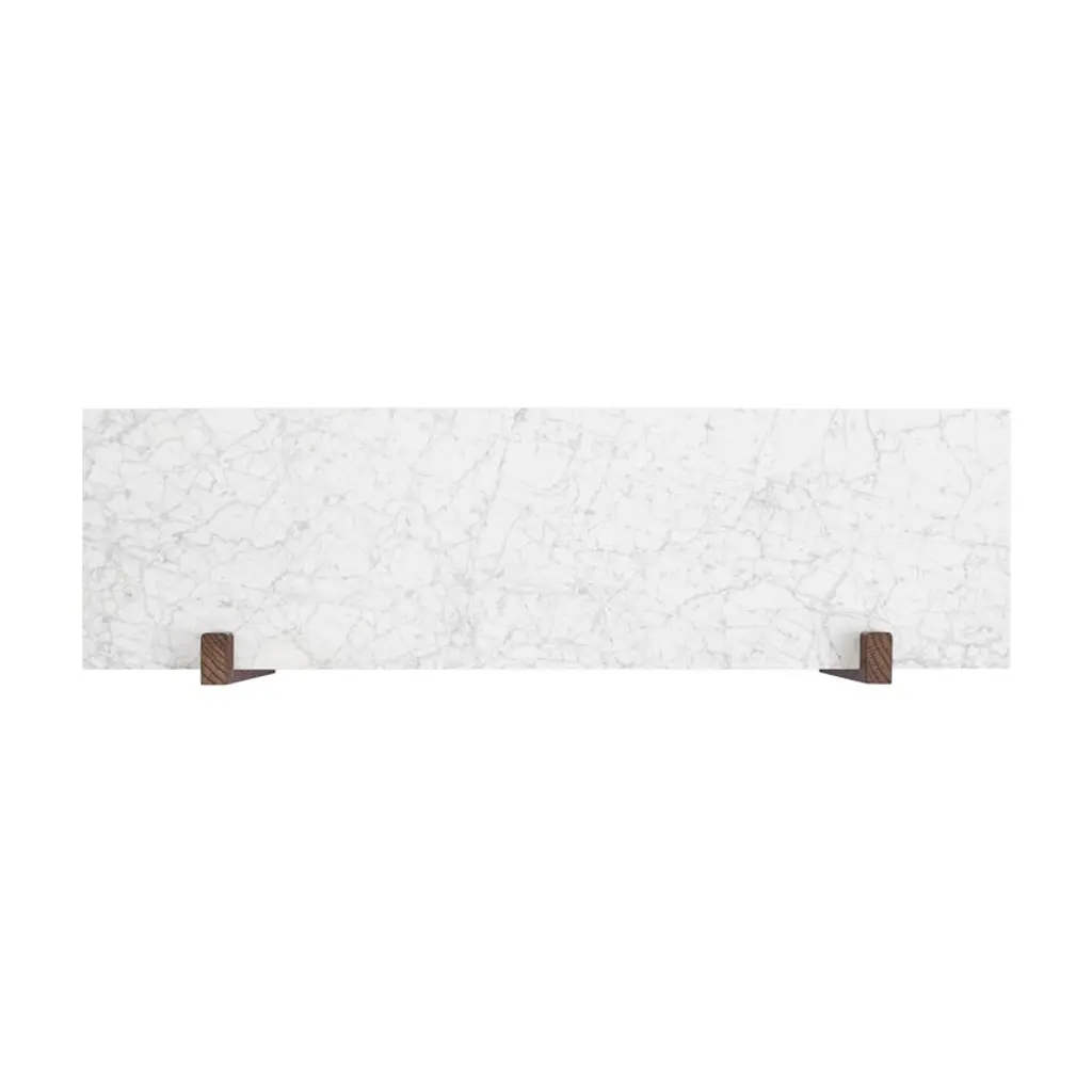 Audo Copenhagen's Corbel shelf is an elegant, modern wall shelf combining a rectangular, white marble top with brackets made of dark-stained oak wood and bronzed steel. Designed by studio Krøyer-Sætter-Lassen, the Corbel shelf takes its name and design cues from the weight-bearing corbels used in buildings. Adapting beautifully to any environment, this minimalist wall shelf is suitable for use as a wall-mounted nightstand or side table as well as a platform for storing and displaying your favorite objects. The large wall shelf pairs seamlessly with the matching desk from the same collection, and it features a small gap between the shelf and the wall for tidy cable management.