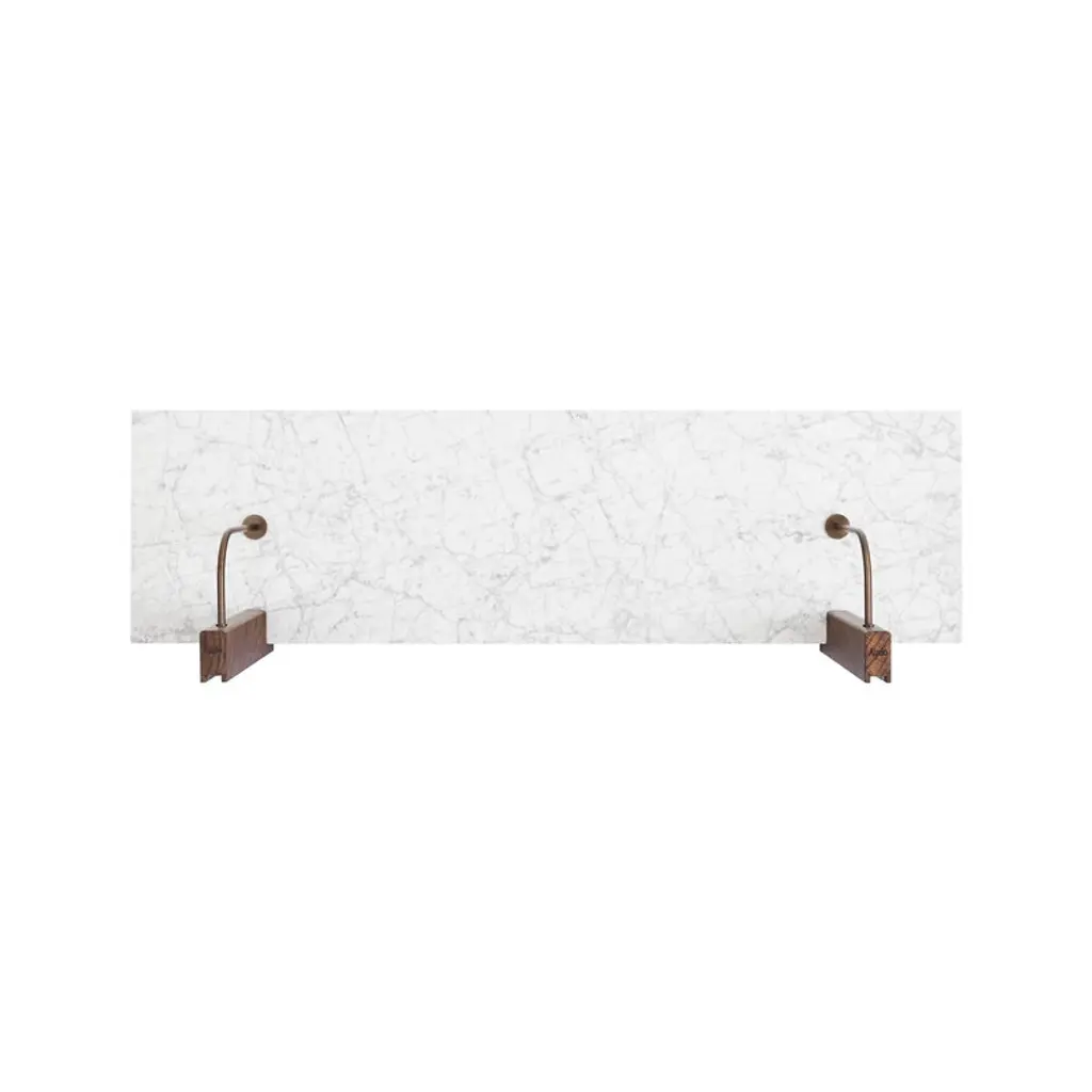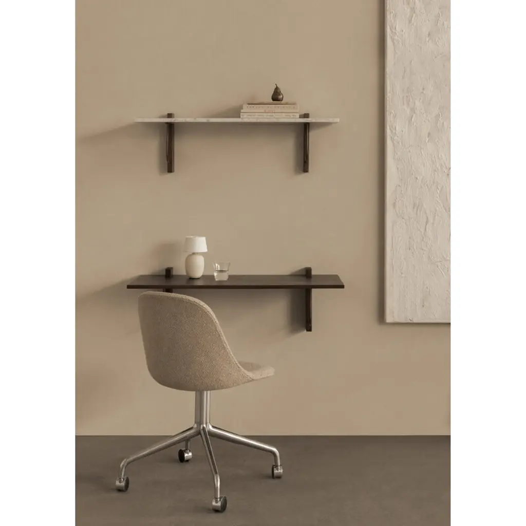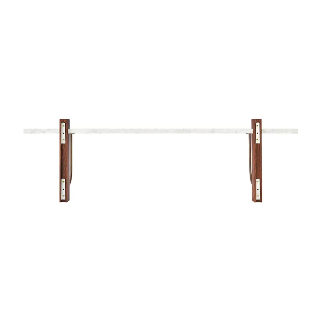 Audo Copenhagen's Corbel shelf is an elegant, modern wall shelf combining a rectangular, white marble top with brackets made of dark-stained oak wood and bronzed steel. Designed by studio Krøyer-Sætter-Lassen, the Corbel shelf takes its name and design cues from the weight-bearing corbels used in buildings. Adapting beautifully to any environment, this minimalist wall shelf is suitable for use as a wall-mounted nightstand or side table as well as a platform for storing and displaying your favorite objects. The large wall shelf pairs seamlessly with the matching desk from the same collection, and it features a small gap between the shelf and the wall for tidy cable management.