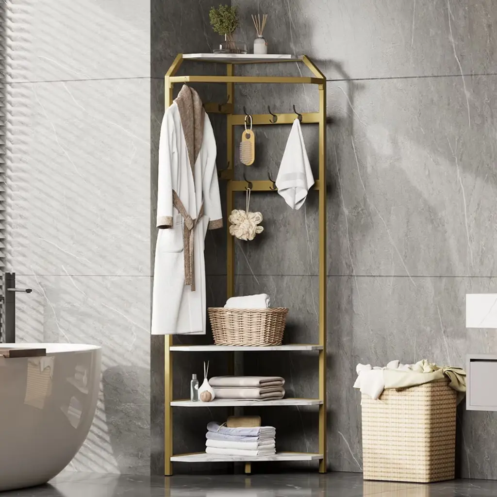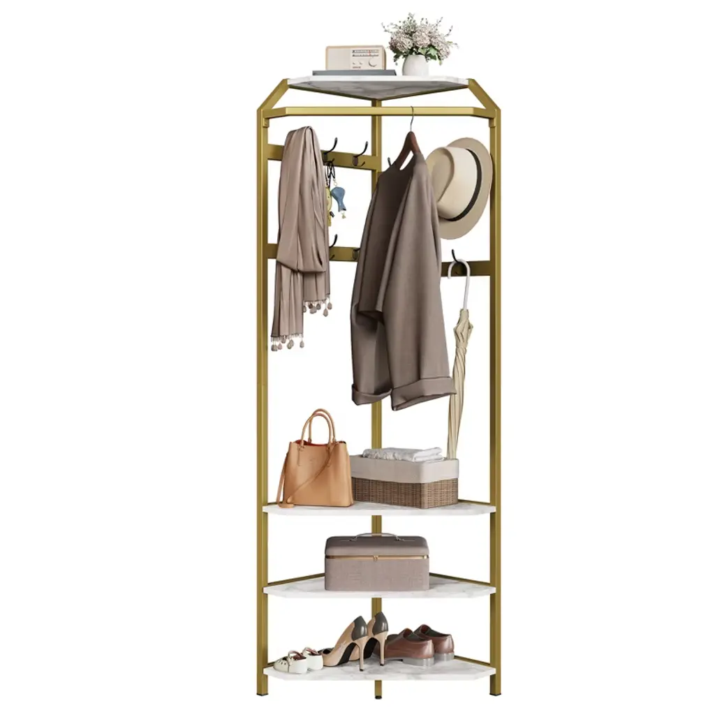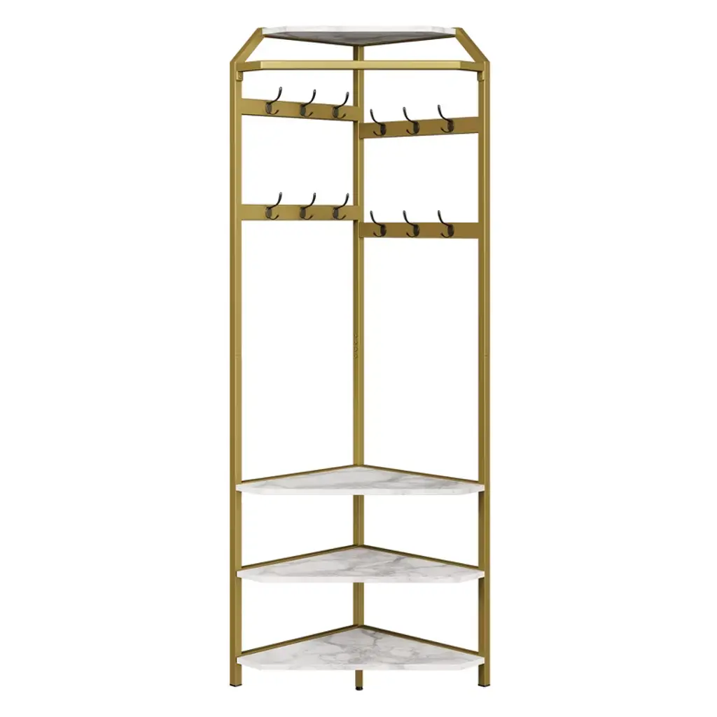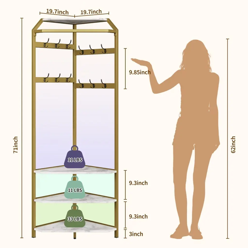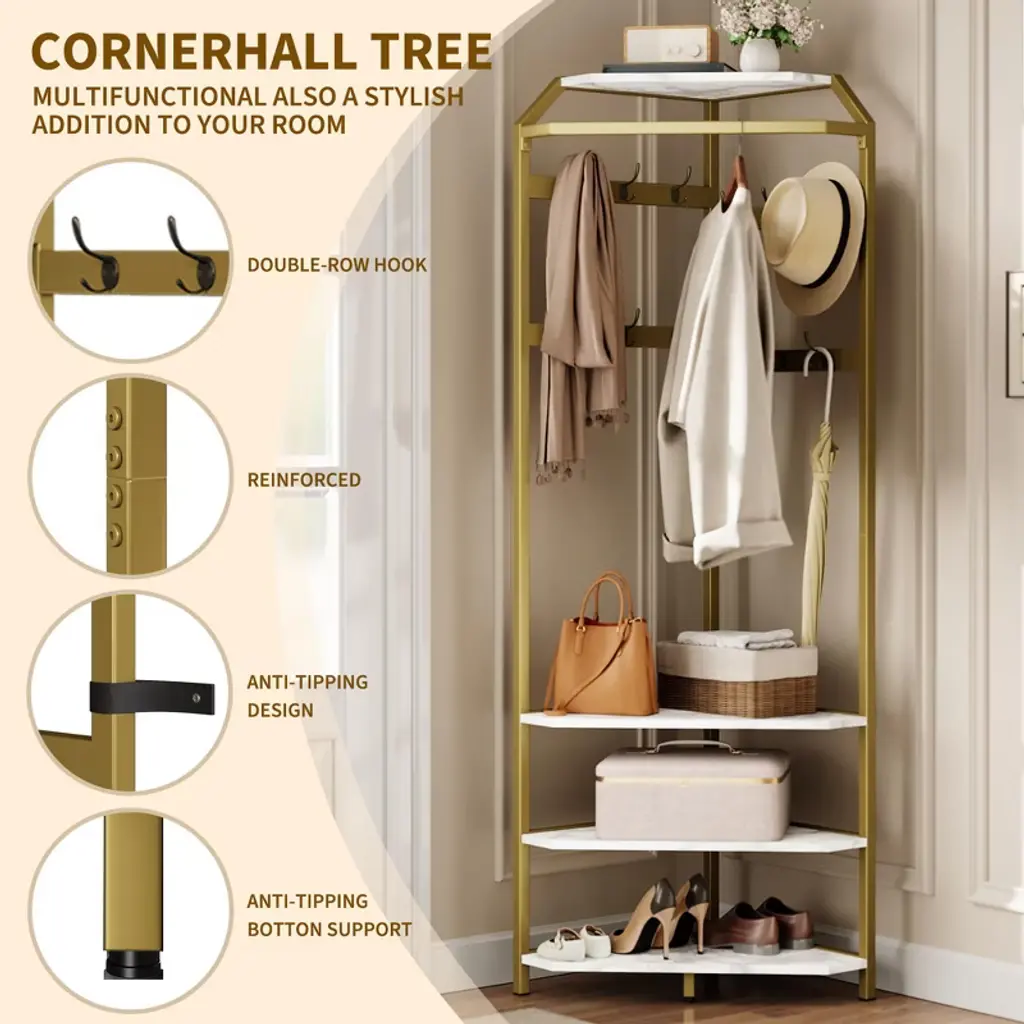 Corner Hall Tree With Shoe Bench, Entryway Corner Coat Rack With 12 Hooks, Freestanding Clothes Rack With Storage Organizer Shelf For Entryway, Gold