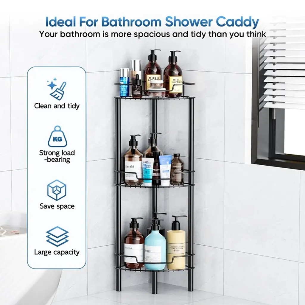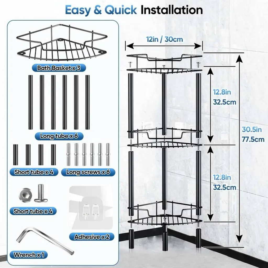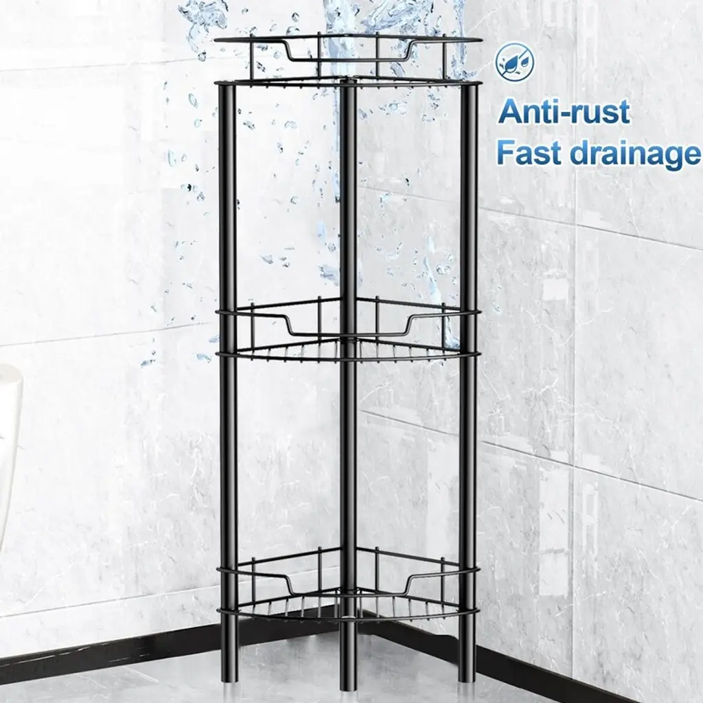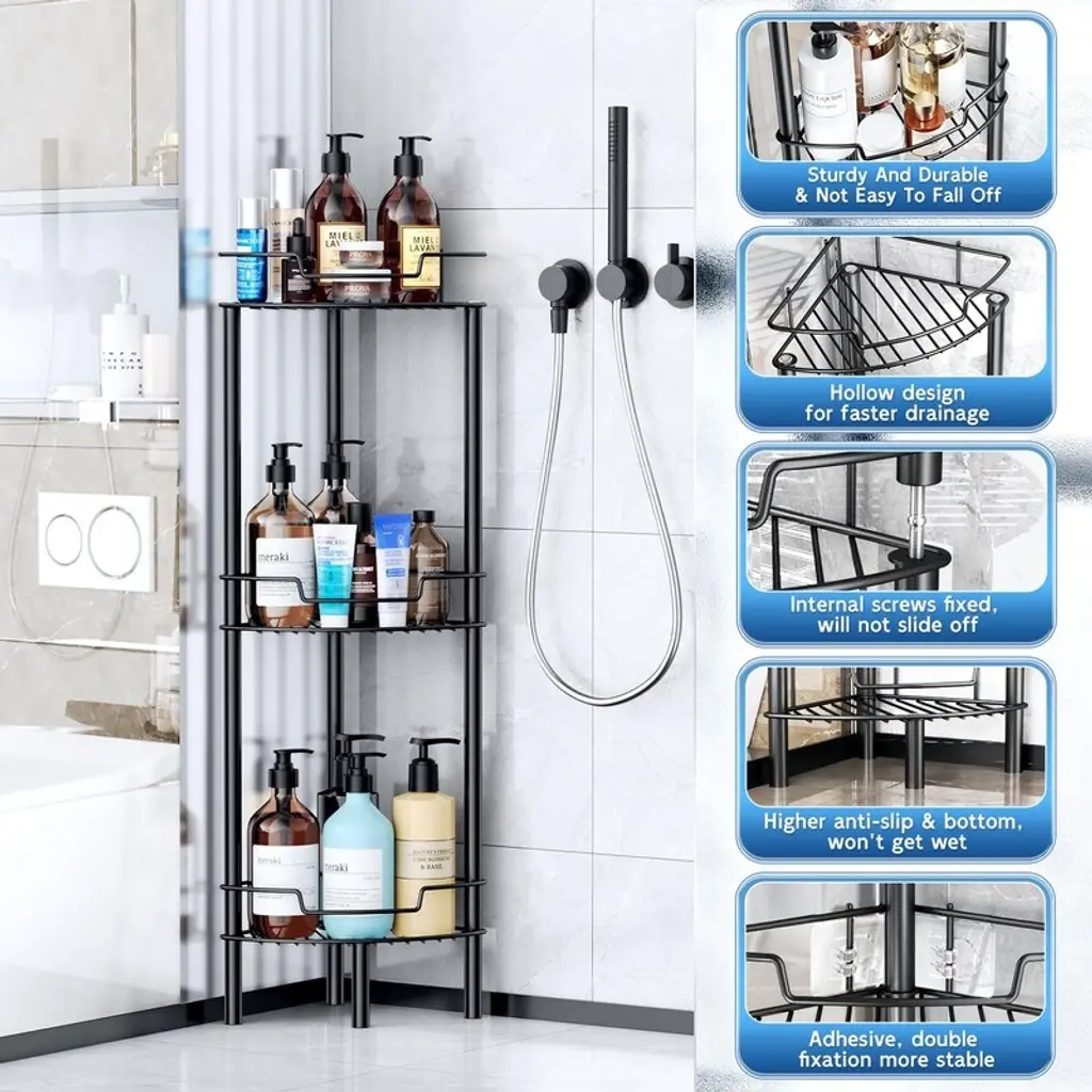 Crafted from premium SUS304 stainless steel with rust-resistant coating, this shower caddy combines durability with smart ventilation. The hollow basket design promotes excellent airflow and water drainage, preventing moisture buildup while making cleaning effortless - perfect for humid bathroom environments.Featuring an efficient L-shaped 90° corner design with protective side rails, this organizer maximizes unused shower space while keeping items securely contained. The vertical construction creates a neat, spacious bathroom appearance (note: requires level flooring for optimal stability).With four roomy tiers each supporting up to 50lbs, this caddy provides exceptional storage capacity without clutter. The generous spacing accommodates oversized shampoo and body wash bottles, transforming chaotic bathrooms into organized retreats with everything conveniently accessible.Assembly requires no drilling or adhesives - simply twist the rods and baskets together for tool-free setup in minutes. The modular design allows customizable configuration of shelf tiers and easy relocation without damaging walls or ceilings.Four height-adjustable feet with non-slip rubber pads ensure stability on various surfaces while keeping the unit elevated above standing water. This versatile solution fits most corners in showers, bathtubs, kitchens, or RVs, helping optimize every inch of your space. Customer satisfaction guaranteed.