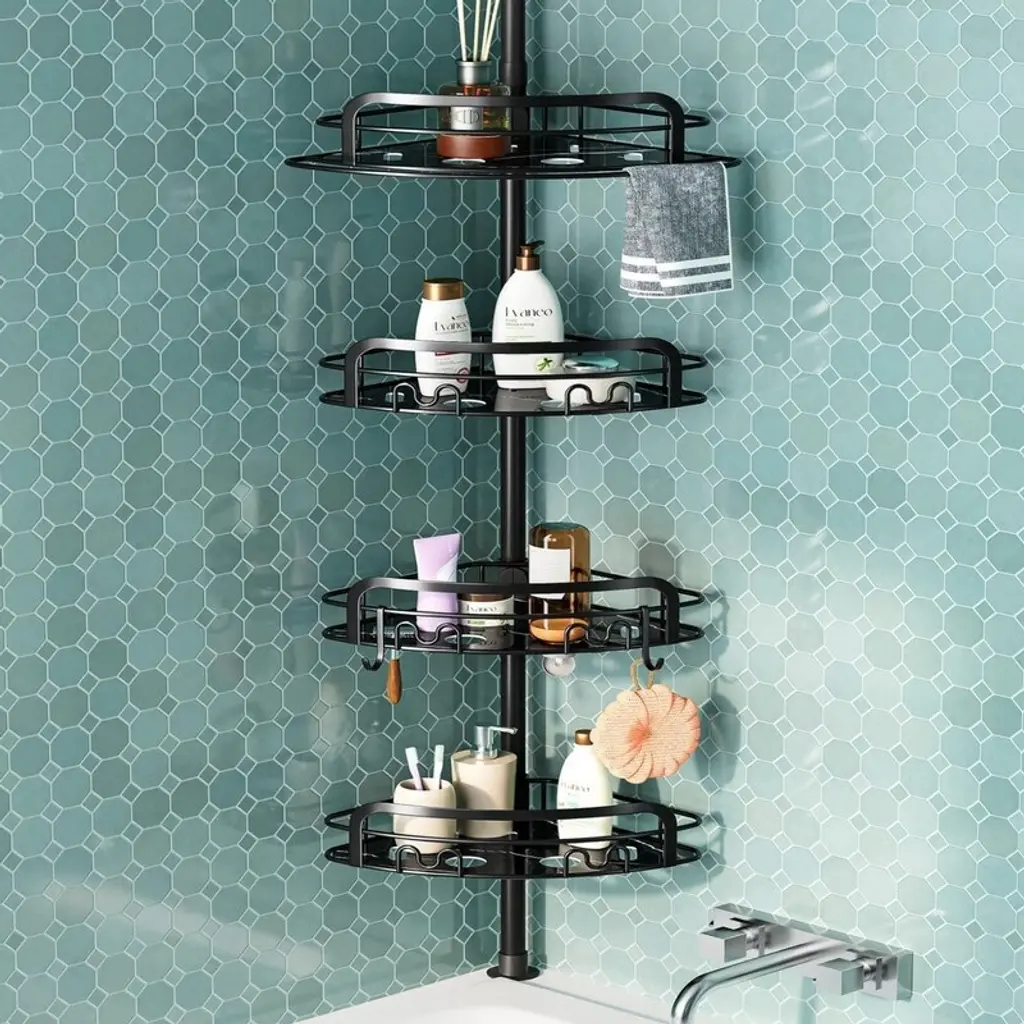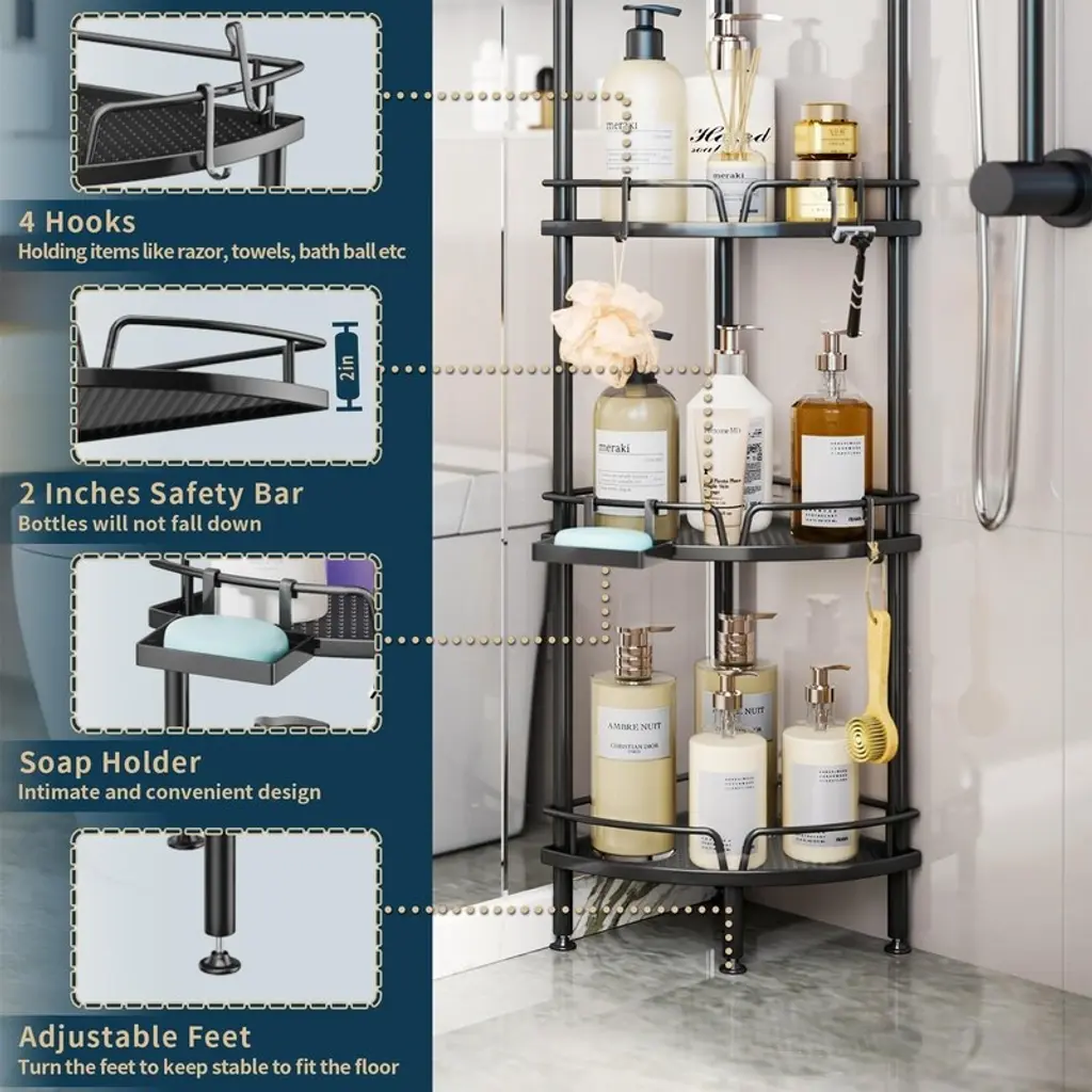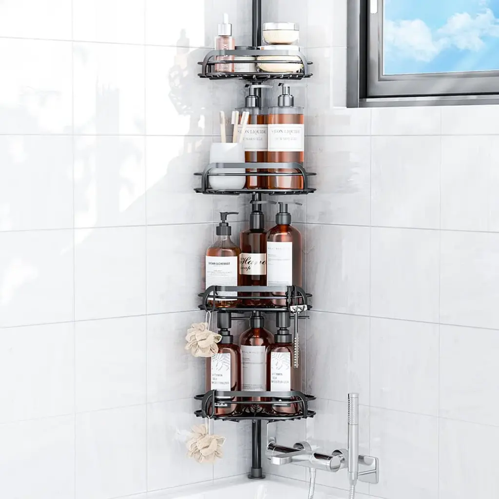 Concerned about a swinging, unstable shower caddy? This corner shower caddy features premium stainless steel and an adjustable base. You can adjust the shower shelf until it's level, ensuring sturdiness and rust - proofing.The sidebar on this standing shower caddy, with 2 - inch - high side rails, prevents shower essentials like shampoo and shower gel from falling, allowing you to enjoy your shower worry - free.With 4 hanging hooks on the side of the shower rack and an additional soap holder, this caddy offers extra storage. Hang bath balls, razors, and towels on the hooks, and keep your shower supplies within easy reach, keeping your bathroom tidy.The corner shower shelf has 4 rubber - made adjustable feet. They help keep the caddy level on uneven bathroom floors and prevent floor damage or rust marks.Measuring 9.7*9.7*43 inches, this standing shower caddy fits various bathrooms. The 13 - inch height between shelves provides ample space for a large amount of family toiletries such as shampoo and body wash.The caddy comes with a user manual, enabling easy installation. You can set up this functional bathroom stand - up shower caddy in just three minutes.