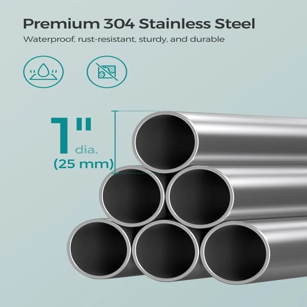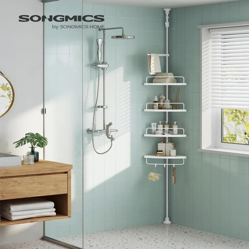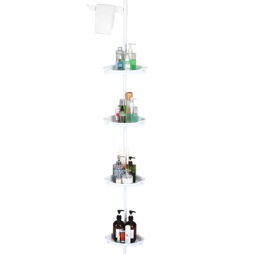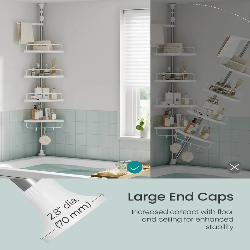 【MAXIMIZE YOUR BATHROOM SPACE】Designed for small bathrooms, this corner shower caddy efficiently utilizes corner space to keep your shower essentials organized and your bathroom tidy【AMPLE & VERSATILE STORAGE】With 4 trays, 3 hooks, and a towel bar, this floor-to-ceiling shower shelf offers ample and versatile storage for all your shower essentials【RUST-RESISTANT & DURABLE】Constructed from premium PP plastic and 304 stainless steel, this corner shower shelf is rust-resistant and built to last, ensuring reliable use in your bathroom【CUSTOMIZABLE TRAYS WITH DRAINAGE】Easily adjust the height and rotation of the 4 trays in this shower organizer. Guard rails secure items, while drainage holes prevent pooling, promoting efficient organization and cleanliness in your bathroom【ADJUSTABLE HEIGHT & TOOL-FREE ASSEMBLY】The robust tension pole, adjustable from 35.8" to 118.1", features a stable locking knob design. With a built-in spring and end caps, you can set it up in minutes without drills, protecting your floor and ceiling