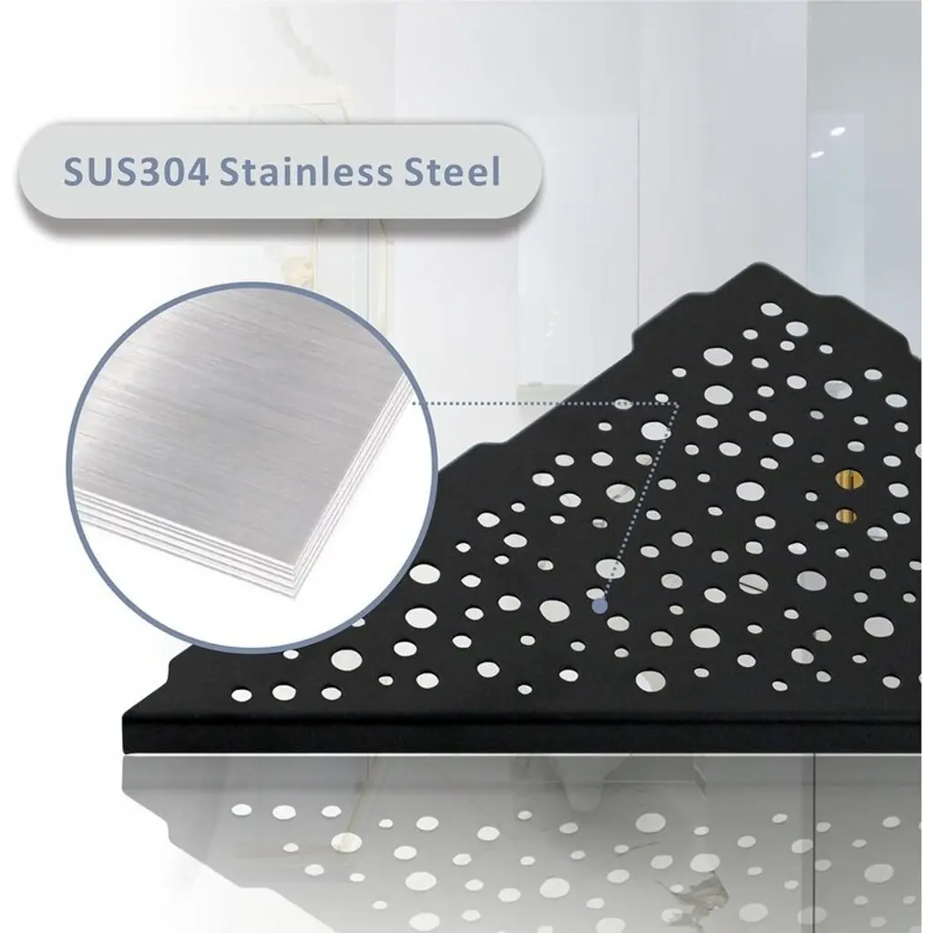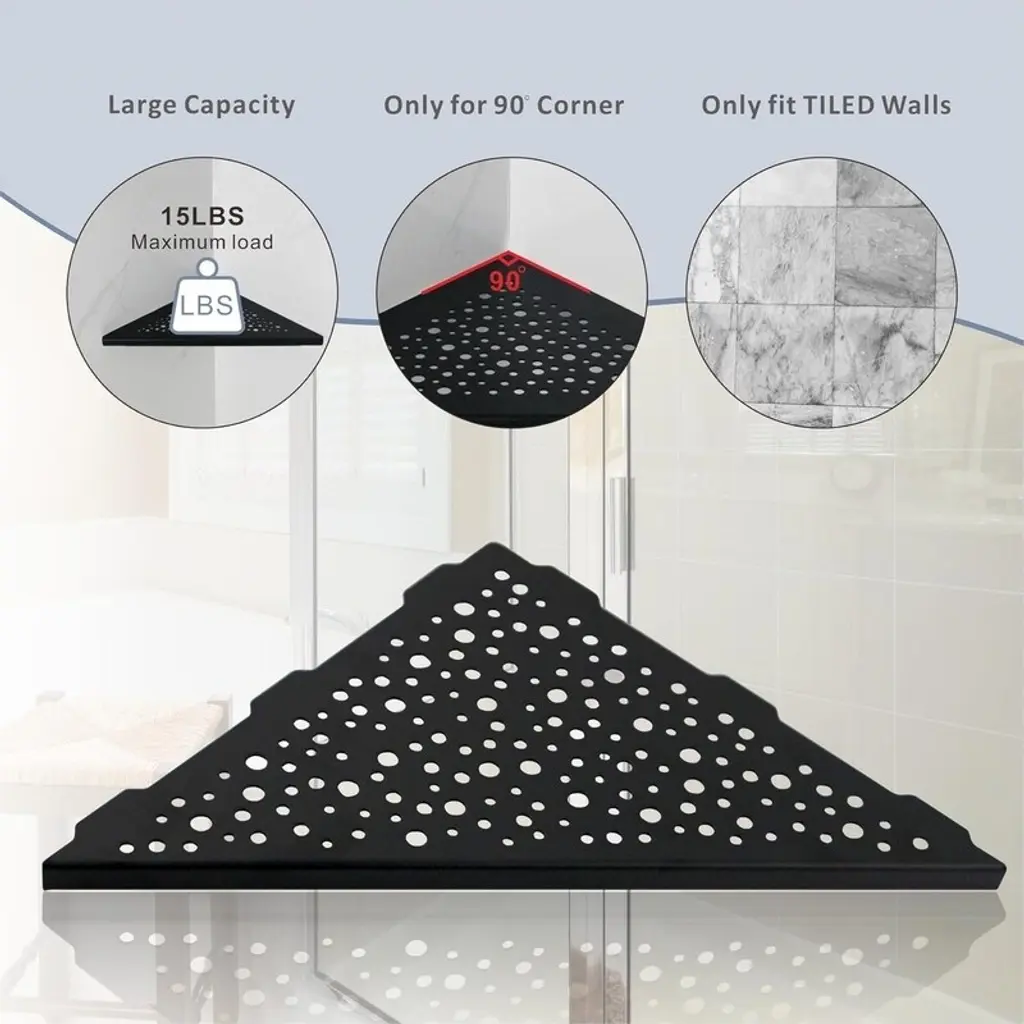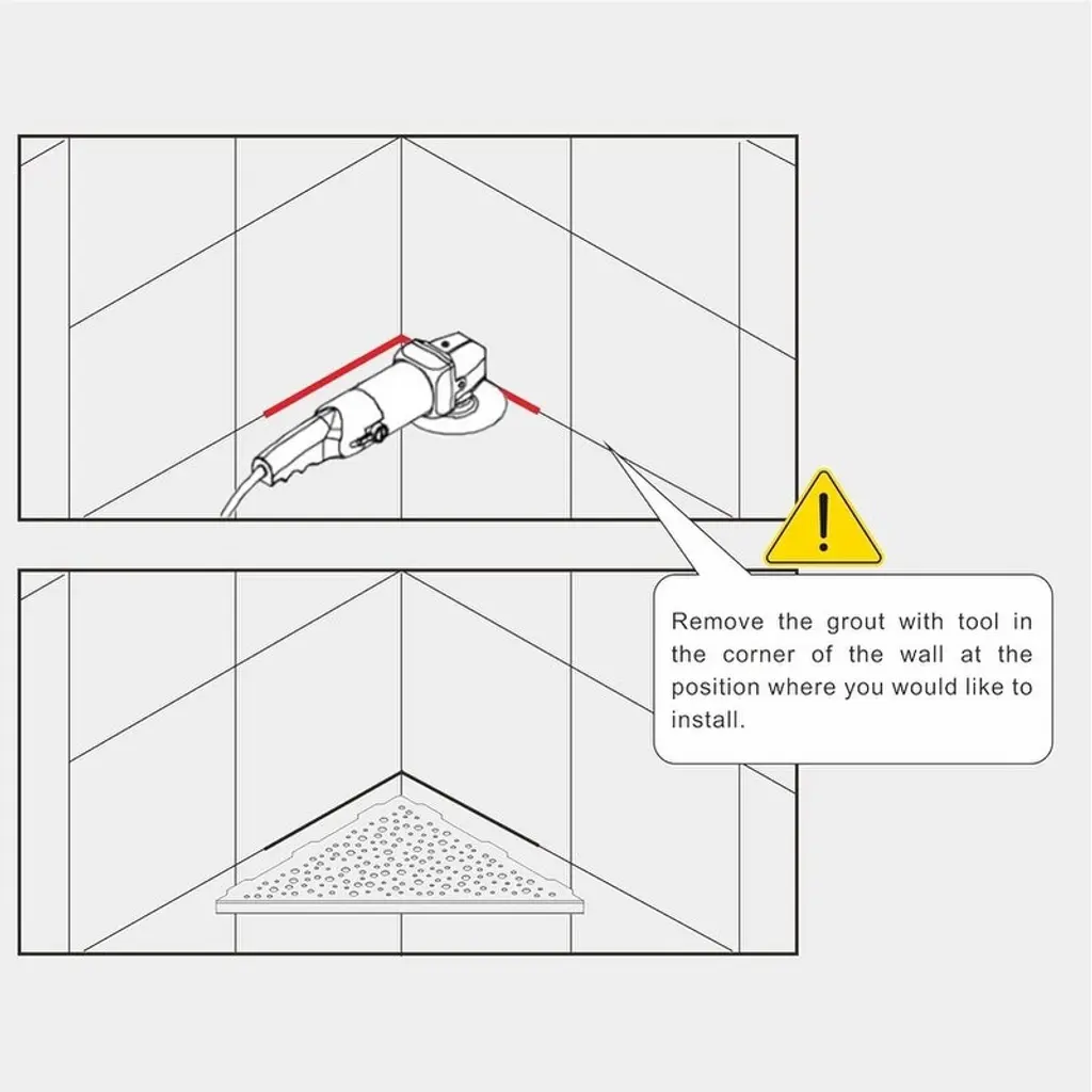 Premium SUS304 Stainless Steel – Constructed with 1.5mm thick high-grade stainless steel featuring a scratch-resistant brushed matte finish, each shelf supports up to 15 lbs for long-lasting durability.Scratch-Safe & Spacious Storage – Smooth stainless steel surface protects your items while offering ample space to organize all bathroom essentials without clutter.Quick-Dry & Low-Maintenance – Hollowed design ensures fast drainage to keep products dry, while the open-frame structure allows effortless cleaning with just a quick wipe.Versatile Multi-Space Use – Perfect for 90° tiled corners in bathrooms, kitchens, or balconies—ideal for both compact and spacious areas with its sleek, modern design.Grout-Mount for Easy Installation – No drilling or adhesives needed—simply embed into tile grout for a secure, wobble-free mount that saves time and maximizes space efficiency.