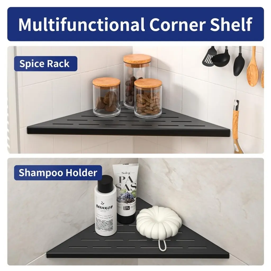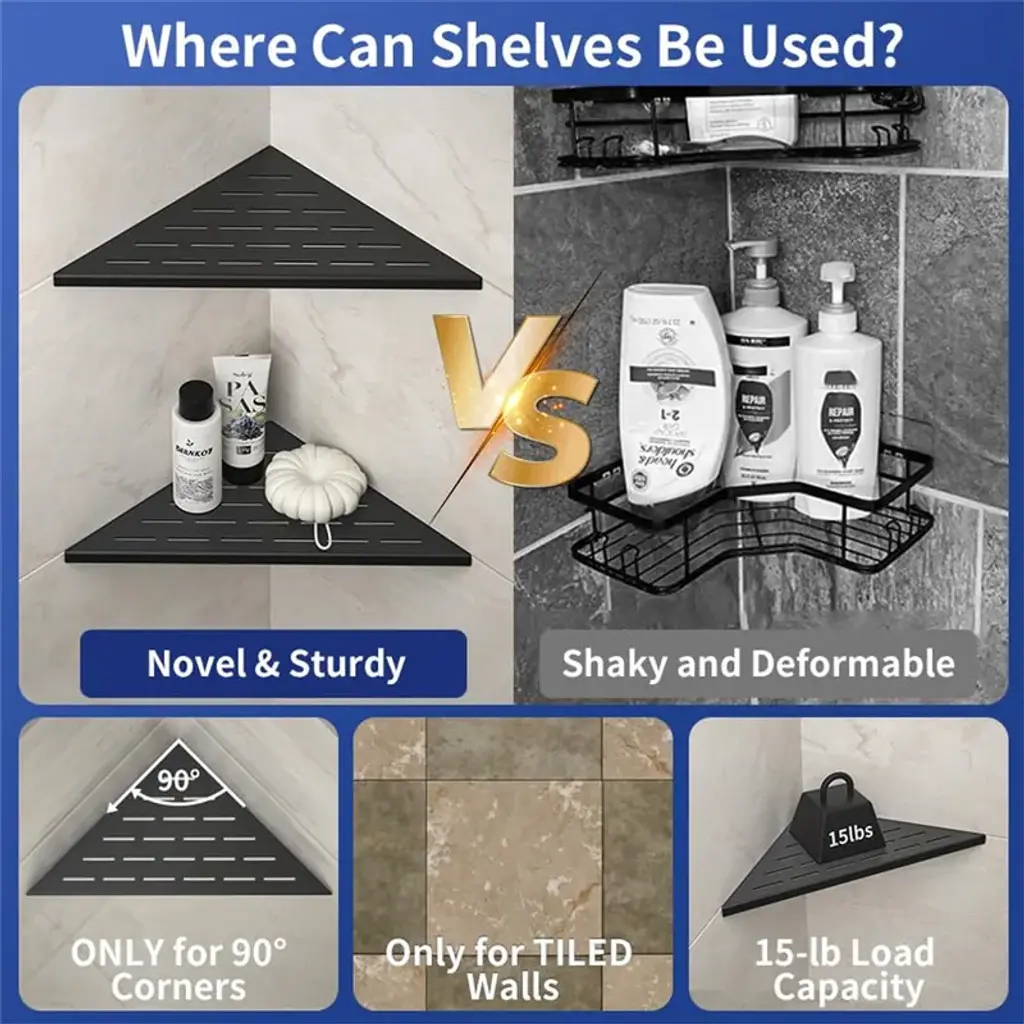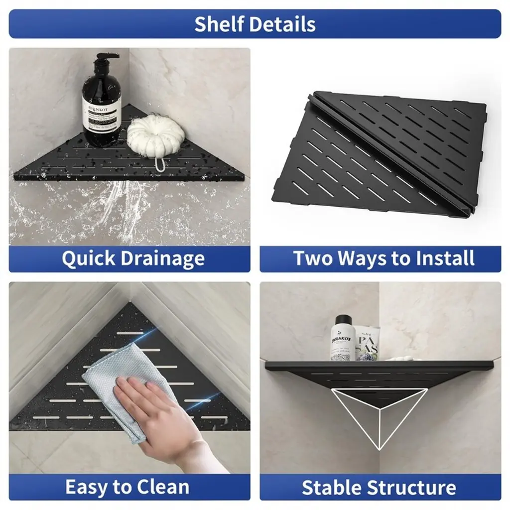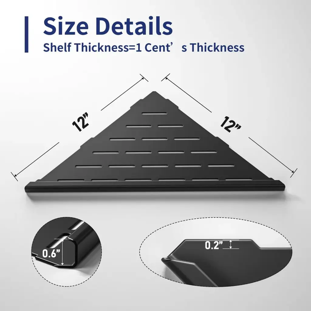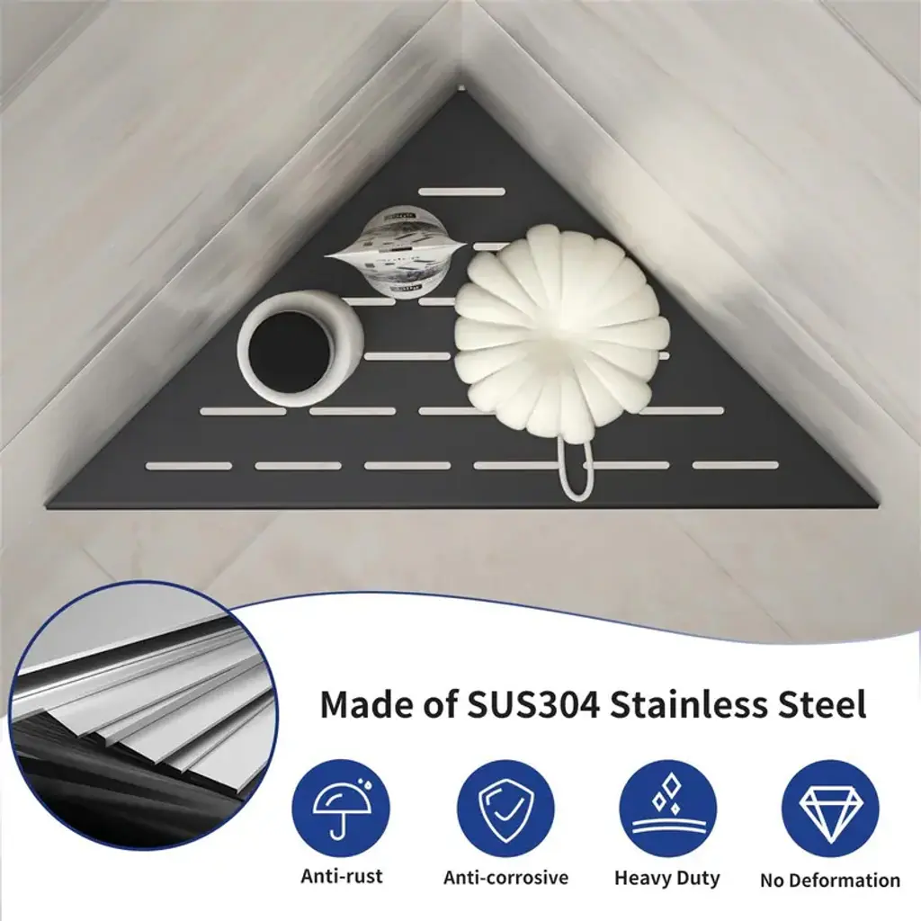 304 Stainless Steel 【SUS304 Durable & Heavy Duty】Our bathroom shelves are made of ASTM standard 304 stainless steel, which can protect against corrosion, scratches and rust for long-lasting durability. With 1.5 mm thickness can hold up to 15 pounds per shelf. These shelves are designed for TILED WALL. No drilling or adhesive needed. 【Two Ways to Install】Side A, stainless surface with modern design makes your bathroom elegant. Smooth surface will not scratch or damage your items. Side B, corner shelf with rail can protect your goods from falling down. Choose one surface you prefer when installation. No drilling and damage to the wall. 【Space Saving & Modern Style】Our corner floating shelves are designed for organizing your bathroom and kitchen. They are ideal for holding your shampoo, body wash, cream, razor, seasonings and more. Please note that shelves are ONLY for 90°corners, it is a great choice for both narrow and broad bathroom spaces. 【Rapid Drainage】No water pooling. Slots on corner shelf can make water drain fast and keep your bath products on the shower shelf dry and clean. It can also be used as a footrest when shaving. Matching shower drain grates and shower niches are also available.