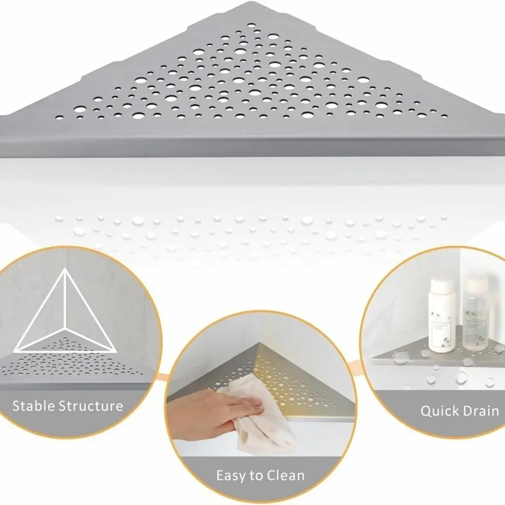 Premium 304 Stainless Steel – Made with high-quality rust-resistant 304 stainless steel for long-lasting durability, ensuring your shower shelves maintain both style and functionality over time.No-Tool, Hassle-Free Installation – Specifically designed for 90° tiled corners with a no-drill, no-adhesive setup, offering a seamless and secure fit without damaging walls.Spacious & Sturdy Storage – Features a 10-inch shelf with a 15-pound weight capacity, providing ample space for shampoo, conditioner, and body wash without sagging or bending.Quick-Dry & Easy-Clean Design – Hollowed construction promotes fast drainage and airflow, while the fingerprint-resistant matte black finish keeps surfaces looking pristine with minimal maintenance.Space-Saving 2-Pack Set – Maximizes unused corner space to declutter your shower, keeping essentials organized and within easy reach for a sleek, modern bathroom upgrade.