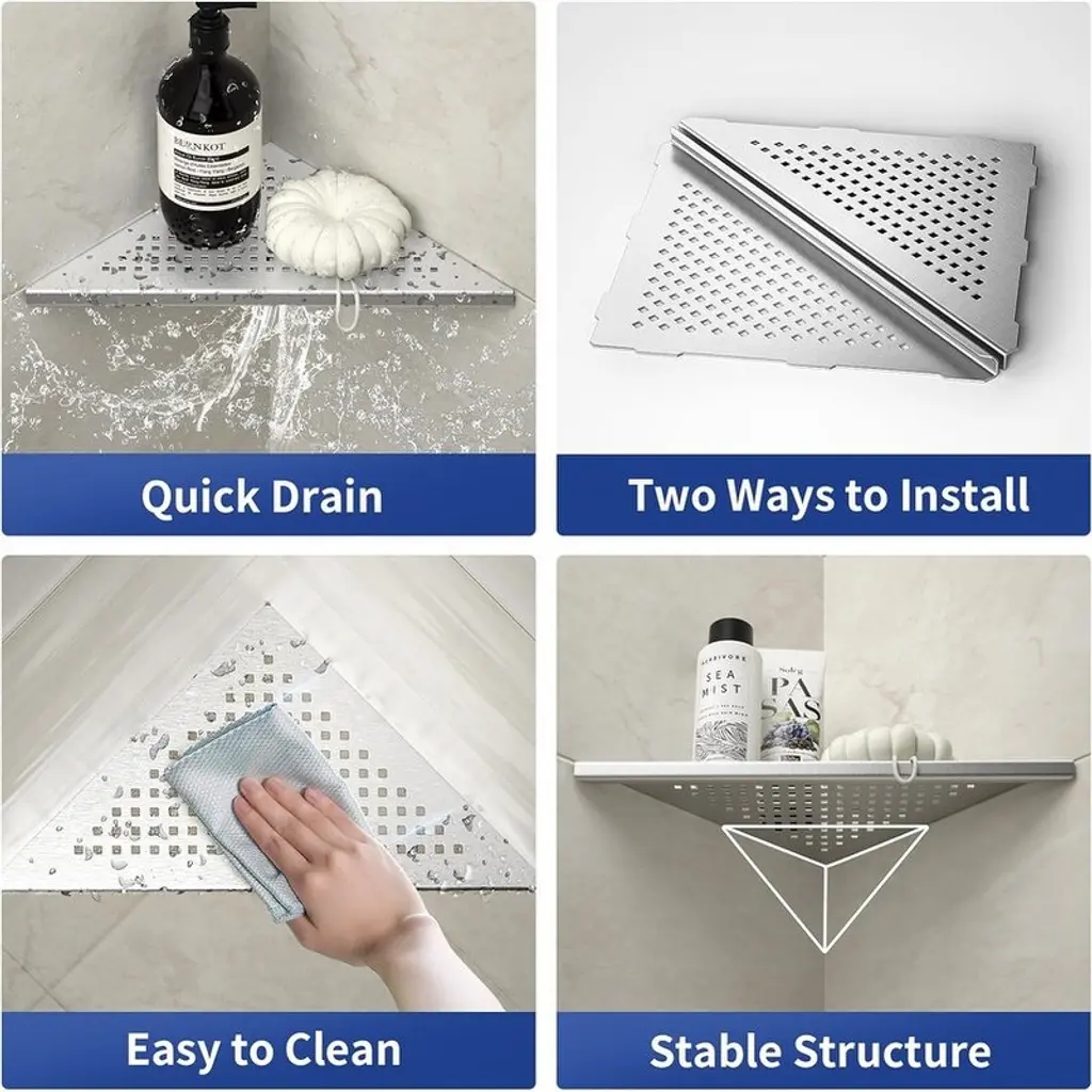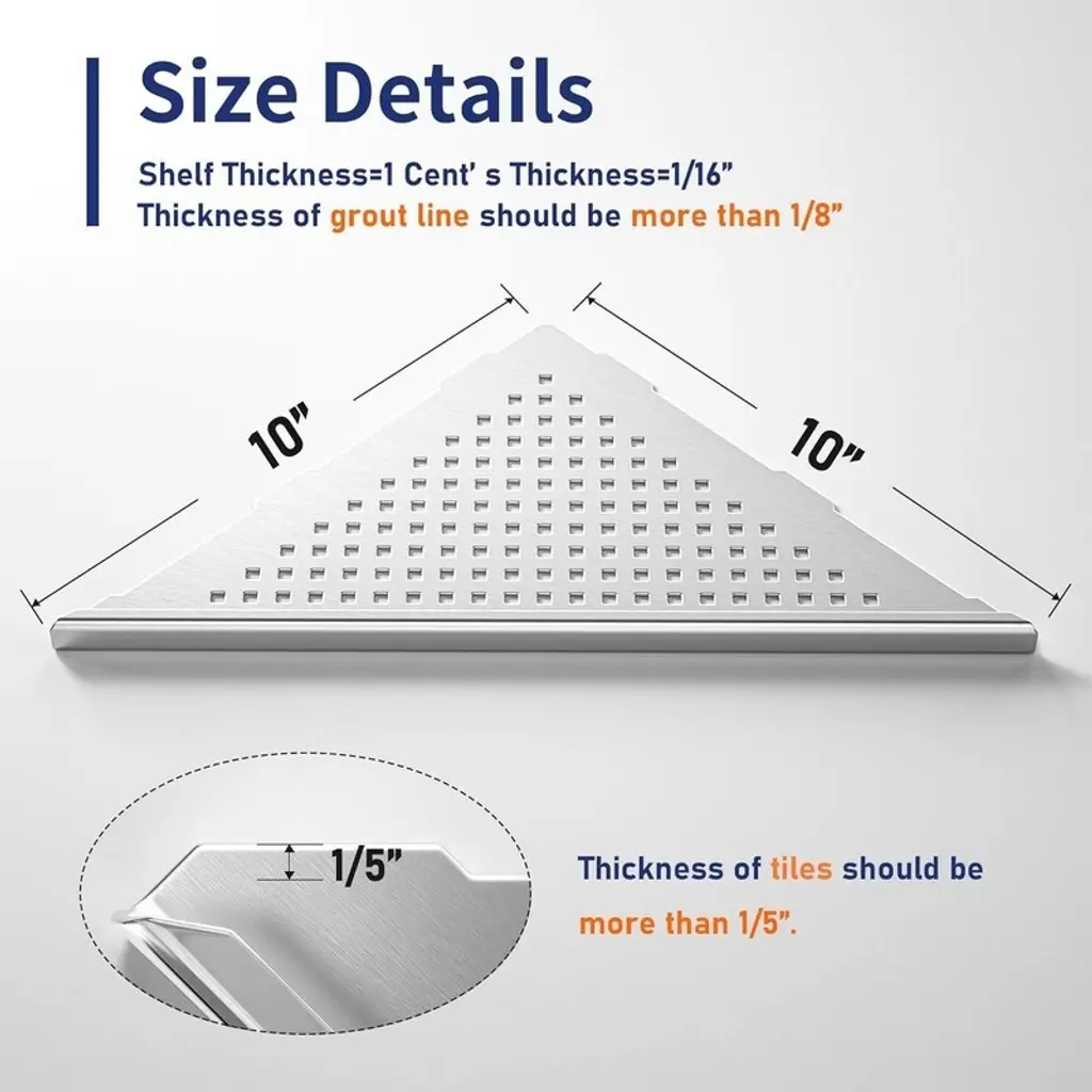Premium 304 Stainless Steel Construction - Made with heavy-duty 1.5mm thick ASTM 304 stainless steel for exceptional corrosion and rust resistance. Supports up to 15lbs per shelf with no drilling or adhesives required - designed specifically for tiled walls.Dual-Function Design - Features two installation options: Side A offers a sleek modern stainless surface, while Side B provides a protective rail to prevent items from falling. Easily switch between styles to match your decor needs.Space-Saving Corner Solution - Perfectly designed for 90° corners to maximize unused space in bathrooms and kitchens. Ideal for organizing toiletries, cosmetics, or kitchen essentials while maintaining a clean, modern aesthetic.Smart Drainage System - Integrated drainage slots prevent water pooling, keeping items dry and clean. Multi-functional design doubles as a convenient footrest for shaving. Compatible with other shower accessories.Easy Maintenance & Installation - Requires only periodic cleaning with neutral agents. Includes detailed sizing guidance and dedicated customer support for hassle-free setup and use.